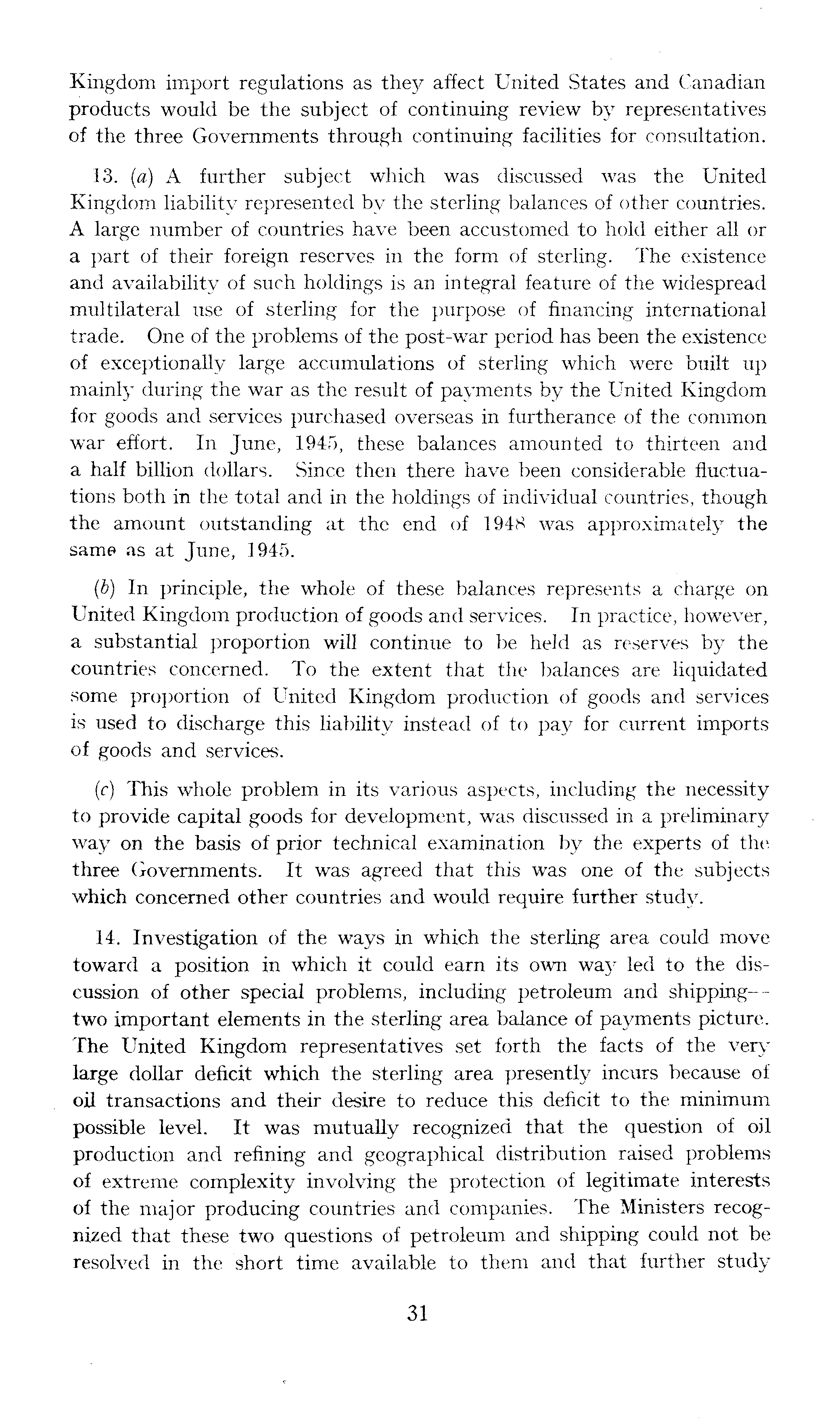 Kingdom import regulations as they affect United States and Canadian products would be the subject of continuing review by representatives of the three Governments through continuing facilities for consultation. 13. (a) A further subject which was discussed was the United Kingdom liability represented by the sterling balances of other countries. A large number of countries have been accustomed to hold either all or a part of their foreign reserves in the form of sterling. The existence and availability of such holdings is an integral feature of the widespread multilateral use of sterling for the purpose of financing international trade. One of the problems of the post-war period has been the existence of exceptionally large accumulations of sterling which were built up mainly during the war as the result of payments by the United Kingdom for goods and services purchased overseas in furtherance of the common war effort. In June, 1945, these balances amounted to thirteen and a half billion dollars. Since then there have been considerable fluctuations both in the total and in the holdings of individual countries, though the amount outstanding at the end of 1948 was approximately the same as at June, 1945. (b) In principle, the whole of these balances represents a charge on United Kingdom production of goods and services. In practice, however, a substantial proportion will continue to be held as reserves by the countries concerned. To the extent that the balances are liquidated some proportion of United Kingdom production of goods and services is used to discharge this liability instead of to pay for current imports of goods and services. (c) This whole problem in its various aspects, including the necessity to provide capital goods for development, was discussed in a preliminary way on the basis of prior technical examination by the experts of the three Governments. It was agreed that this was one of the subjects which concerned other countries and would require further study. 14. Investigation of the ways in which the sterling area could move toward a position in which it could earn its own way led to the discussion of other special problems, including petroleum and shipping—two important elements in the sterling area balance of payments picture. The United Kingdom representatives set forth the facts of the very large dollar deficit which the sterling area presently incurs because of oil transactions and their desire to reduce this deficit to the minimum possible level. It was mutually recognized that the question of oil production and refining and geographical distribution raised problems of extreme complexity involving the protection of legitimate interests of the major producing countries and companies. The Ministers recognized that these two questions of petroleum and shipping could not be resolved in the short time available to them and that further study