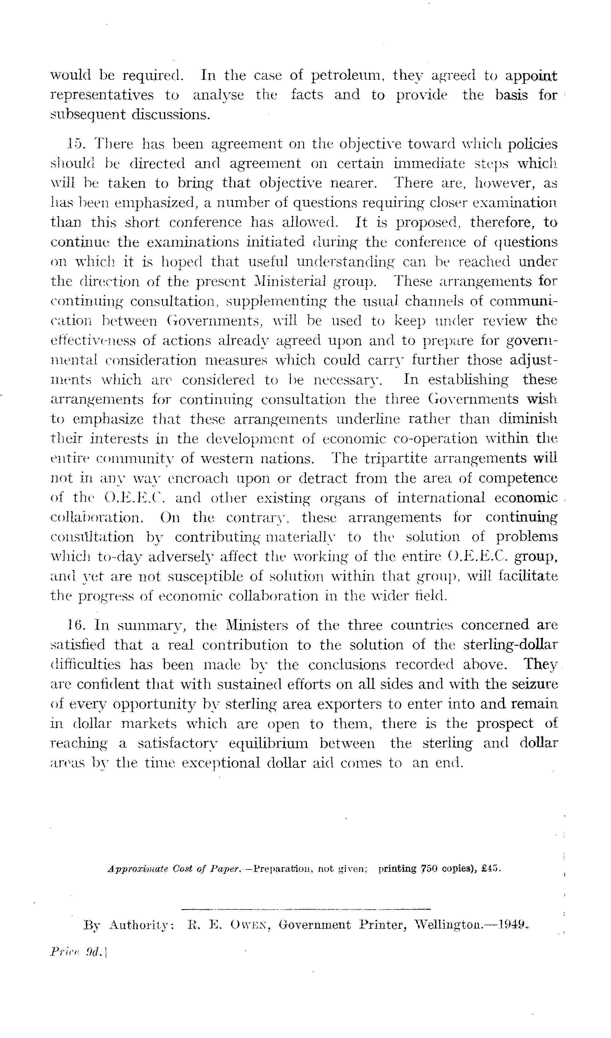 would be required. In the case of petroleum, they agreed to appoint representatives to analyse the facts and to provide the basis for subsequent discussions. 15. There has been agreement on the objective toward which policies should be directed and agreement on certain immediate steps which will be taken to bring that objective nearer. There are, however, as has been emphasized, a number of questions requiring closer examination than this short conference has allowed. It is proposed, therefore, to continue the examinations initiated during the conference of questions on which it is hoped that useful understanding can be reached under the direction of the present Ministerial group. These arrangements for continuing consultation, supplementing the usual channels of communication between Governments, will be used to keep under review the effectiveness of actions already agreed upon and to prepare for governmental consideration measures which could carry further those adjustments which are considered to be necessary. In establishing these arrangements for continuing consultation the three Governments wish to emphasize that these arrangements underline rather than diminish their interests in the development of economic co-operation within the entire community of western nations. The tripartite arrangements will not in any way encroach upon or detract from the area of competence of the O.E.E.C. and other existing organs of international economic collaboration. On the contrary, these arrangements for continuing consultation by contributing materially to the solution of problems which to-day adversely affect the working of the entire O.E.E.C. group, and yet are not susceptible of solution within that group, will facilitate the progress of economic collaboration in the wider field. 16. In summary, the Ministers of the three countries concerned are satisfied that a real contribution to the solution of the sterling-dollar difficulties has been made by the conclusions recorded above. They are confident that with sustained efforts on all sides and with the seizure of every opportunity by sterling area exporters to enter into and remain in dollar markets which are open to them, there is the prospect of reaching a satisfactory equilibrium between the sterling and dollar areas by the time exceptional dollar aid comes to an end.