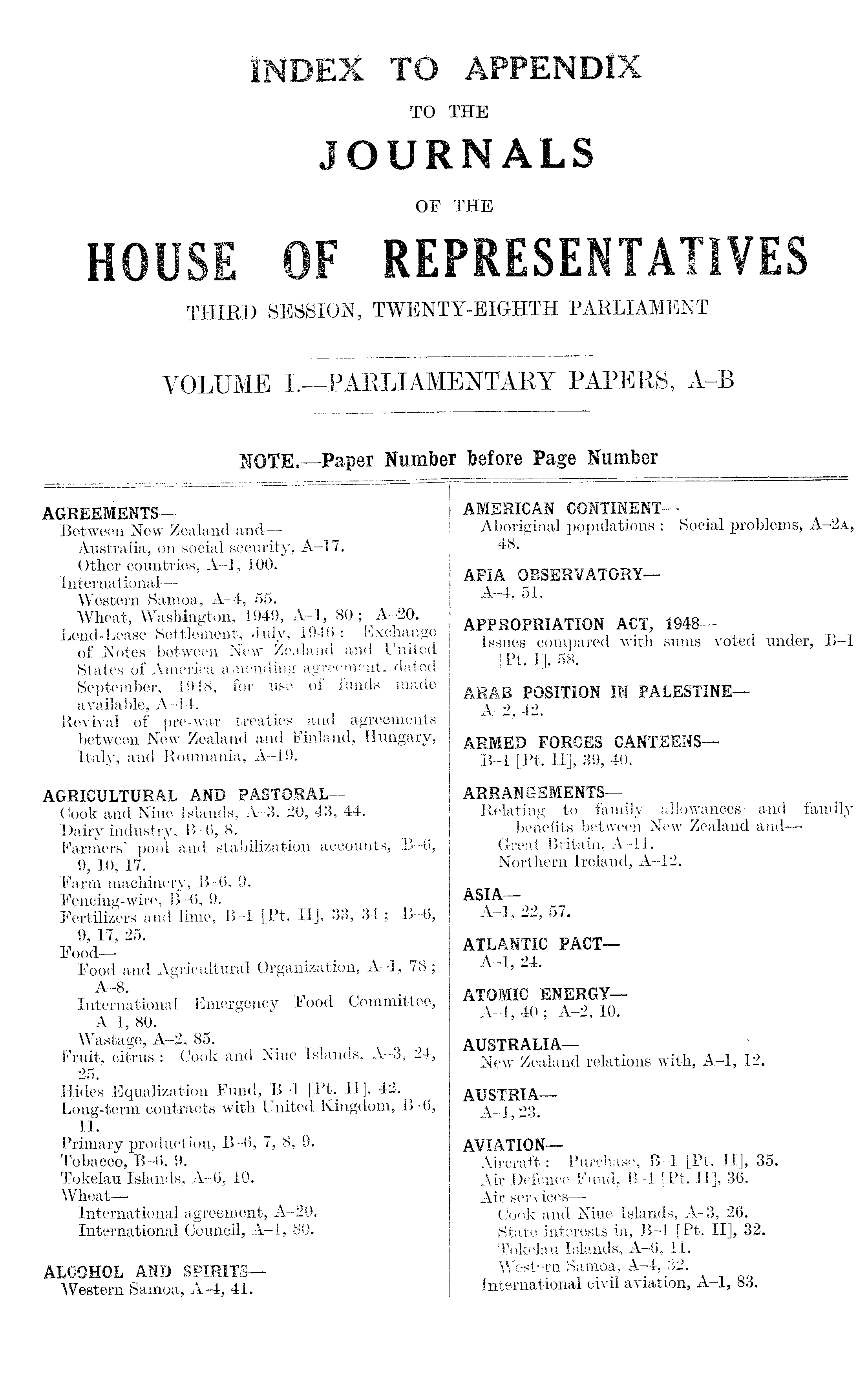 AMERICAN CONTINENT— Aboriginal populations : Social problems, A-2a, 48. APIA OBSERVATORY— A-4, 51. APPROPRIATION ACT, 1948 Issues compared with sums voted under, B-l [Pt. I], 58. ARAB POSITION IN PALESTINE— A-2, 42, ARMED FORCES CANTEENS— B-l [Pt. ll], 39, 40. ARRANGEMENTS— Relating to family allowances- and family benefits between New Zealand and— Great Britain, A-11. Northern Ireland, A-12. ASIA— A-l, 22, 57. ATLANTIC PACT— A-l, 24. ATOMIC ENERGY— A-l, 40 ; A-2, 10. AUSTRALIA— New Zealand relations with, A-l, 12. AUSTRIA— A-l, 23. AVIATION— Aircraft : Purchase, B-l [Pt, ll], 35. Air Defence Fund, B-l [Pt. ll], 36. Air services— Cook and Niue Islands, A-3, 26. State interests in, B-l [Pt. ll], 32. Tokelau Islands, A-6, 11. Western Samoa, A-4, 32. International civil aviation, A-l, 83.