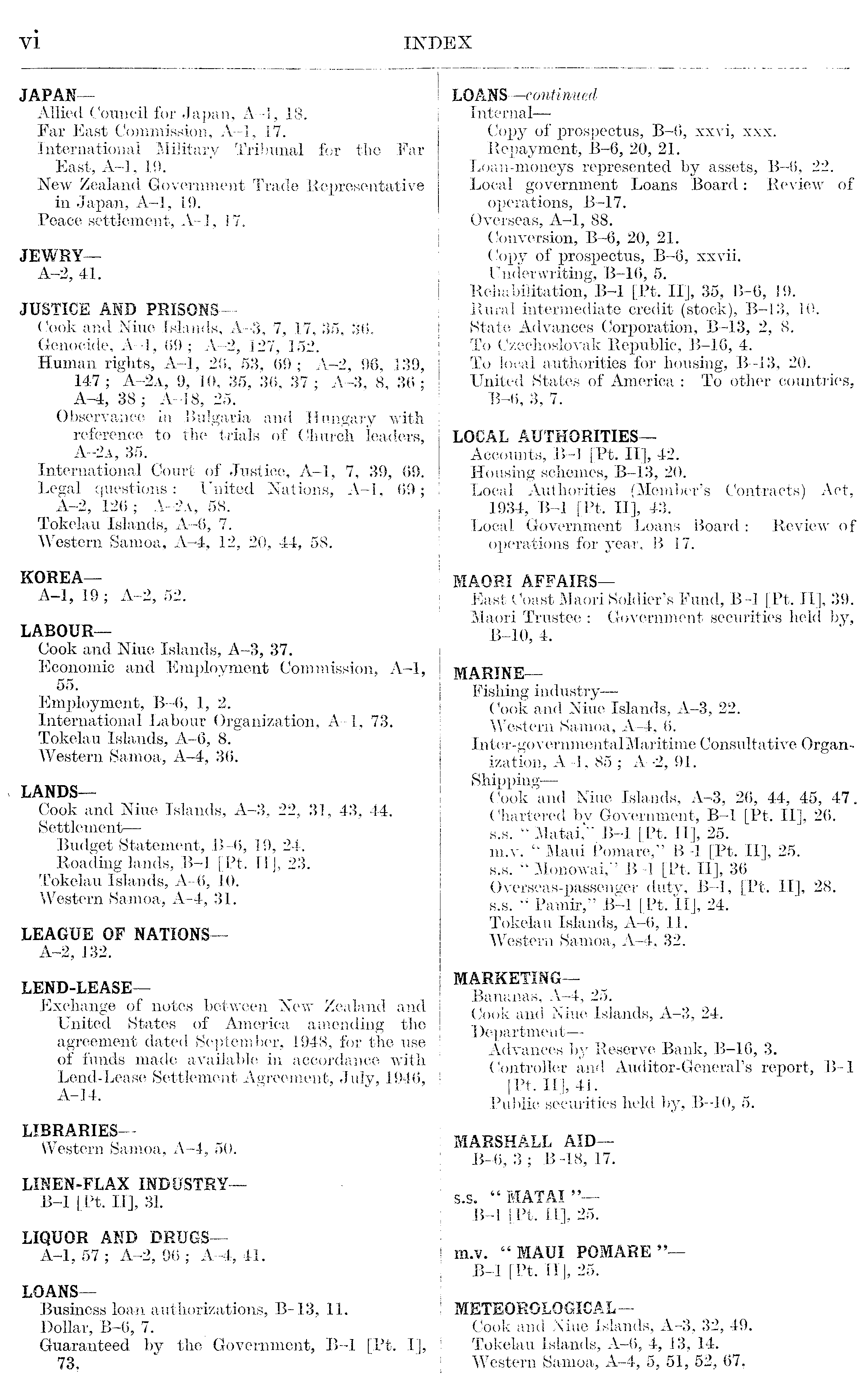 LOANS — continu ed Internal — Copy of prospectus, B-6, xxvi, xxx. Repayment, B-6, 20, 21. Loan-moneys represented by assets, B-8, 22. Local government Loans Board: Review of operations, B-17. Overseas, A-l, 88. Conversion, B-6, 20, 21. Copy of prospectus, B-6, xxvii. Underwriting, B-16, 5. Rehabilitation, B-l [Pt. ll], 35, B-6, 19. Rural intermediate credit (stock), B-l 3, 10. State Advances Corporation, B-l 3, 2, 8. To Czechoslovak Republic, B-16, 4. To local authorities for housing, B-13, 20. United States of America : To other countries, B-6, 3, 7. LOCAL AUTHORITIES— Accounts, B-l [Pt. ll], 42. Housing schemes, B-13, 20. Local Authorities (Member's Contracts) Act, 1934, B-l [Pt. ll], 43. Local Government Loans Board : Review of operations for year, B-17. MAORI AFFAIRS— East Coast Maori Soldier's Fund, B-l [Pt. ll], 39. Maori Trustee : Government securities held by, B-10, 4. MARINE— Fishing industry— Cook and Niue Islands, A-3, 22. Western Samoa, A-4, 6. Inter-governmental Maritime Consultative Organization, A-l, 85 ; A-2, 91. Shipping— Cook and Niue Islands, A-3, 26, 44, 45, 47. Chartered bv Government, B-l [Pt. ll], 26. s.s. " Matai," B-l [Pt. ll], 25. m.v. " Maui Pomare," B-l [Pt. ll], 25. s.s. " Monowai," B-l [Pt. ll], 36 Overseas-passenger duty, B-l, [Pt. ll], 28. s.s. " Pamir," B-l [Pt. ll], 24. Tokelau Islands, A-6, 11. Western Samoa, A-4, 32. MARKETING— Bananas, A-4, 25. Cook and Niue Islands, A-3, 24. Department— Advances hj Reserve Bank, B-16, 3. Controller and Auditor-General's report, B-l [Pt, ll], 41. Public securities held by, B-10, 5. MARSHALL AID— B-6, 3 ; B-1 8, 17. s.s. " MATAI " B-l [Pt. ll], 25. m.v. "MAUI POMARE"— B-l [Pt. ll], 25. METEOROLOGICAL— Cook and Niue Islands, A-3, 32, 49. Tokelau Islands, A-6, 4, 13, 14. Western Samoa, A-4, 5, 51, 52, 67,