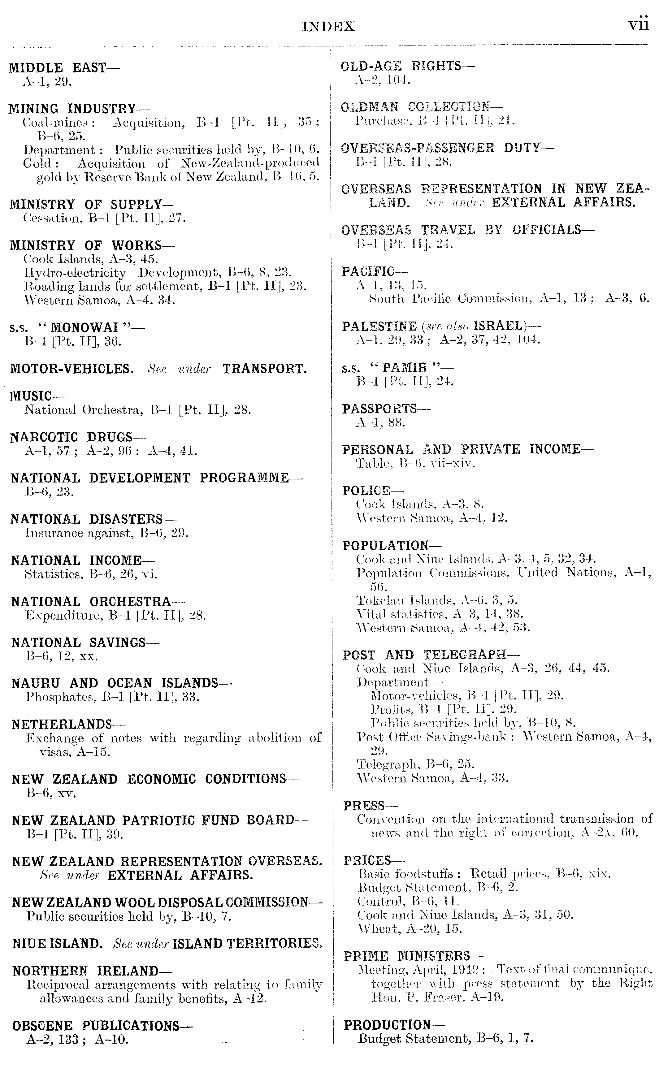OLD-AGE RIGHTS— A-2, 104. OLDMAN COLLECTION— Purchase, B-l [Pt. ll], 21. OVERSEAS-PASSENGER DUTY— B-l [Pt. ll], 28. OVERSEAS REPRESENTATION IN NEW ZEALAND. See under EXTERNAL AFFAIRS. OVERSEAS TRAVEL BY OFFICIALS— B-l [Pt. ll], 24. PACIFIC— A-l, 13, 15. South Pacific Commission, A-l, 13 ; A-3, 6. PALESTINE (see also ISRAEL)— A-l, 29, 33 ; A-2, 37, 42, 104. S.S. "PAMIR"— B-l [Pt. ll], 24. PASSPORTS— A-l, 88. PERSONAL AND PRIVATE INCOME— Table, B-6, vii-xiv. POLICE— Cook Islands, A-3, 8. Western Samoa, A-4, 12. POPULATION— Cook and Niue Islands, A-3, 4, 5, 32, 34. Population Commissions, United Nations, A-l, 56. Tokelau Islands, A-6, 3, 5. Vital statistics, A-3, 14, 38. Western Samoa, A-4, 42, 53. POST AND TELEGRAPH— Cook and Niue Islands, A-3, 26, 44, 45. Department-Motor-vehicles, B-l [Pt. ll], 29. Profits, B-l [Pt. ll], 29. Public securities held by, B-10, 8. Post Office Savings-bank : Western Samoa, A-4, 29. Telegraph, B-6, 25. Western Samoa, A-4, 33. PRESS— Convention on the international transmission of news and the right of correction, A-2a, 60. PRICES— Basic foodstuffs : Retail prices, B-6, xix. Budget Statement, B-6, 2. Control, B-6, 11. Cook and Niue Islands, A-3, 31, 50. Wheat, A-20, 15. PRIME MINISTERS— Meeting, April, 1949 : • Text of final communique, together with press statement by the Right Hon. P. Fraser, A-19. PRODUCTION— Budget Statement, B-6, 1, 7.