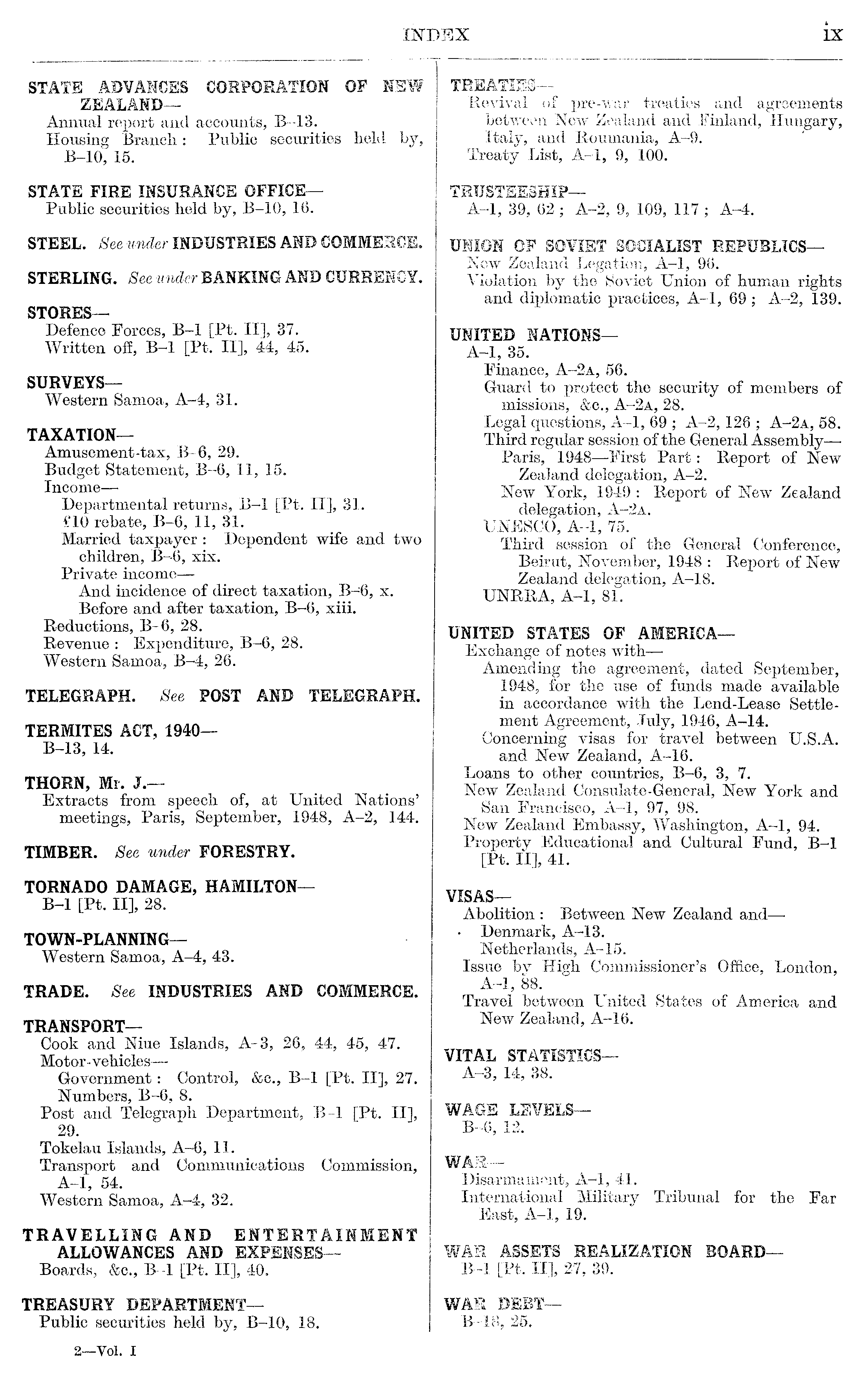 STATE ADVANCES CORPORATION OF NEW ZEALAND— Annual report and accounts, B-13. Housing Branch: Public securities held by, B-10, 15. STATE FIRE INSURANCE OFFICE— Public securities held by, B-10, 16. STEEL. See under INDUSTRIES AND COMMERCE. STERLING. See under BANKING AND CURRENCY. STORES— Defence Forces, B-l [Pt. ll], 37. Written off, B-l [Pt. ll], 44, 45. SURVEYS— Western Samoa, A-4, 31. TAXATION— Amusement-tax, B-6, 29. Budget Statement, B-6, 11, 15. Income — Departmental returns, B-l [Pt. ll], 31. £lO rebate, B-6, 11, 31. Married taxpayer : Dependent wife and two children, B-6, xix. Private income— And incidence of direct taxation, B-6, x. Before and after taxation, B-6, xiii. Reductions, B-6, 28. Revenue : Expenditure, B-6, 28. Western Samoa, B-4, 26. TELEGRAPH. See POST AND TELEGRAPH. TERMITES ACT, 1940 B-13, 14. THORN, Mr. J.— Extracts from speech of, at United Nations' meetings, Paris, September, 1948, A-2, 144. TIMBER. See under FORESTRY. TORNADO DAMAGE, HAMILTON— B-l [Pt. ll], 28. TOWN-PLANNING— Western Samoa, A-4, 43. TRADE. See INDUSTRIES AND COMMERCE. TRANSPORT— Cook and Niue Islands, A-3, 26, 44, 45, 47. Motor-vehicles — Government: Control, &c, B-l [Pt. ll], 27. Numbers, B-6, 8. Post and Telegraph Department, B-l [Pt. ll], 29. Tokelau Islands, A-6, 11. Transport and Communications Commission, A-l, 54. Western Samoa, A-4, 32. TRAVELLING AND ENTERTAINMENT ALLOWANCES AND EXPENSES— Boards, &c, B-l [Pt. ll], 40. TREASURY DEPARTMENT— Public securities held by, B-10, 18.
