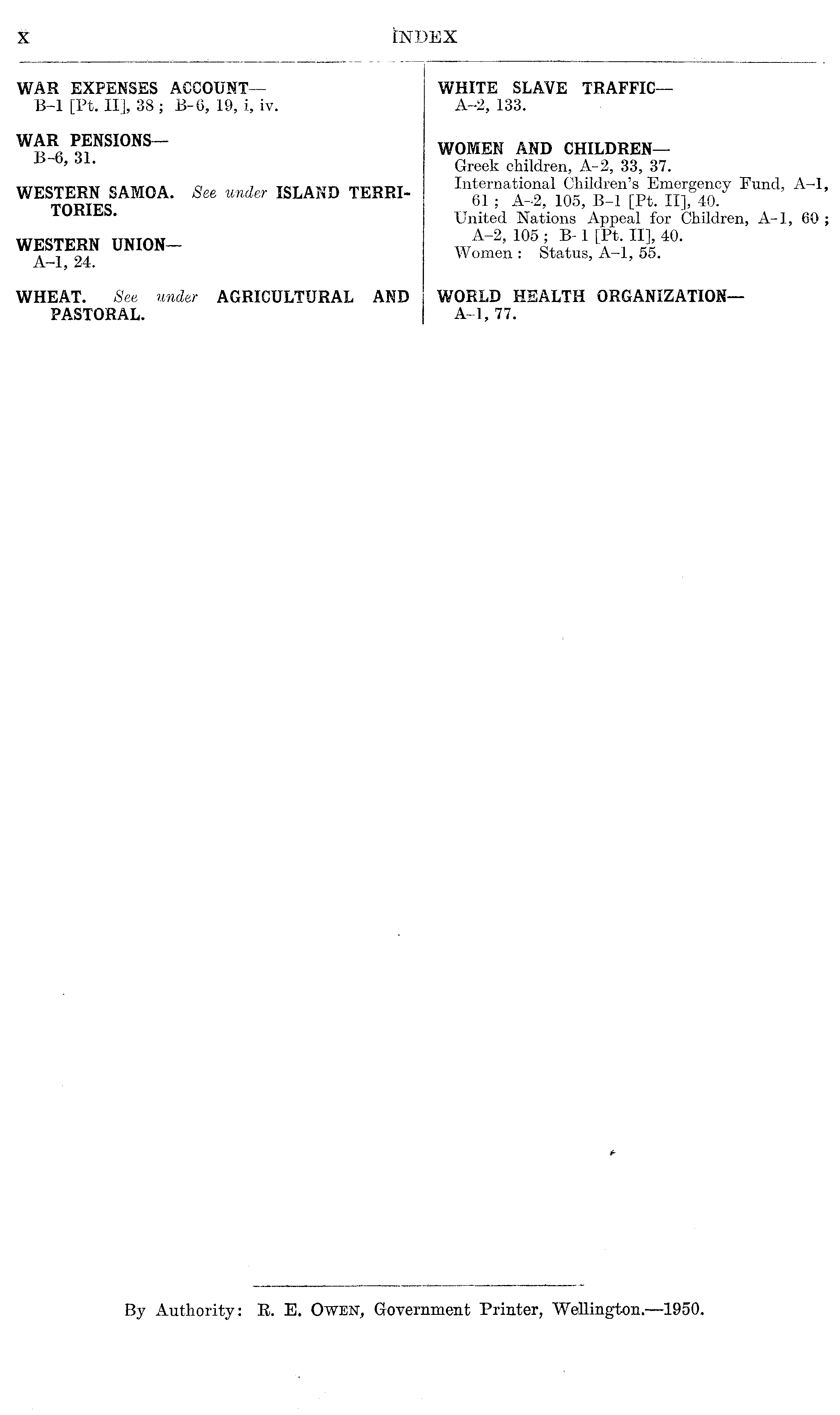 WHITE SLAVE TRAFFIC— A-2, 133. WOMEN AND CHILDREN— Greek children, A-2, 33, 37. International Children's Emergency Fund, A-l, 61 ; A-2, 105, B-l [Pt. ll], 40. United Nations Appeal for Children, A-l, 60 ; A-2, 105 ; B-1 [Pt. ll], 40. Women : Status, A-l, 55. WORLD HEALTH ORGANIZATION— A-l, 77.