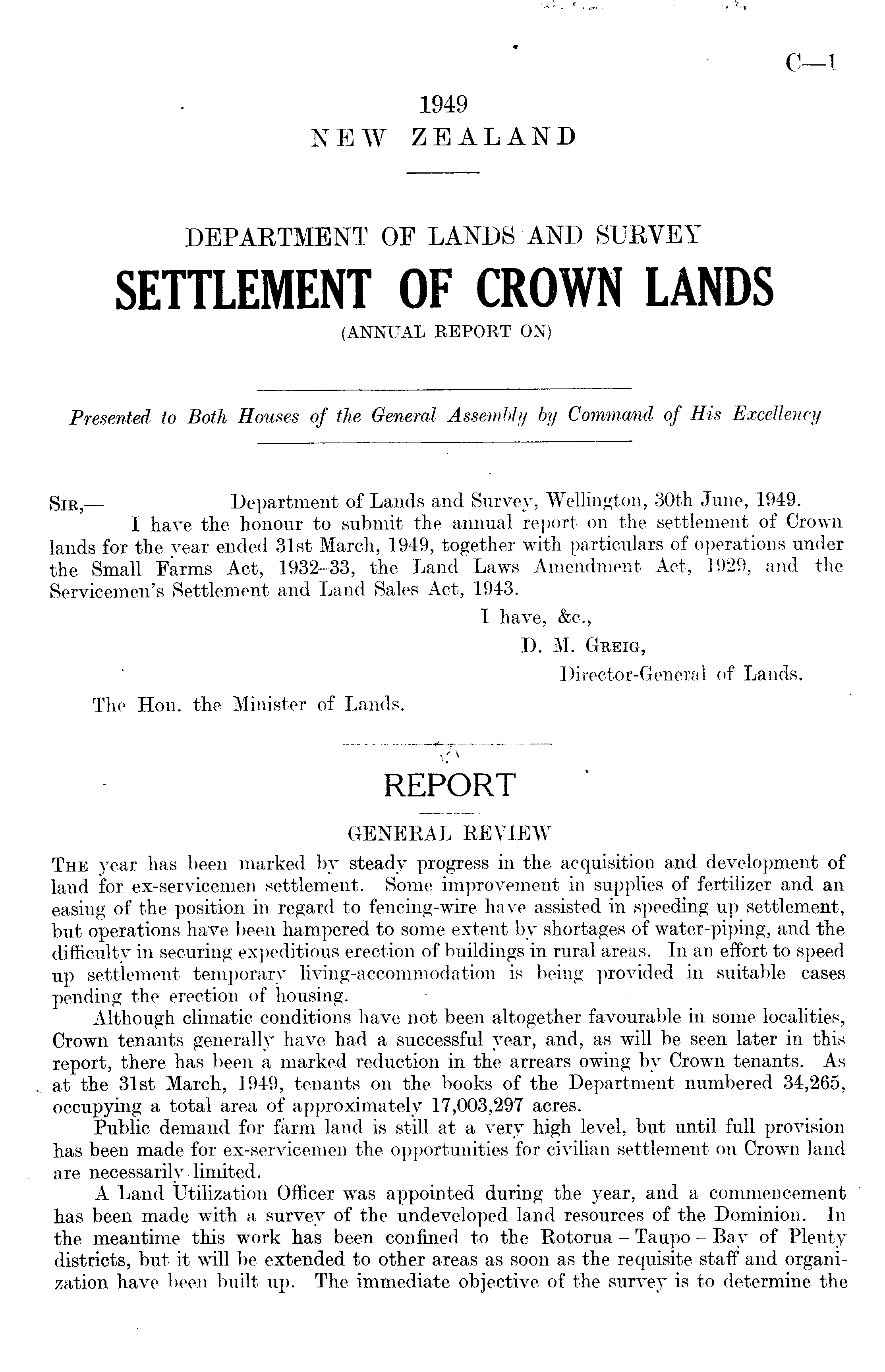 Sir _ Department of Lands and Survey, Wellington, 30th June, 1949. I have the honour to submit the annual report on the settlement of Crown lands for the year ended 31st March, 1949, together with particulars of operations under the Small Farms Act, 1932-33, the Land Laws Amendment Act, 1929, and the Servicemen's Settlement and Land Sales Act, 1943. I have, &c., D. M. Greig, Director-General of Lands. The Hon. the Minister of Lands.