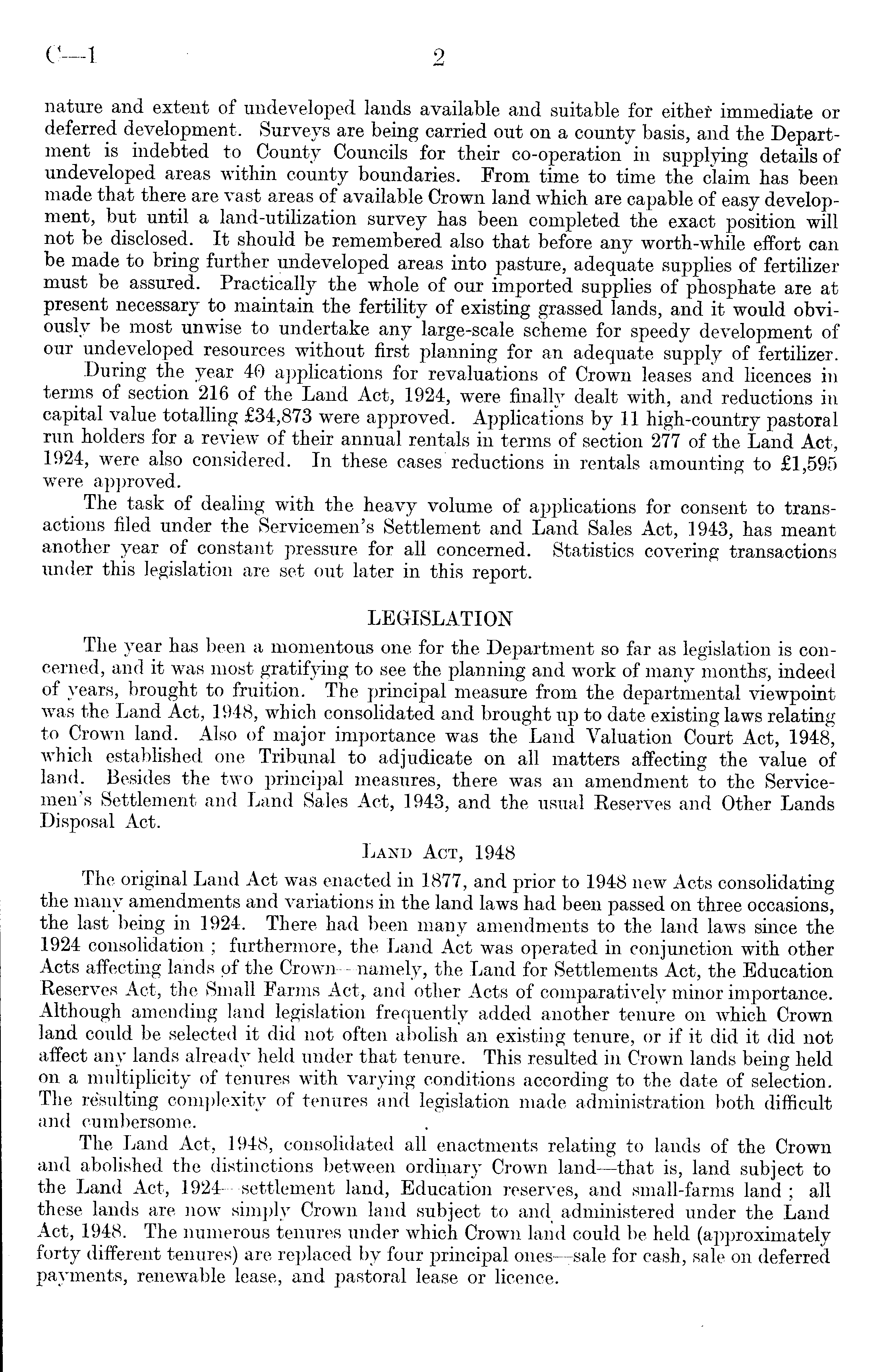 nature and extent of undeveloped lands available and suitable for either immediate or deferred development. Surveys are being carried out on a county basis, and the Department is indebted to County Councils for their co-operation in supplying details of undeveloped areas within county boundaries. From time to time the claim has been made that there are vast areas of available Crown land which are capable of easy development, but until a land-utilization survey has been completed the exact position will not be disclosed. It should be remembered also that before any worth-while effort can be made to bring further undeveloped areas into pasture, adequate supplies of fertilizer must be assured. Practically the whole of our imported supplies of phosphate are at present necessary to maintain the fertility of existing grassed lands, and it would obviously be most unwise to undertake any large-scale scheme for speedy development of our undeveloped resources without first planning for an adequate supply of fertilizer. During the year 40 applications for revaluations of Crown leases and licences in terms of section 216 of the Land Act, 1924, were finally dealt with, and reductions in capital value totalling £34,873 were approved. Applications by 11 high-country pastoral run holders for a review of their annual rentals in terms of section 277 of the Land Act, 1924, were also considered. In these cases reductions in rentals amounting to £1,595 were approved. The task of dealing with the heavy volume of applications for consent to transactions filed under the Servicemen's Settlement and Land Sales Act, 1943, has meant another year of constant pressure for all concerned. Statistics covering transactions under this legislation are set out later in this report. LEGISLATION The year has been a momentous one for the Department so far as legislation is concerned, and it was most gratifying to see the planning and work of many months, indeed of years, brought to fruition. The principal measure from the departmental viewpoint was the Land Act, 1948, which consolidated and brought up to date existing laws relating to Crown land. Also of major importance was the Land Valuation Court Act, 1948, which established one Tribunal to adjudicate on all matters affecting the value of land. Besides the two principal measures, there was an amendment to the Servicemen's Settlement and Land Sales Act, 1943, and the usual Reserves and Other Lands Disposal Act. Land Act, 1948 The original Land Act was enacted in 1877, and prior to 1948 new Acts consolidating the many amendments and variations in the land laws had been passed on three occasions, the last being in 1924. There had been many amendments to the land laws since the 1924 consolidation ; furthermore, the Land Act was operated in conjunction with other Acts affecting lands of the Crown—namely, the Land for Settlements Act, the Education Reserves Act, the Small Farms Act,, and other Acts of comparatively minor importance. Although amending land legislation frequently added another tenure on which Crown land could be selected it did not often abolish an existing tenure, or if it did it did not affect any lands already held under that tenure. This resulted in Crown lands being held on a multiplicity of tenures with varying conditions according to the date of selection. The resulting complexity of tenures and legislation made administration both difficult and cumbersome. The Land Act, 1948, consolidated all enactments relating to lands of the Crown and abolished the distinctions between ordinary Crown land —that is, land subject to the Land Act, 1924—settlement land, Education reserves, and small-farms land ; all these lands are now simply Crown land subject to and administered under the Land Act, 1948. The numerous tenures under which Crown land could be held (approximately forty different tenures) are replaced by four principal ones—sale for cash, sale on deferred payments, renewable lease, and pastoral lease or licence.
