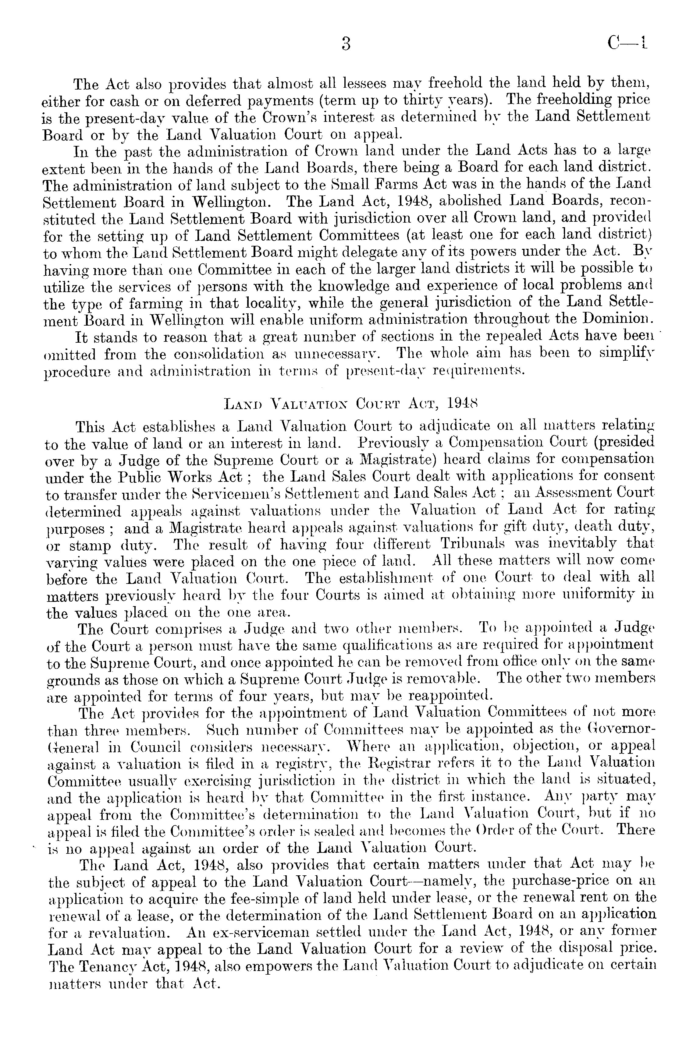 The Act also provides that almost all lessees may freehold the land held by them, either for cash or on deferred payments (term up to thirty years). The freeholding price is the present-day value of the Crown's interest as determined by the Land Settlement Board or by the Land Valuation Court on appeal. In the past the administration of Crown land under the Land Acts has to a large extent been in the hands of the Land Boards, there being a Board for each land district. The administration of land subject to the Small Farms Act was in the hands of the Land Settlement Board in Wellington. The Land Act, 1948, abolished Land Boards, reconstituted the Land Settlement Board with jurisdiction over all Crown land, and provided for the setting up of Land Settlement Committees (at least one for each land district) to whom the Land Settlement Board might delegate any of its powers under the Act. By having more than one Committee in each of the larger land districts it will be possible to utilize the services of persons with the knowledge and experience of local problems and the type of farming in that locality, while the general jurisdiction of the Land Settlement Board in Wellington will enable uniform administration throughout the Dominion. It stands to reason that a great number of sections in the repealed Acts have been omitted from the consolidation as unnecessary. The whole aim has been to simplify procedure and administration in terms of present-day requirements. Land Valuation Court Act, 1948 This Act establishes a Land Valuation Court to adjudicate on all matters relating to the value of land or an interest in land. Previously a Compensation Court (presided over by a Judge of the Supreme Court or a Magistrate) heard claims for compensation under the Public Works Act; the Land Sales Court dealt with applications for consent to transfer under the Servicemen's Settlement and Land Sales Act; an Assessment Court determined appeals against valuations under the Valuation of Land Act for rating purposes ; and a Magistrate heard appeals against valuations for gift duty, death duty, or stamp duty. The result of having four different Tribunals was inevitably that varying values were placed on the one piece of land. All these matters will now come before the Land Valuation Court. The establishment of one Court to deal with all matters previously heard by the four Courts is aimed at obtaining more uniformity in the values placed on the one area. The Court comprises a Judge and two other members. To be appointed a Judge of the Court a person must have the same qualifications as are required for appointment to the Supreme Court, and once appointed he can be removed from office only on the same grounds as those on which a Supreme Court Judge is removable. The other two members are appointed for terms of four years, but may be reappointed. The Act provides for the appointment of Land Valuation Committees of not more than three members. Such number of Committees may be appointed as the GovernorGeneral in Council considers necessary. Where an application, objection, or appeal against a valuation is filed in a registry, the Registrar refers it to the Land Valuation Com mitt, p.p. usually exercising jurisdiction in the district in which the land is situated, and the application is heard by that Committee in the first instance. Any party may appeal from the Committee's determination to the Land Valuation Court, but if 110 appeal is filed the Committee's order is sealed and becomes the Order of the Court. There is no appeal against an order of the Land Valuation Court. The Land Act, 1948, also provides that certain matters under that Act may be the subject of appeal to the Land Valuation Court —namely, the purchase-price on an application to acquire the fee-simple of land held under lease, or the renewal rent on the renewal of a lease, or the determination of the Land Settlement Board on an application for a revaluation. An ex-serviceman settled under the Land Act, 1948, or any former Land Act may appeal to the Land Valuation Court for a review of the disposal price. The Tenancy Act, 1948, also empowers the Land Valuation Court to adjudicate on certain matters under that Act.