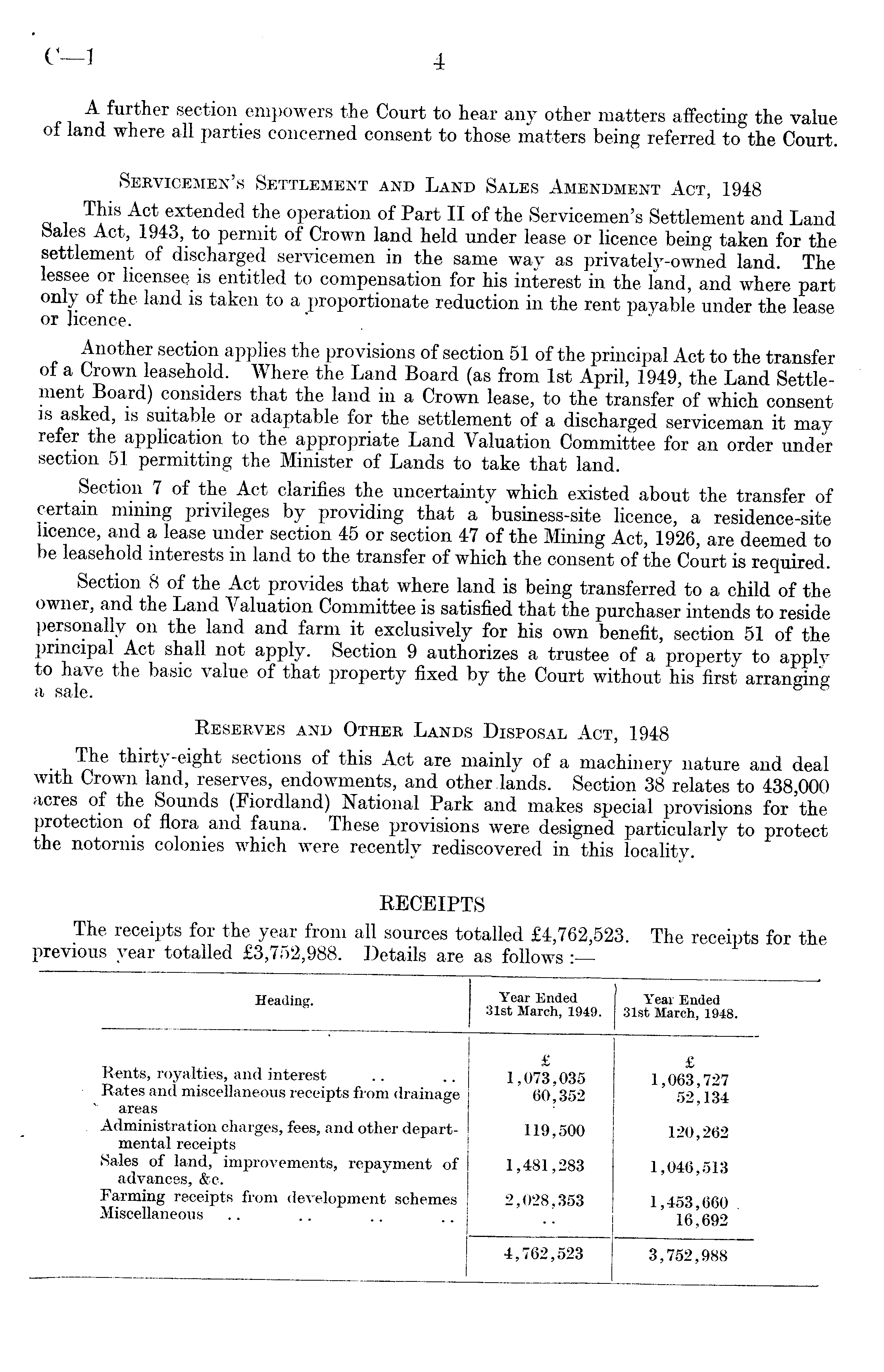 A further section empowers the Court to hear any other matters affecting the value o land where all parties concerned consent to those matters being referred to the Court. Servicemen's Settlement and Land Sales Amendment Act, 1948 This Act extended the operation of Part II of the Servicemen's Settlement and Land Sales Act, 1943, to permit of Crown land held under lease or licence being taken for the settlement of discharged servicemen in the same way as privately-owned land. The lessee or licensee is entitled to compensation for his interest in the land, and where part only of the land is taken to a proportionate reduction in the rent payable under the lease or licence. Another section applies the provisions of section 51 of the principal Act to the transfer ot a Crown leasehold. Where the Land Board (as from Ist April, 1949, the Land Settlement Board) considers that the land in a Crown lease, to the transfer of which consent is asked, is suitable or adaptable for the settlement of a discharged serviceman it may refer the application to the appropriate Land Valuation Committee for an order under section 51 permitting the Minister of Lands to take that land. Section 7 of the Act clarifies the uncertainty which existed about the transfer of certain mining privileges by providing that a business-site licence, a residence-site licence, and a lease under section 45 or section 47 of the Mining Act, 1926, are deemed to be leasehold interests in land to the transfer of which the consent of the Court is required. Section 8 of the Act provides that where land is being transferred to a child of the owner, and the Land Valuation Committee is satisfied that the purchaser intends to reside personally on the land and farm it exclusively for his own benefit, section 51 of the principal Act shall not apply. Section 9 authorizes a trustee of a property to apply to have the basic value of that property fixed by the Court without his first arranging 53»16. Reserves and Other Lands Disposal Act, 1948 r^le thirty-eight sections of this Act are mainly of a machinery nature and deal with Crown land, reserves, endowments, and other lands. Section 38 relates to 438 000 acres of the Sounds (Fiordland) National Park and makes special provisions for'the protection of flora and fauna. These provisions were designed particularly to protect the notornis colonies which were recently rediscovered in this locality. RECEIPTS