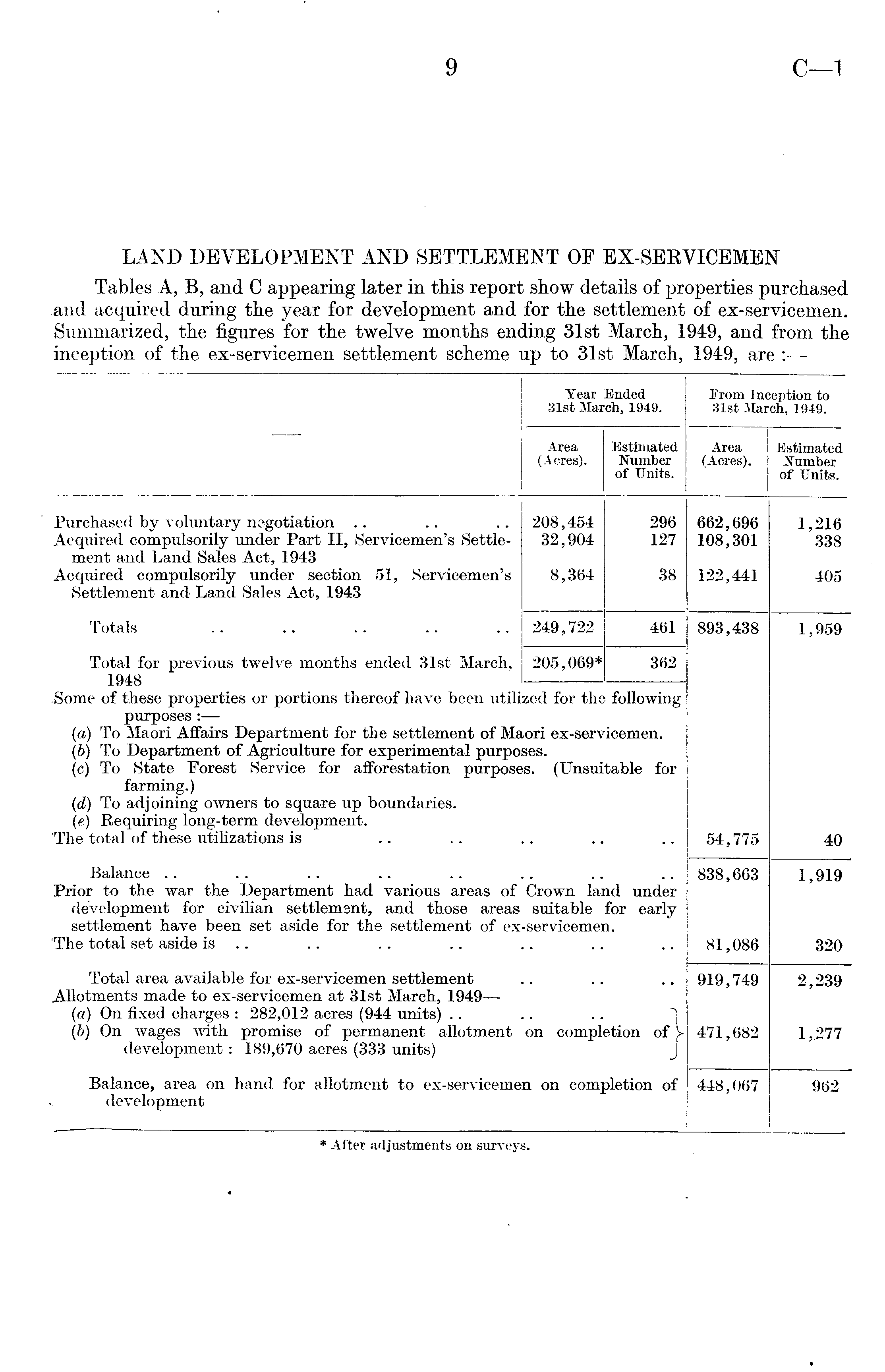 LAND DEVELOPMENT AND SETTLEMENT OF EX-SERVICEMEN Tables A, B, and C appearing later in this report show details of properties purchased .and acquired during the year for development and for the settlement of ex-servicemen. Summarized, the figures for the twelve months ending 31st March, 1949, and from the inception of the ex-servicemen settlement scheme up to 31st March, 1949, are :