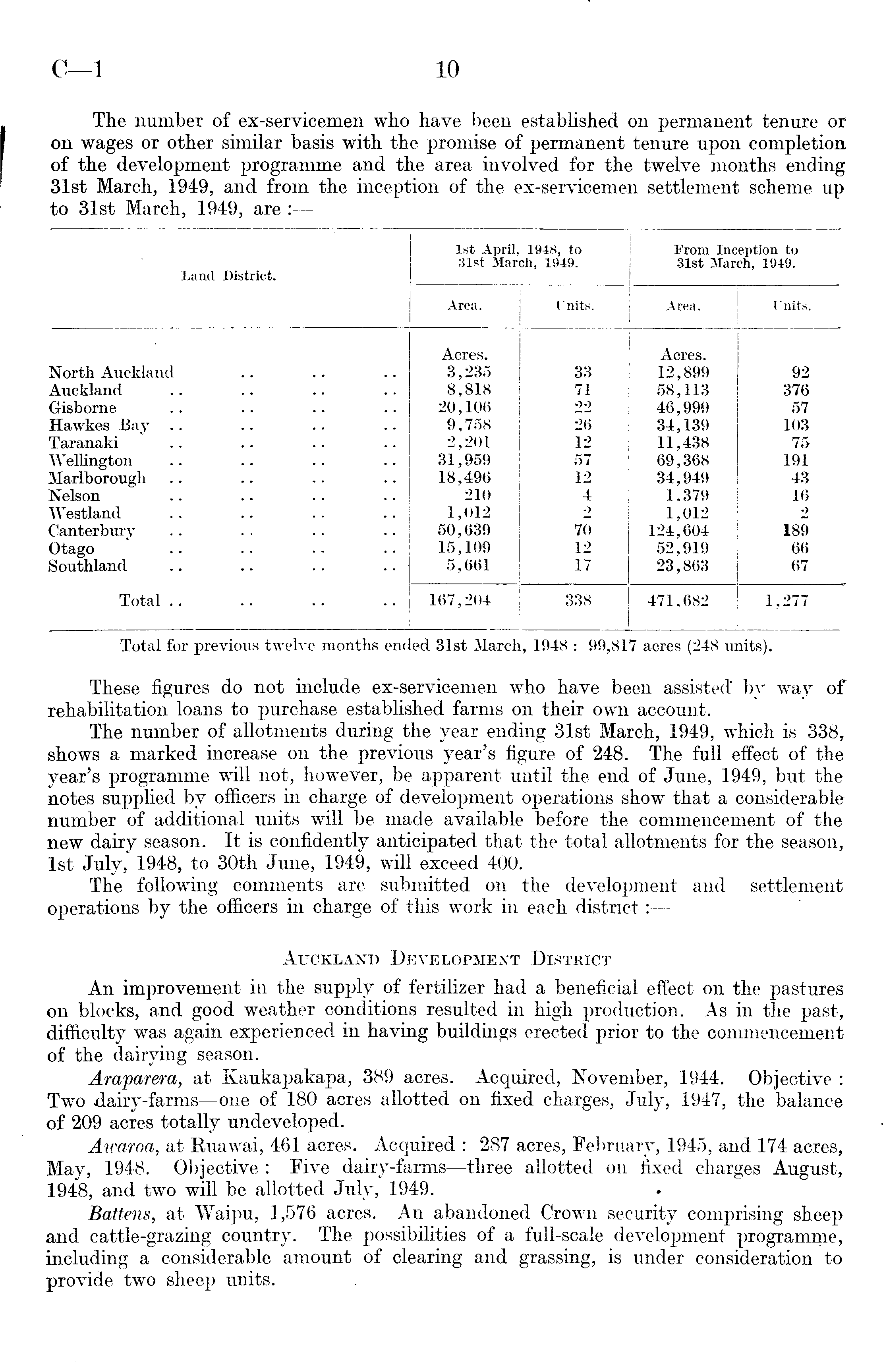 These figures do not include ex-servicemen who have been assisted' by way of rehabilitation loans to purchase established farms on their own account. The number of allotments during the year ending 31st March, 1949, which is 338 y shows a marked increase on the previous year's figure of 248. The full effect of the year's programme will not, however, be apparent until the end of June, 1949, but the notes supplied by officers in charge of development operations show that a considerable number of additional units will be made available before the commencement of the new dairy season. It is confidently anticipated that the total allotments for the season, Ist July, 1948, to 30th June, 1949, will exceed 400. The following comments are submitted on the development and settlement operations by the officers in charge of this work in each district:— Auckland Development District An improvement in the supply of fertilizer had a beneficial effect on the pastures on blocks, and good weather conditions resulted in high production. As in the past, difficulty was again experienced in having buildings erected prior to the commencement of the dairying season. Araparera, at Kaukapakapa, 389 acres. Acquired, November, 1944. Objective : Two dairy-farms—one of 180 acres allotted on fixed charges, July, 1947, the balance of 209 acres totally undeveloped. Awaroa, at Ruawai, 461 acres. Acquired : 287 acres, February, 1945, and 174 acres, May, 1948. Objective : Five dairy-farms—three allotted on fixed charges August, 1948, and two will be allotted July, 1949. Battens, at Waipu, 1,576 acres. An abandoned Crown security comprising sheep and cattle-grazing country. The possibilities of a full-scale development programme, including a considerable amount of clearing and grassing, is under consideration to provide two sheep units.