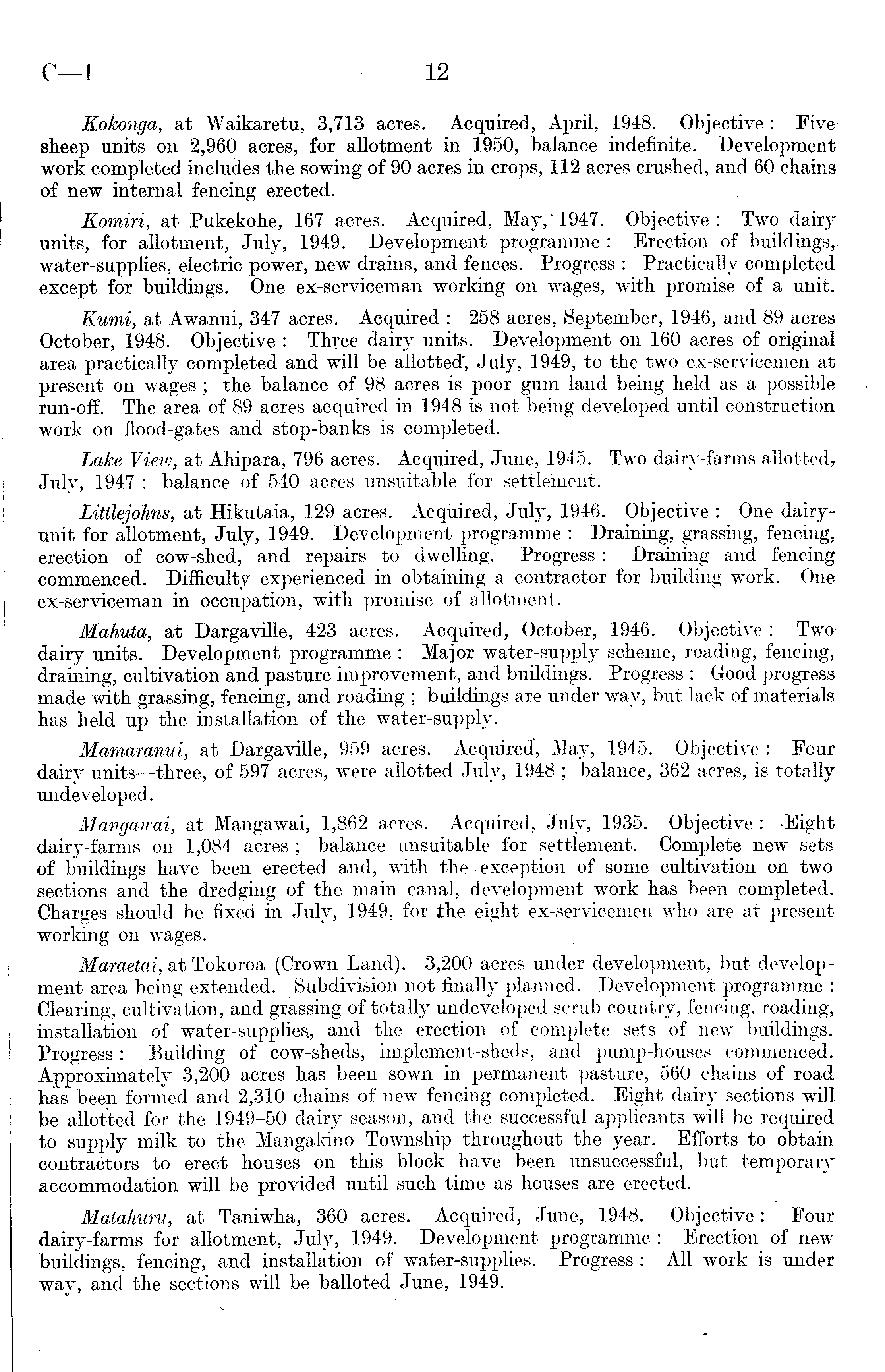 Kokonga, at Waikaretu, 3,713 acres. Acquired, April, 1948. Objective : Five sheep units on 2,960 acres, for allotment in 1950, balance indefinite. Development work completed includes the sowing of 90 acres in crops, 112 acres crushed, and 60 chains of new internal fencing erected. Komiri, at Pukekohe, 167 acres. Acquired, May,'l947. Objective: Two dairy units, for allotment, July, 1949. Development programme : Erection of buildings,, water-supplies, electric power, new drains, and fences. Progress : Practically completed except for buildings. One ex-serviceman working on wages, with promise of a unit. Kumi, at Awanui, 347 acres. Acquired : 258 acres, September, 1946, and 89 acres October, 1948. Objective : Three dairy units. Development on 160 acres of original area practically completed and will be allotted' July, 1949, to the two ex-servicemen at present on wages ; the balance of 98 acres is poor gum land being held as a possible run-off. The area of 89 acres acquired in 1948 is not being developed until construction work on flood-gates and stop-banks is completed. Lake View, at Ahipara, 796 acres. Acquired, June, 1945. Two dairy-farms allotted r July, 1947 ; balance of 540 acres unsuitable for settlement. Littlejohns, at Hikutaia, 129 acres. Acquired, July, 1946. Objective : One dairyunit for allotment, July, 1949. Development programme : Draining, grassing, fencing, erection of cow-shed, and repairs to dwelling. Progress: Draining and fencing commenced. Difficulty experienced in obtaining a contractor for building work. One ex-serviceman in occupation, with promise of allotment. Mahuta, at Dargaville, 423 acres. Acquired, October, 1946. Objective : Two dairy units. Development programme : Major water-supply scheme, roading, fencing,, draining, cultivation and pasture improvement, and buildings. Progress : Good progress made with grassing, fencing, and roading ; buildings are under way, but lack of materials has held up the installation of the water-supply. Mamaranui, at Dargaville, 959 acres. Acquired", May, 1945. Objective : Four dairy units —three, of 597 acres, were allotted July, 1948 ; balance, 362 acres, is totally undeveloped. Mangawai, at Mangawai, 1,862 acres. Acquired, July, 1935. Objective : Eight dairy-farms on 1,084 acres ; balance unsuitable for settlement. Complete new sets of buildings have been erected and, with the exception of some cultivation on two sections and the dredging of the main canal, development work has been completed. Charges should be fixed in July, 1949, for the eight ex-servicemen who are at present working on wages. Maraetai, at Tokoroa (Crown Land). 3,200 acres under development, but development area being extended. Subdivision not finally planned. Development programme : Clearing, cultivation, and grassing of totally undeveloped scrub country, fencing, roading, installation of water-supplies., and the erection of complete sets of new buildings. Progress : Building of cow-sheds, implement-sheds, and pump-houses commenced. Approximately 3,200 acres has been sown in permanent pasture, 560 chains of road has been formed and 2,310 chains of new fencing completed. Eight dairy sections will be allotted for the 1949-50 dairy season, and the successful applicants will be required -to supply milk to the Mangakino Township throughout the year. Efforts to obtain contractors to erect houses on this block have been unsuccessful, but temporary accommodation will be provided until such time as houses are erected. Matahuru, at Taniwha, 360 acres. Acquired, June, 1948. Objective: Four dairy-farms for allotment, July, 1949. Development programme : Erection of new buildings, fencing, and installation of water-supplies. Progress : All work is under way, and the sections will be balloted June, 1949.