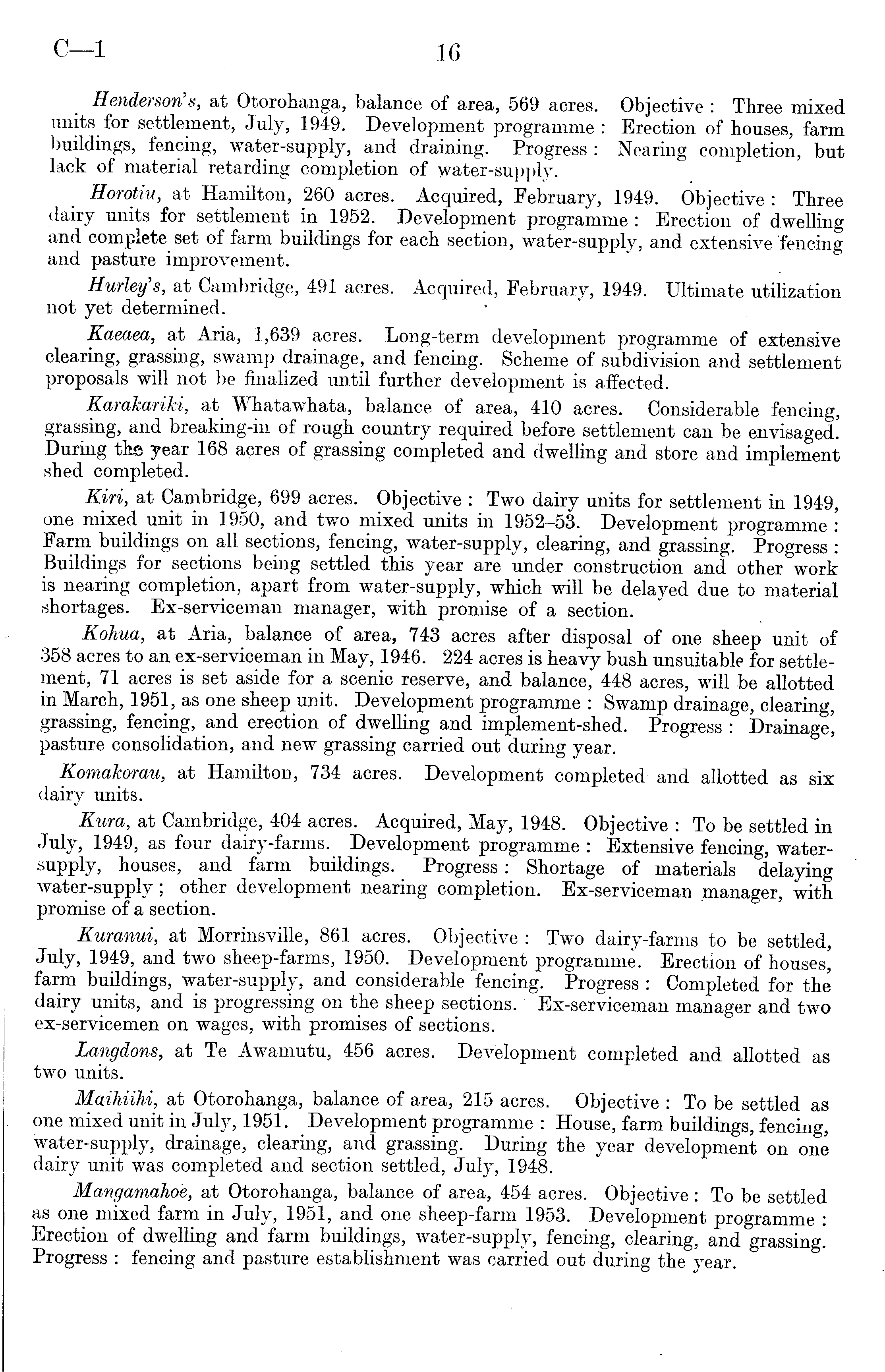 Henderson's, at Otorohanga, balance of area, 569 acres. Objective : Three mixed units for settlement, July, 1949. Development programme: Erection of houses, farm buildings, fencing, water-suppfy, and draining. Progress : Nearing completion, but lack of material retarding completion of water-supply. Horotiu, at Hamilton, 260 acres. Acquired, February, 1949. Objective : Three dairy units for settlement in 1952. Development programme : Erection of dwelling and complete set of farm buildings for each section, water-supply, and extensive fencing and pasture improvement. Hurley's, at Cambridge, 491 acres. Acquired, February, 1949. Ultimate utilization not yet determined. Kaeaea, at Aria, 1,639 acres. Long-term development programme of extensive clearing, grassing, swamp drainage, and fencing. Scheme of subdivision and settlement proposals will not be finalized until further development is affected. Karctkariki, at Whatawhata, balance of area, 410 acres. Considerable fencing, grassing, and breaking-in of rough country required before settlement can be envisaged. During the year 168 acres of grassing completed and dwelling and store and implement shed completed. Kin, at Cambridge, 699 acres. Objective : Two dairy units for settlement in 1949, one mixed unit in 1950, and two mixed units in 1952-53. Development programme : Farm buildings on all sections, fencing, water-supply, clearing, and grassing. Progress : Buildings for sections being settled this year are under construction and other work is nearing completion, apart from water-supply, which will be delayed due to material shortages. Ex-serviceman manager, with promise of a section. Kohua, at Aria, balance of area, 743 acres after disposal of one sheep unit of 358 acres to an ex-serviceman in May, 1946. 224 acres is heavy bush unsuitable for settlement, 71 acres is set aside for a scenic reserve, and balance, 448 acres, will be allotted in March, 1951, as one sheep unit. Development programme : Swamp drainage, clearing, grassing, fencing, and erection of dwelling and implement-shed. Progress : Drainage', pasture consolidation, and new grassing carried out during year. Komakorau, at Hamilton, 734 acres. Development completed and allotted as six dairy units. Kura, at Cambridge, 404 acres. Acquired, May, 1948. Objective : To be settled in July, 1949, as four dairy-farms. Development programme : Extensive fencing, watersupply, houses, and farm buildings. Progress: Shortage of materials delaying water-supply; other development nearing completion. Ex-serviceman .manager, with promise of a section. Kuranui, at Morrinsville, 861 acres. Objective : Two dairy-farms to be settled, July, 1949, and two sheep-farms, 1950. Development programme. Erection of houses,' farm buildings, water-supply, and considerable fencing. Progress : Completed for the dairy units, and is progressing on the sheep sections. Ex-serviceman manager and two ex-servicemen on wages, with promises of sections. Langdons, at Te Awamutu, 456 acres. Development completed and allotted as two units. Maihiihi, at Otorohanga, balance of area, 215 acres. Objective : To be settled as one mixed unit in July, 1951. Development programme : House, farm buildings, fencing, water-supply, drainage, clearing, and grassing. During the year development on one dairy unit was completed and section settled, July, 1948. Mangamahoe, at Otorohanga, balance of area, 454 acres. Objective : To be settled as one mixed farm in July, 1951, and one sheep-farm 1953. Development programme : Erection of dwelling and farm buildings, water-supply, fencing, clearing, and grassing. Progress : fencing and pasture establishment was carried out during the year.