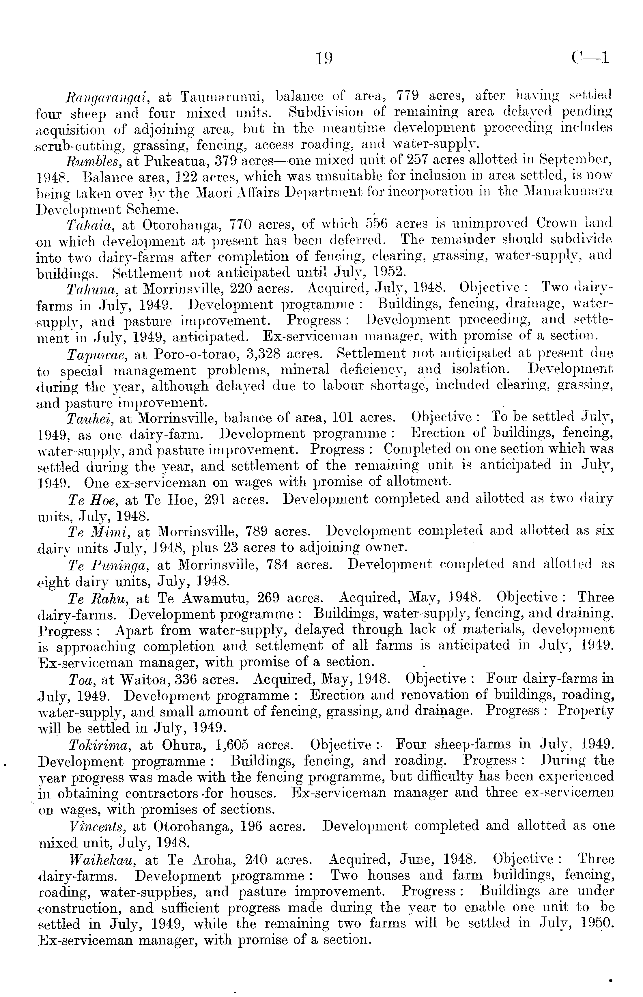 Rangarangai, at Tauniarunui, balance of area, 779 acres, after having settled four sheep and four mixed units. Subdivision of remaining area delayed pending acquisition of adjoining area, but in the meantime development proceeding includes .scrub-cutting, grassing, fencing, access reading, and water-supply. Rumbles, at Pukeatua, 379 acres —one mixed unit of 257 acres allotted in September, 1948. Balance area, 122 acres, which was unsuitable for inclusion in area settled, is now being taken over by the Maori Affairs Department for incorporation in the Mamakumaru Development Scheme. Tahaia, at Otorohanga, 770 acres, of which 556 acres is unimproved Crown land on which development at present has been deferred. The remainder should subdivide into two dairy-farms after completion of fencing, clearing, grassing, water-supply, and buildings. Settlement not anticipated until July, 1952. Taliuna, at Morrinsville, 220 acres. Acquired, July, 1948. Objective : Two dairyfarms in July, 1949. Development programme : Buildings, fencing, drainage, watersupply, and pasture improvement. Progress : Development proceeding, and settlement in July, 1949, anticipated. Ex-serviceman manager, with promise of a section. Tapuwae, at Poro-o-torao, 3,328 acres. Settlement not anticipated at present due to special management problems, mineral deficiency, and isolation. Development during the year, although delayed due to labour shortage, included clearing, grassing, and pasture improvement. Tauhei, at Morrinsville, balance of area, 101 acres. Objective : To be settled July, 1949, as one dairy-farm. Development programme : Erection of buildings, fencing, water-supply, and pasture improvement. Progress : Completed on one section which was settled during the year, and settlement of the remaining unit is anticipated in July, 1949. One ex-serviceman on wages with promise of allotment. Te Hoe, at Te Hoe, 291 acres. Development completed and allotted as two dairy units, July, 1948. Te Mimi, at Morrinsville, 789 acres. Development completed and allotted as six dairy units July, 1948, plus 23 acres to adjoining owner. Te Puninga, at Morrinsville, 784 acres. Development completed and allotted as eight dairy units, July, 1948. Te Rahu, at Te Awamutu, 269 acres. Acquired, May, 1948. Objective : Three dairy-farms. Development programme : Buildings, water-supply, fencing, and draining. Progress : Apart from water-supply, delayed through lack of materials, development is approaching completion and settlement of all farms is anticipated in July, 1949. Ex-serviceman manager, with promise of a section. Toa, at Waitoa, 336 acres. Acquired, May, 1948. Objective : Four dairy-farms in July, 1949. Development programme : Erection and renovation of buildings, roading, water-supply, and small amount of fencing, grassing, and drainage. Progress : Property will be settled in July, 1949. Tokirima, at Ohura, 1,605 acres. Objective : Four sheep-farms in July, 1949. Development programme : Buildings, fencing, and roading. Progress : During the year progress was made with the fencing programme, but difficulty has been experienced in obtaining contractors-for houses. Ex-serviceman manager and three ex-servicemen on wages, with promises of sections. Vincents, at Otorohanga, 196 acres. Development completed and allotted as one mixed unit, July, 1948. WaiheJcau, at Te Aroha, 240 acres. Acquired, June, 1948. Objective : Three dairy-farms. Development programme : Two houses and farm buildings, fencing, roading, water-supplies, and pasture improvement. Progress : Buildings are under construction, and sufficient progress made during the year to enable one unit to be settled in July, 1949, while the remaining two farms will be settled in July, 1950. Ex-serviceman manager, with promise of a section.