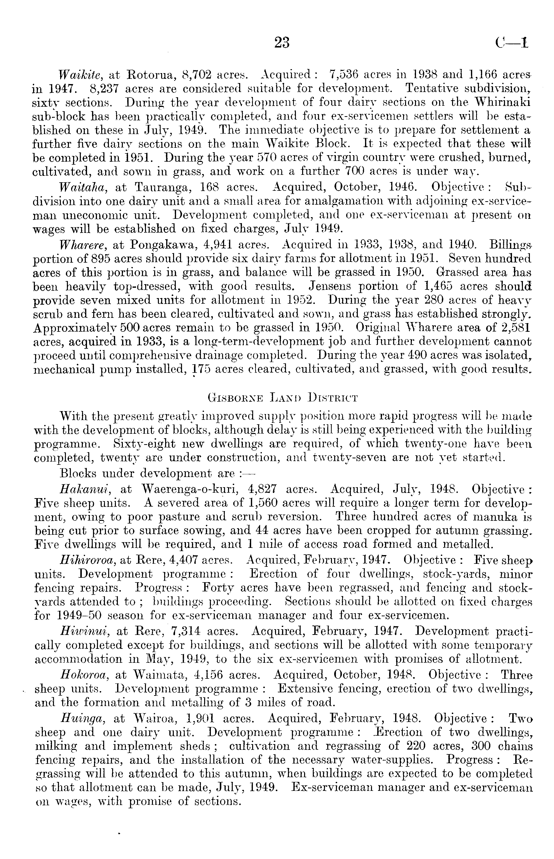 Waikite, at Rotorua, 8,702 acres. Acquired : 7,536 acres in 1938 and 1,166 acresin 1947. 8,237 acres are considered suitable for development. Tentative subdivision, sixty sections. During the year development of four dairy sections on the Whirinaki sub-block has been practically completed, and four ex-servicemen settlers will be established on these in July, 1949. The immediate objective is to prepare for settlement a further five dairy sections on the main Waikite Block. It is expected that these will be completed in 1951. During the year 570 acres of virgin country were crushed, burned, cultivated, and sown in grass, and work on a further 700 acres is under way. Waitaha, at Tauranga, 168 acres. Acquired, October, 1946. Objective : Subdivision into one dairy unit and a small area for amalgamation with adjoining ex-service-man uneconomic unit. Development completed, and one ex-serviceman at present on wages will be established on fixed charges, July 1949. Wharere, at Pongakawa, 4,941 acres. Acquired in 1933, 1938, and 1940. Billingsportion of 895 acres should provide six dairy farms for allotment in 1951. Seven hundred acres of this portion is in grass, and balance will be grassed in 1950. Grassed area has been heavily top-dressed, with good results. Jensens portion of 1,465 acres should provide seven mixed units for allotment in 1952. During the year 280 acres of heavy scrub and fern has been cleared, cultivated and sown, and grass has established strongly. Approximately 500 acres remain to be grassed in 1950. Original Wharere area of 2,581 acres, acquired in 1933, is a long-term-development job and further development cannot proceed until comprehensive drainage completed. During the year 490 acres was isolated,, mechanical pump installed, 175 acres cleared, cultivated, and grassed, with good results. Gisborne Land District With the present greatly improved supply position more rapid progress will be made with the development of blocks, although delay is still being experienced with the building programme.' Sixty-eight new dwellings are required, of which twenty-one have been completed, twenty are under construction, and twenty-seven are not yet started. Blocks under development are : Hakanui, at Waerenga-o-kuri, 4,827 acres. Acquired, July, 1948. Objective: Five sheep units. A severed area of 1,560 acres will require a longer term for development, owing to poor pasture and scrub reversion. Three hundred acres of manuka is being cut prior to surface sowing, and 44 acres have been cropped for autumn grassing. Five dwellings will be required, and 1 mile of access road formed and metalled. Hihiroroa, at Here, 4,407 acres. Acquired, February, 1947. Objective : Five sheep units. Development programme : Erection of four dwellings, stock-yards, minor fencing repairs. Progress : Forty acres have been regrassed, and fencing and stockyards attended to ; buildings proceeding. Sections should be allotted on fixed charges for 1949-50 season for ex-serviceman manager and four ex-servicemen. Hiwinui, at Rere, 7,314 acres. Acquired, February, 1947. Development practically completed except for buildings, and sections will be allotted with some temporary accommodation in May, 1949, to the six ex-servicemen with promises of allotment. Hokoroa, at Waimata, 4,156 acres. Acquired, October, 1948. Objective : Three sheep units. Development programme : Extensive fencing, erection of two dwellings, and the formation and metalling of 3 miles of road. Huinga, at Wairoa, 1,901 acres. Acquired, February, 1948. Objective: Two sheep and one dairy unit. Development programme : .Erection of two dwellings, milking and implement sheds ; cultivation and regrassing of 220 acres, 300 chains fencing repairs, and the installation of the necessary water-supplies. Progress : Regrassing will be attended to this autumn, when buildings are expected to be completed so that allotment can be made, July, 1949. Ex-serviceman manager and ex-serviceman on wages, with promise of sections.