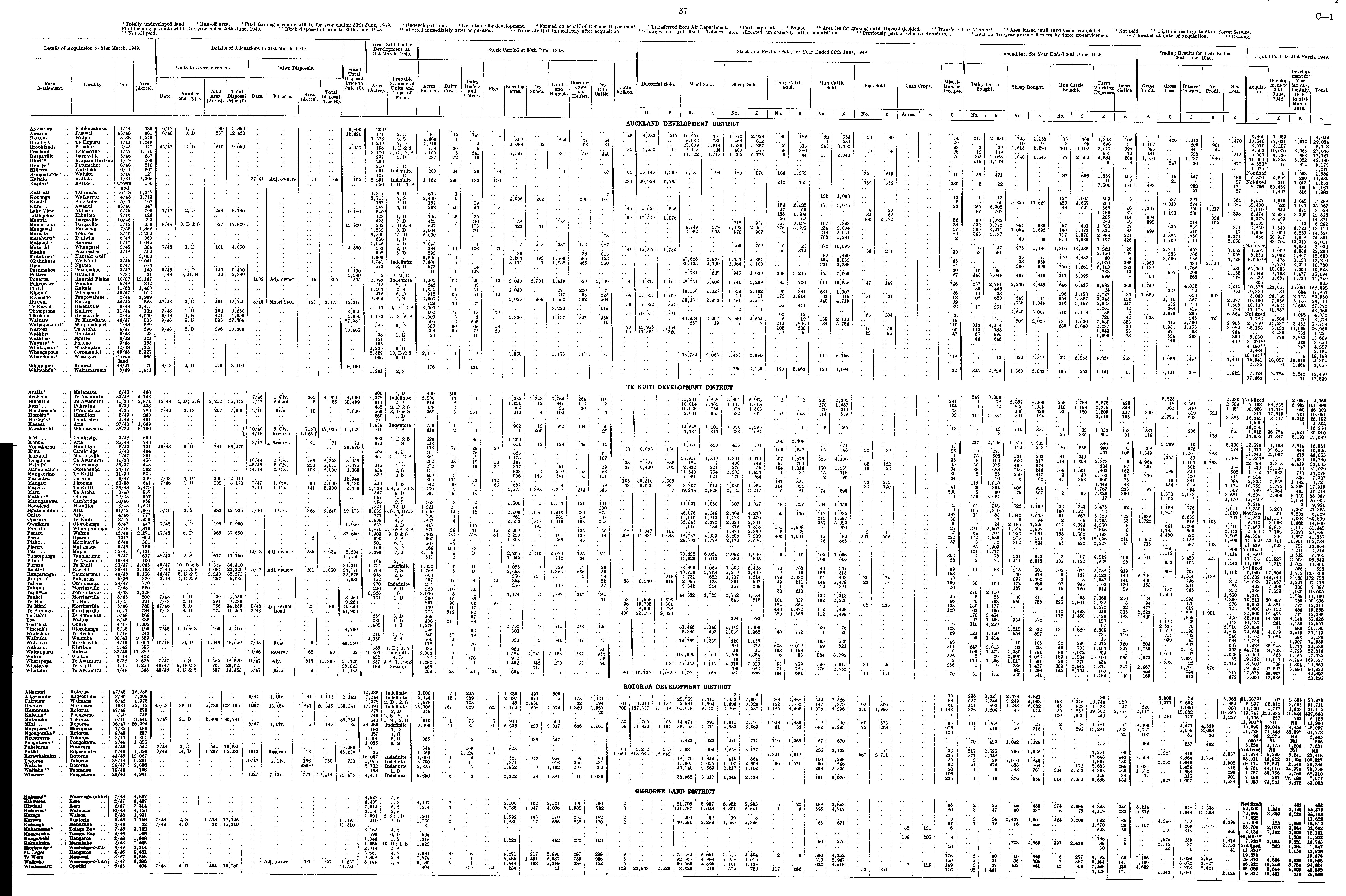 1 Totally uud First farming 2 3 Not all pai( i veloped land. 2 Run-off area. 3 First farming accounts will be for year ei iccounts will be for year ended 30th June, 1949. 15 Block disposed of prior i. J June 1949. 4 Undeveloped land. 5 Unsuitable for development. 8 Farmed on behalf of Defence Department. 7 Transferred from Air Department, to 30th June, 1948. Allotted mimediately after acquisition. 17 To be allotted immediately after acquisition. 18 Chargés not yet fixed. Tobacco area 8 Part payment. 9 Bonus, allocated immediately after 0r disposal decjded. 11 Transferred to Atiamuri. 12 Area leased until subdivision completed . acquisition. Previously part of Ohakea Aerodrome. 2 0 Held on five-year grazing liceilces by three ex-servicemen. 13 Not pa 21 tid. 1 * 15,815 acres to go to State Forest Service. Allocated at date of acquisition. 2 2 Grazing. Details of J Lcquisition to 3Ist \farch, 1 949. Details of Aliec lations to 31st March, 1949. Areas Still Under Development at 31st March, 1949. Stock Carried at 30th June, 1948. Stock and Produce Såles for Year Ended 30th June, 1948. Expenditure for Year Ended 30th June, 1948. Trading Results for Year Ended 30th June, 1948. Capital Costs to 3Ist March, 1949. Units to Ex-servicemen. Other Disposals. Grand Total Probable Number o: Units and Type of Farm. Develo ?- Farm Settlement. Locality. Date. Area (Acres). Date. Number and Type. Total Area (Acres). Total Disposa Price (£) Date. . Purpose. Area (Acres) Total Disposal Price (£) Disposa Price tc Date (£ Area ' (Acres) Acres Farmed Dairy Cows. Dairy Heifers and Calves Pigs Breeding ewes. Dry Sheep. Lambs and Hogget Breedinj cows and * Heifers Dry Run Cattle. Cows Milked. Butterfat Sold. lb. I £ Wool Sold. lb. I £ Sheep Sold. No. I £ Dairy Cattle Sold. No. I £ Run Cattle Sold. 1 No. I £ Pigs Sold. No. 1 £ Cash Crops. Miscellaneous Receipt Dairy Cattle Bought. Sheep Bought. Rur Bc Cattle ught. Farm Workin Expens Depre- | ciation Gross Proflt Gross Loss. Interes Chargec t Net 1. Proflt. Net Loss. Acquis tion. Develo] ment t 30th June, 1948. > Nine Months Ist Jul 1948, to 31st March 1949. , V, Total. Araparera Awaroa Battens Bradleys Brooklands Crosland Dargaville Glorit» Henrys 3 Hillerest Hungerfords 3 .. Kaitaia Kapiro 4 Katikati Kokonga Komiri Kumi Lake View Littlejohns Mahuta Mamaranui Mangawai Maraetai Matahuru 3 Matakohe Matariki Mauku Motutapu 6 Okahukura Opou Patumahoe Potters Pouarua Pukeoware Puriri Riponui Riverside Ruawai Te Kawau Thompsons Tikokopu Waikare Waipapakauri 7 Waitoki Watkins Watkins 3 Waynes 23 Whakapara 3 .. Whangapoua Wharekohe 3 .. Whenuanui Whitecliffs 3 Kaukapakaka Ruawai Waipu Te Kopuru Papakura Helensville Dargaville Kaipara Harbou Patumahoe Waikiekie Waiuku Kaitaia Kerikeri Tauranga Waikaretu Pukekohe Awanui Ahipara Hikutaia Dargaville Dargaville Mangawai Tokoroa Taniwha Ruawai Whangarei Patumahoe Hauraki Gulf Wellsford Ngatea Patumahoe .. Otahuhu Hauraki Plains Waiuku Kaitaia Whangarei Tangowahine .. Ruawai Helensville Kaihere Helensville Te Kauwhata.. Waipapakauri Te Aroha Matatoki Ngatea Pokeno Whakapara Coromandel .. Whangarei Ruawai Wairamarama 11/44 45/48 3/38 1/41 2/45 4/47 5/48 1/49 6/48 6/44 5/48 4/34 Crown land 46/48 4/48 5/47 46/48 6/45 7/46 10/46 5/45 7/35 8/46 6/48 9/47 2/45 4/48 3/45 6/47 3/47 7/34 10/37 5/48 11/33 45/47 2/46 44/45 6/48 11/44 2/45 46/47 1/48 6/47 6/48 6/48 9/48 12/48 46/48 Crown land 46/47 3/49 389 461 1,576 1,249 377 3,170 237 206 210 661 127 2,305 550 1,347 3,713 167 347 796 129 423 959 1,862 3,200 360 1,045 334 592 3,606 9,041 573 140 21 12,147 242 1,403 912 3,969 528 3,413 102 4,600 505 589 296 93 121 165 1,325 2,327 965 176 1,941 6/47 8/48 45/47 7/47 8/48 7/48 9/48 •/48 47/48 7/48 6/48 9/48 9/48 8/48 1, D 3, D 2, D 2, D 3, D & S 1, D 2,b 5, M, G 3, D 1, D 1, s 5, D 2, D 2, D 180 287 219 256 *597 101 HO 16 401 102 424 505 296 176 3,890 12,420 9,050 9 j 780 13j 820 4,850 9 j 400 2,380 12* i40 4,950 27,380 10,460 8,100 37/41 1939 8/45 Adj. owners Adj. owner Maori Sett. ' 14 *49 i27 i65 éo5 3475 3,890 12,420 9^050 165 9,780 13 j 820 4,850 9,400 2,380 305 15 315 4,950 27,380 10,460 8,100 209 174 1,576 1,249 158 3,170 237 206 210 661 127 2,291 550 1,347 3,713 167 347 540 129 423 362 1,862 3,200 360 1,045 233 592 3,606 9,041 573 5 12.098 242 1,403 912 3,969 3 j 413 4^76 589 93 121 165 1,325 2,327 965 1,941 i 2, D 2, S 7, D 1, 1) & S 5, D ; 2, S 2, D 1,D Indefinite 1, D Indefinite 1, D ; 1, S 6, D 7, S 2, D 3, D i 1, D 2, D 1, D & S 8, D 21, D 4, D 4, D 2, D 6, D Indefinite 3, D 2, M,' G Indefinite 2, D 2, S 5, D 4, S 13, D V 2,8 7, D ; *5, S 5,'D i, "i> 1, D 6,'D 13, D & 8 6, D 2, S 461 1,400 1,249 158 3,100 237 260 1, i 62 602 3,400 167 262 io6 423 597 1,084 2,000 1 334 592 3,606 7,000 573 140 8,000 242 1,350 912 3,900 126 3,000 102 4,000 505 589 296 93 2,il5 176 ' *45 1 30 5 72 64 290 1 5 ' 40 ' 66 1 1 74 3 5 1 63 1 66 5 36 47 5 12 90 69 4 149 4 5 241 46 20 i30 ' 59 40 *30 310 175 371 1 106 ' 14 192 i99 35 54 54 27 "l2 3 296 108 71 40 2 134 *• 1 "l8 ioo 3 ' 01 19 19 12 ' 28 23 - 802 1,088 1,597 4,998 58 323 7 ' 86 2,263 3,171 2,049 1,049 2^085 2,836 1^860 32 202 34 213 493 7 2,591 968 224 1 864 1 i82 '337 1,569 1,038 1,410 274 317 1,552 3^239 1,457 1 j 155 ' 87 63 210 260 153 38 585 266 398 220 96 302 297 il7 64 84 340 ' 87 160 ' 78 287 313 153 240 2jiso i27 223 504 515 365 10 ' *77 AU 45 ' 30 64 280 40 69 87 50 66 ' 59 54 ' 90 65 CKLAN1 8,233 4,553 13ji45 60^928 17,549 15^326 10,377 14,530 7,522 10,954 11,854 D DEV 910 494 6,735 626 li 076 1^784 1i64 854 1,221 1,454 1,320 ELOPME 10,234 8,932 25,609 1,448 41,722 i,isi 2,963 47j 628 39,405 2,784 42,751 18^336 33*153 43,934 257 18i 733 NT DIS *857 780 1,944 124 3,742 ' 93 378 205 2,887 3,100 229 3,600 1^425 2,999 3,'964 19 2,065 >TRICT 468 3,580 439 4,295 "i80 712 1,493 570 409 2,364 945 1,741 1,559 10 1,481 2 7 1,766 2,926 612 5,267 585 6,776 270 977 2,054 967 702 2,'364 3,109 1,890 3/298 2,'i92 11 2,249 1 7 2,080 3,120 ' 60 25 88 5 i66 212 152 27 156 50 353 276 9 5 
