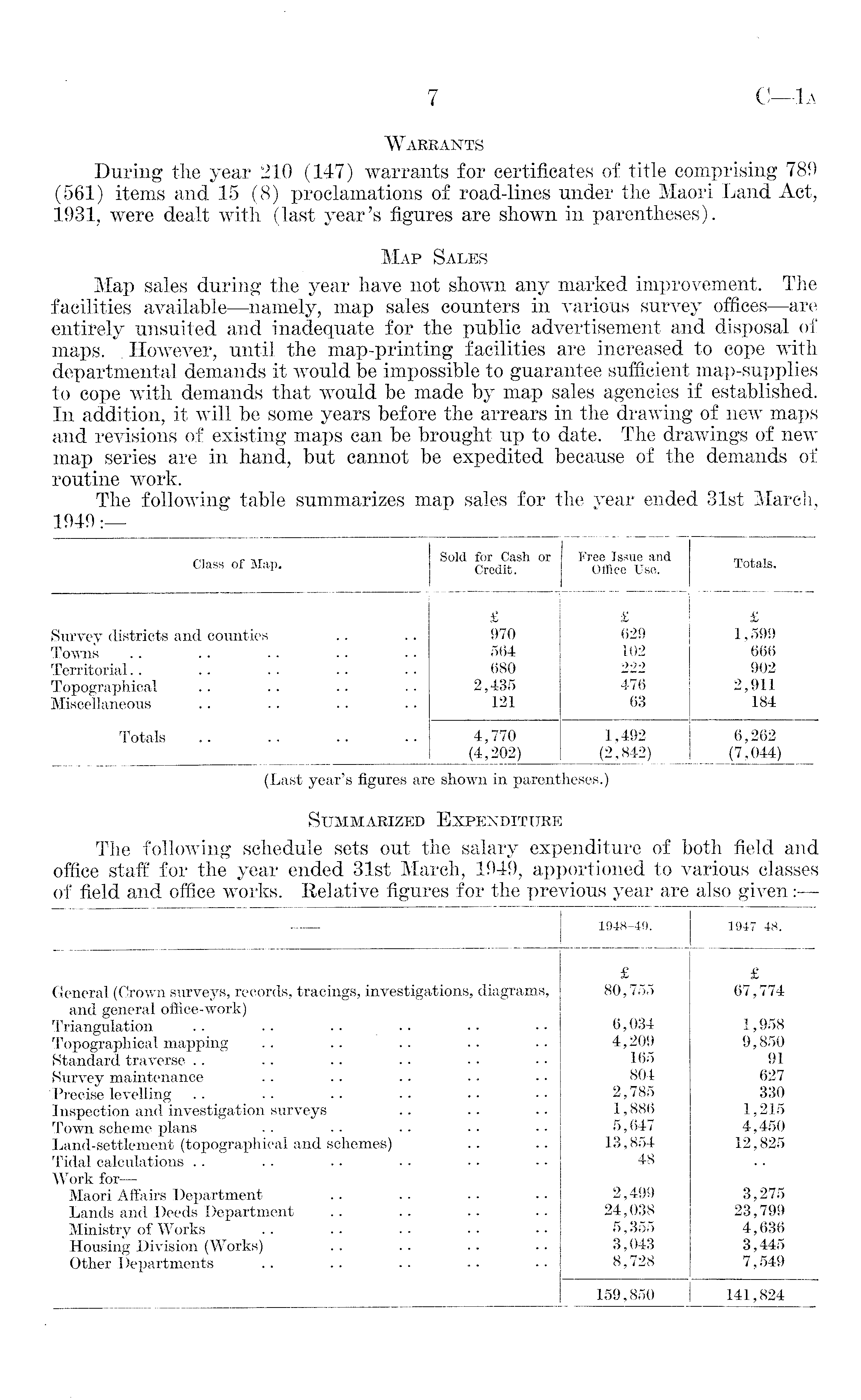 Warrants During the year 210 (147) warrants for certificates of title comprising 789: (561) items and 15 (8) proclamations of road-lines under the Maori Land Act, 1931, were dealt with (last year's figures are shown in parentheses). Map Sales Map sales during the year have not shown any marked improvement. The facilities available—namely, map sales counters in various survey offices—are entirely unsuited and inadequate for the public advertisement and disposal of maps. However, until the map-printing facilities are increased to cope with departmental demands it would be impossible to guarantee sufficient map-supplies to cope with demands that would be made by map sales agencies if established. In addition, it will be some years before the arrears in the drawing of new maps and revisions of existing maps can be brought up to date. The drawings of new map series are in hand, but cannot be expedited because of the demands of routine work. The following table summarizes map sales for the year ended 31st March, 1949