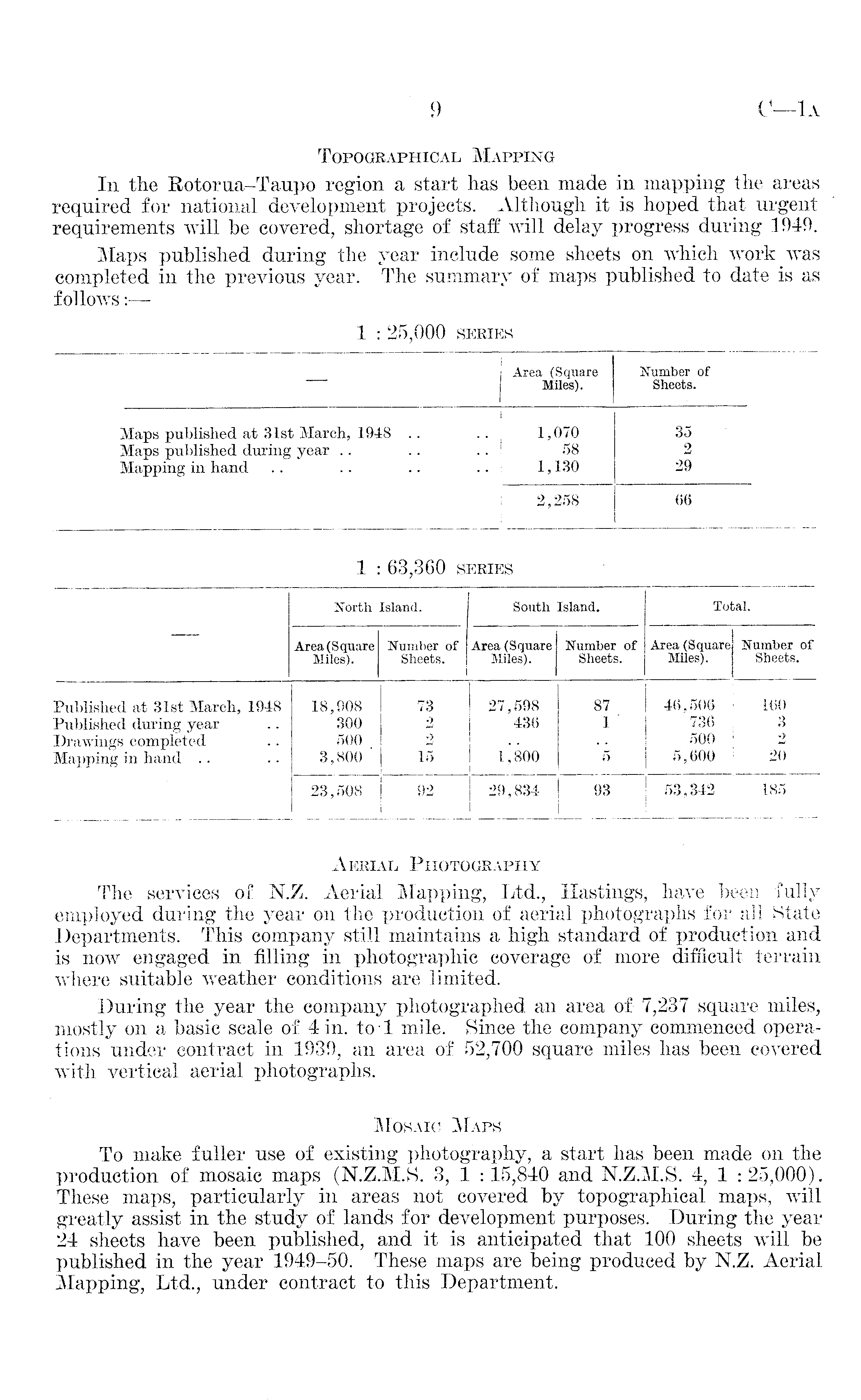 Aerial Photography The services of N.Z. Aerial Mapping, Ltd., Hastings, have been fully employed during the year on the production of aerial photographs for all State Departments. This company still maintains a high standard of production and is now engaged in filling in photographic coverage of more difficult terrain where suitable weather conditions are limited. During the year the company photographed an area of 7,237 square miles, mostly on a basic scale of 4 in. to l mile. Since the company commenced operations under contract in 1939, an area of 52,700 square miles has been covered with vertical aerial photographs. Mosaic Maps To make fuller use of existing photography, a start has been made on the production of mosaic maps (N.Z.M.S. 3, 1 :15,840 and N.Z.M.S. 4, 1 : 25,000). These maps, particularly in areas not covered by topographical maps, will greatly assist in the study of lands for development purposes. During the year 24 sheets have been published, and it is anticipated that 100 sheets will be published in the year 1949-50. These maps are being produced by N.Z. Aerial Mapping, Ltd., under contract to this Department.