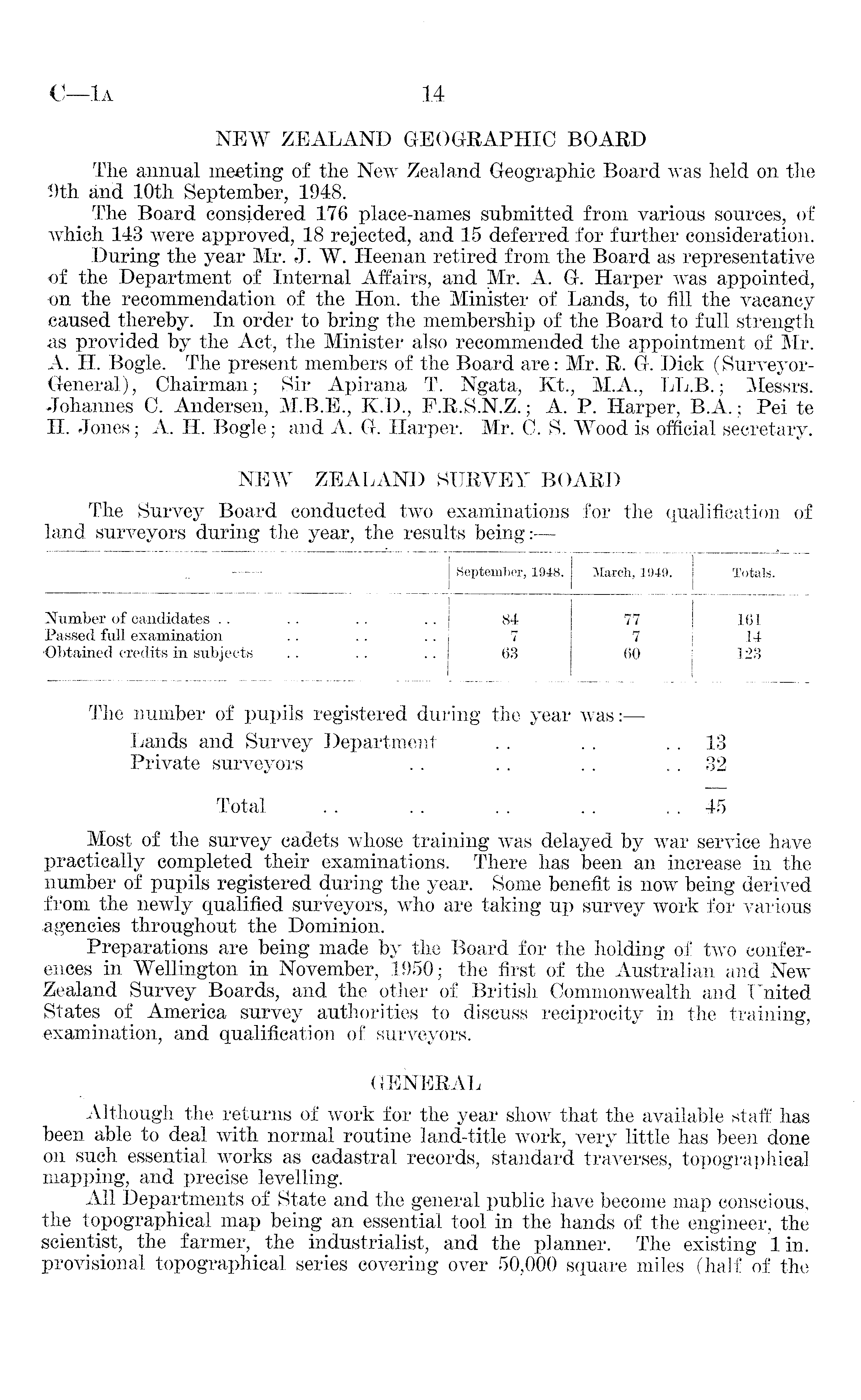 NEW ZEALAND GEOGRAPHIC BOARD The annual meeting of the New Zealand Geographic Board was held on the 9th and 10th September, 1948. The Board considered 176 place-names submitted from various sources, of which 143 were approved, 18 rejected, and 15 deferred for further consideration. During the year Mr. J. W. Heenan retired from the Board as representative of the Department of Internal Affairs, and Mr. A. G. Harper was appointed, on the recommendation of the Hon. the Minister of Lands, to fill the vacancy caused thereby. In order to bring the membership of the Board to full strength as provided by the Act, the Minister also recommended the appointment of Mr. A. H. Bogle. The present members of the Board are: Mr. R. G. Dick (SurveyorGeneral), Chairman; Sir Apirana T. Ngata, Kt., M.A., LL.B.; Messrs. Johannes C. Andersen, M.8.E., K.D., P.R.S.N.Z.; A. P. Harper, 8.A.; Pei te H. Jones; A. H. Bogle; and A. G. Harper. Mr. C. S. "Wood is official secretary. NEW ZEALAND SURVEY BOARD The Survey Board conducted two examinations for the qualification of land surveyors during the year, the results being:—