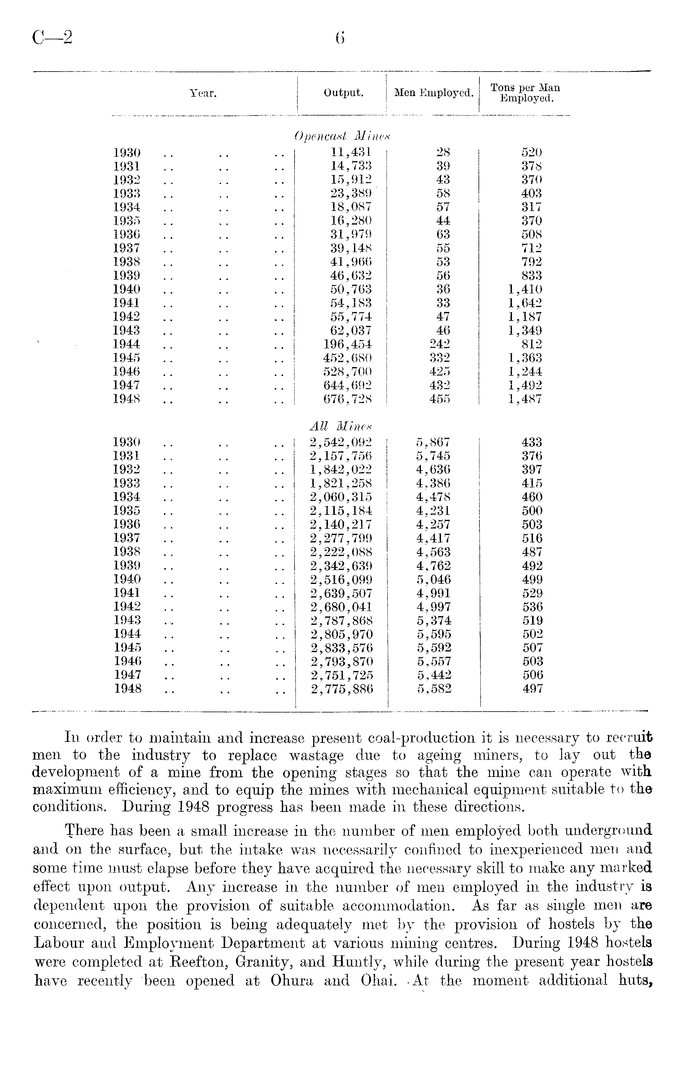 In order to maintain and increase present coal-production it is necessary to recruit men to the industry to replace wastage due to ageing miners, to lay out the development of a mine from the opening stages so that the mine can operate with, maximum efficiency, and to equip the mines with mechanical equipment suitable to the conditions. During 1948 progress has been made in these directions. There has been a small increase in the number of men employed both underground and on the surface, but the intake was necessarily confined to inexperienced men and s'ome time must elapse before they have acquired the necessary skill to make any marked effect upon output. Any increase in the number of men employed in the industry is dependent upon the provision of suitable accommodation. As far as single men are concerned, the position is being adequately met by the provision of hostels by the Labour and Employment Department at various mining centres. During 1948 hostela were completed at Reefton, G-ranity, and Huntly, while during the present year hostels have recently been opened at Ohura and Ohai. -At the moment additional huts,