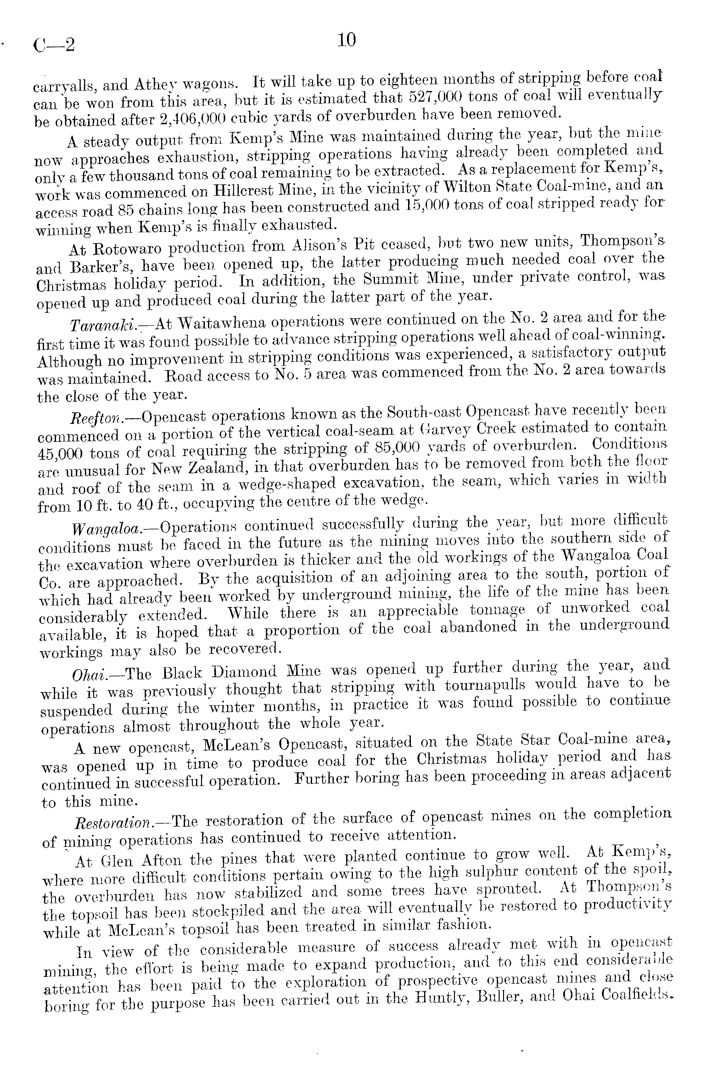 carryalls, and Athey wagons. It will take up to eighteen months of stripping before coal can be won from this area, but it is estimated that 527,000 tons of coal will eventually be obtained after 2,406,000 cubic yards of overburden have been removed. A steady output from Kemp's Mine was maintained during the year, but the mine now approaches exhaustion, stripping operations having already been completed and only a few thousand tons of coal remaining to be extracted. As a replacement for Kemp s r work was commenced on Hillcrest Mine, in the vicinity of Wilton State Coal-mine, and an access road 85 chains long has been constructed and 15,000 tons of coal stripped ready tor winning when Kemp's is finally exhausted. At Eotowaro production from Alison's Pit ceased, but two new units, Thompson'sand Barker's, have been, opened up, the latter producing much needed coal over the Christmas holiday period. In addition, the Summit Mine, under private control, was opened up and produced coal during the latter part of the year. TaranaM —At Waitawhena operations were continued on the No. 2 area and for the first time it was found possible to advance stripping operations well ahead of coal-wmnmg Although no improvement in stripping conditions was experienced, a satisfactory output was maintained. Eoad access to No. 5 area was commenced from the No. 2 area towards the close of the year. Reefton —Opencast operations known as the South-east Opencast have recently been commenced on a portion of the vertical coal-seam at Garvey Creek estimated to contain 45,000 tons of coal requiring the stripping of 85,000 yards of overburden Condition are unusual for New Zealand, in that overburden has to be removed from both the floor and roof of the seam in a wedge-shaped excavation, the seam, which varies m width from 10 ft. to 40 ft., occupying the centre of the wedge. Wanqaloa —Operations continued successfully during the year, but more difficult conditions must be faced in the future as the mining moves into the southern side of the excavation where overburden is thicker and the old workings of the Wangaloa Coal are approached. By the acquisition of an adjoining area to the south, portion o± which had already been worked by underground mining, the life of the mine has been considerably extended. While there is an appreciable tonnage of unworked coal available, it is hoped that a proportion of the coal abandoned m the underground workings may also be recovered. Ohai—Tte Black Diamond Mine was opened up further during the year and while it was previously thought that stripping with toumapulls would nave to be suspended during the winter months, in practice it was found possible to continue operations almost throughout the whole year. A new opencast, McLean's Opencast, situated on the State Star Coal-mme area, was opened up in time to produce coal for the Christmas holiday period and has lontinued in successful operation. Further boring has been proceeding m areas adjacent to this mine. Restoration.- The restoration of the surface of opencast mines on the completion of mining operations has continued to receive attention. 'At Glen Afton the pines that were planted continue to grow well. At Kemp s where more difficult conditions pertain owing to the high sulphur content of the spoil, the overburden has now stabilized and some trees have sproutea. At Ihompson s the topsoil has been stockpiled and the area will eventually be restored to productivity while at McLean's topsoil has been treated in similar fashion. In view of the considerable measure of success already met with m opencast minincr the effort is being made to expand production, and to this end considerable attention has been paid to the exploration of prospective opencast nnnes and close bori g for the purpose has been carried out in the Huntly, Buller, and Ohai Coalfields.