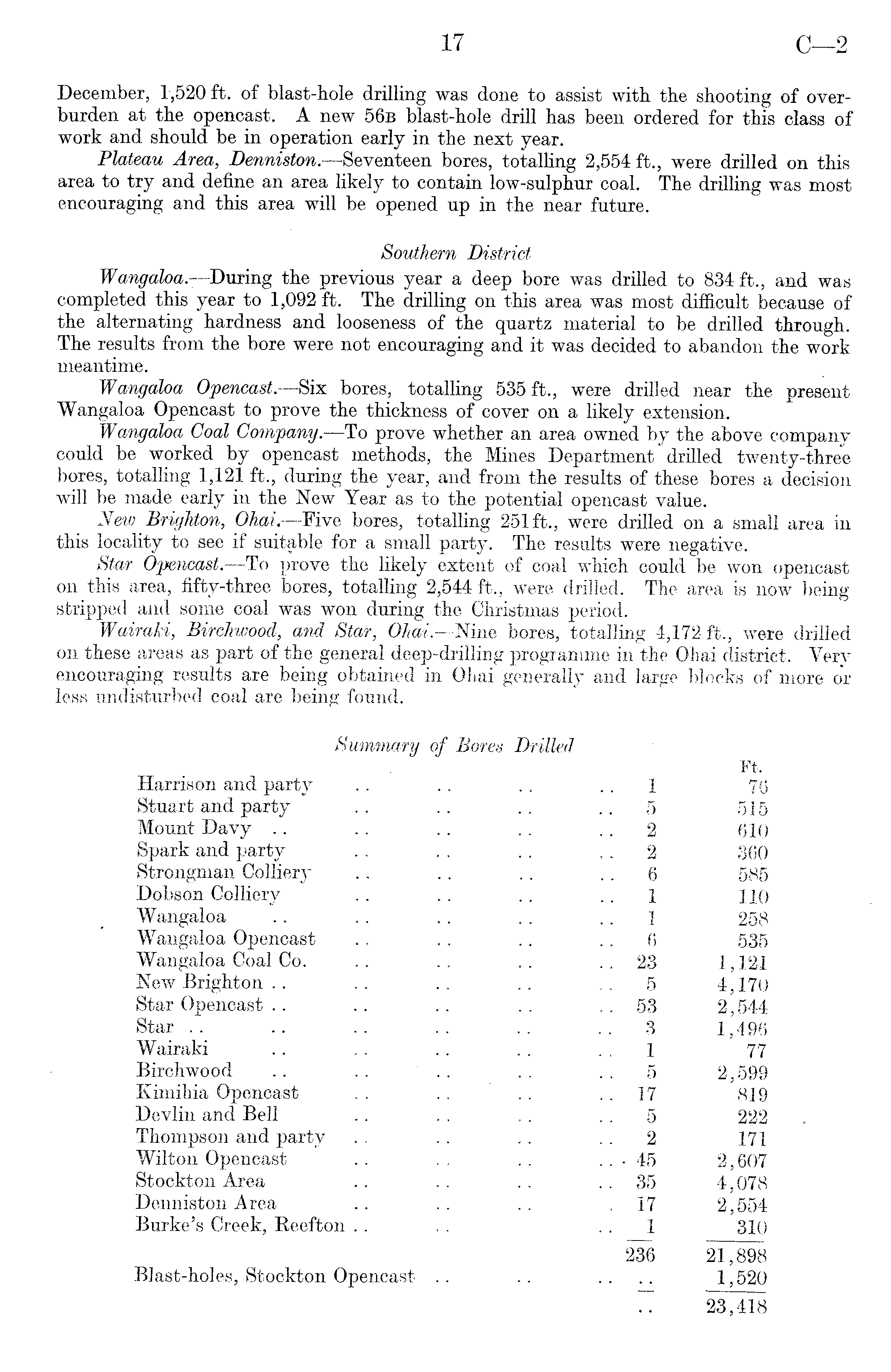 December, 1,520 ft. of blast-hole drilling was done to assist with the shooting of overburden at the opencast. A new 56b blast-hole drill has been ordered for this class of work and should be in operation early in the next year. Plateau Area, Denniston. —Seventeen bores, totalling 2,554 ft., were drilled on this area to try and define an area likely to contain low-sulphur coal. The drilling was most encouraging and this area will be opened up in the near future. Southern District Wangaloa.— -During the previous year a deep bore was drilled to 834 ft., and was completed this year to 1,092 ft. The drilling on this area was most difficult because of the alternating hardness and looseness of the quartz material to be drilled through. The results from the bore were not encouraging and it was decided to abandon the work meantime. Wangaloa Opencast. —Six bores, totalling 535 ft., were drilled near the present Wangaloa Opencast to prove the thickness of cover on a likely extension. Wangaloa Coal Company.—To prove whether an area owned by the above company could be worked by opencast methods, the Mines Department drilled twenty-three bores, totalling 1,121 ft., during the year, and from the results of these bores a decision will be made early in the New Year as to the potential opencast value. New Brighton, Ohai.—Five bores, totalling 251 ft., were drilled on a small area in this locality to see if suitable for a small party. The results were negative. Star Opencast. —To prove the likely extent of coal which could be won opencast on this area, fifty-three bores, totalling 2,544 ft., were drilled. The area is now being stripped and some coal was won during the Christmas period. Wairaki, Birchwood, and Star, Ohai- -Nine bores, totalling 4,172 ft., were drilled on these areas as part of the general deep-drilling programme in the Ohai district. Very encouraging results are being obtained in Ohai generally and large blocks of more or less undisturbed coal are being found. Summary of Bores Drilled Ft. Harrison and party . . . . . . . . 1 7G Stuart and party .. .. .. ..5 515 Mount Davy .. . . . . . . .. 2 610 Spark and party . , .. .. .. 2 360 Strongman Colliery .. .. .. .. 6 585 Dobson Colliery . . .. . . . . 1 110 Wangaloa . . . . .. .. .. 1 258 Wangaloa Opencast ~ .. .. .. 6 535 Wangaloa Coal Co. .. .. .. ..23 1,121 New Brighton .. .. .. .. ..5 4,170 Star Opencast .. .. .. .. ..53 2,544 Star .. .. . . . . .. ..3 1,496 Wairaki . . . . . . .. . , 1 77 Birchwood .. .. .. .. .. 5 2,599 Kimihia Opencast . . . . . . . . 17 819 Devlin and Bell .. .. .. .. 5 222 Thompson and party . . . . . . . . 2 171 Wilton Opencast . . . . .. ... 45 2,607 Stockton Area .. .. .. ..35 4,078 Denniston Area .. .. .. .17 2,554 Burke's Creek, Keefton . . . . . . 1 310 236 21,898 Blast-holes, Stockton Opencast .. .. .... 1,520 23,418