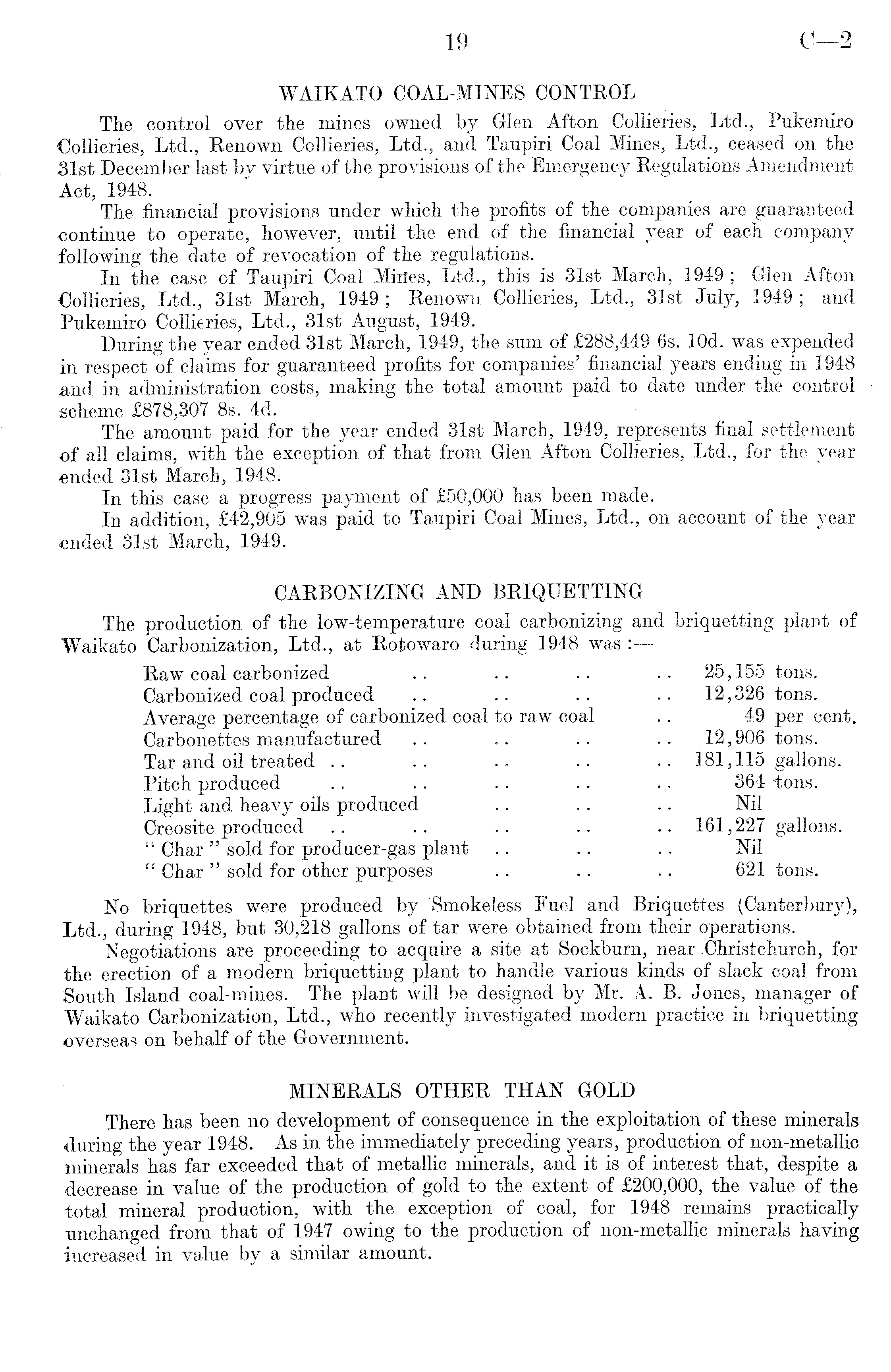 WAIKATO COAL-MINES CONTROL The control over the mines owned by Glen Afton Collieries, Ltd., Pukemiro Collieries, Ltd., Eenown Collieries, Ltd., and Taupiri Coal Mines, Ltd., ceased on the 31st December last bv virtue of the provisions of the Emergency Regulations Amendment Act, 1948. The financial provisions under which the profits of the companies are guaranteed continue to operate, however, until the end of the financial year of each company following the date of revocation of the regulations. In the case of Taupiri Coal Mines, Ltd., this is 31st March, 1949 ; Glen Afton Collieries, Ltd., 31st March, 1949 ; Renown Collieries, Ltd., 31st July, 1949 ; and Pukemiro Collieries, Ltd., 31st August, 1949. During the year ended 31st March, 1949, the sum of £288,449 6s. lOd. was expended in respect of claims for guaranteed profits for companies' financial years ending in 1948 and in administration costs, making the total amount paid to date under the control scheme £878,307 Bs. 4d. The amount paid for the year ended 31st March, 1949, represents final settlement of all claims, with the exception of that from Glen Afton Collieries, Ltd., for the year ended 31st March, 1948. In this case a progress payment of £50,000 has been made. In addition, £42,905 was paid to Taupiri Coal Mines, Ltd., on account of the year ended 31st March, 1949. CARBONIZING AND BRIQUETTING The production of the low-temperature coal carbonizing and briquetting plant of Waikato Carbonization, Ltd., at Rotowaro during 1948 was : Raw coal carbonized .. .. .. .. 25,155 tons. Carbonized coal produced .. .. .. .. 12,326 tons. Average percentage of carbonized coal to raw coal .. 49 per cent. Carbonettes manufactured .. .. .. .. 12,906 tons. Tar and oil treated .. .. .. .. .. 181,115 gallons. Pitch produced .. .. .. .. .. 364 -tons. Light and heavy oils produced .. .. .. Nil Creosite produced .. .. .. .. .. 161,227 gallons. " Char " sold for producer-gas plant .. .. .. Nil " Char " sold for other purposes .. .. .. 621 tons. No briquettes were produced by 'Smokeless Euel and Briquettes (Canterbury), Ltd., during 1948, but 30,218 gallons of tar were obtained from their operations. Negotiations are proceeding to acquire a site at Sockburn, near Christchurch, for the erection of a modern briquetting plant to handle various kinds of slack coal from South Island coal-mines. The plant will be designed by Mr. A. B. Jones, manager of Waikato Carbonization, Ltd., who recently investigated modern practice in briquetting overseas on behalf of the Government. MINERALS OTHER THAN GOLD There has been no development of consequence in the exploitation of these minerals during the year 1948. As in the immediately preceding years, production of non-metallic minerals has far exceeded that of metallic minerals, and it is of interest that, despite a decrease in value of the production of gold to the extent of £200,000, the value of the total mineral production, with the exception of coal, for 1948 remains practically unchanged from that of 1947 owing to the production of non-metallic minerals having increased in value by a similar amount.