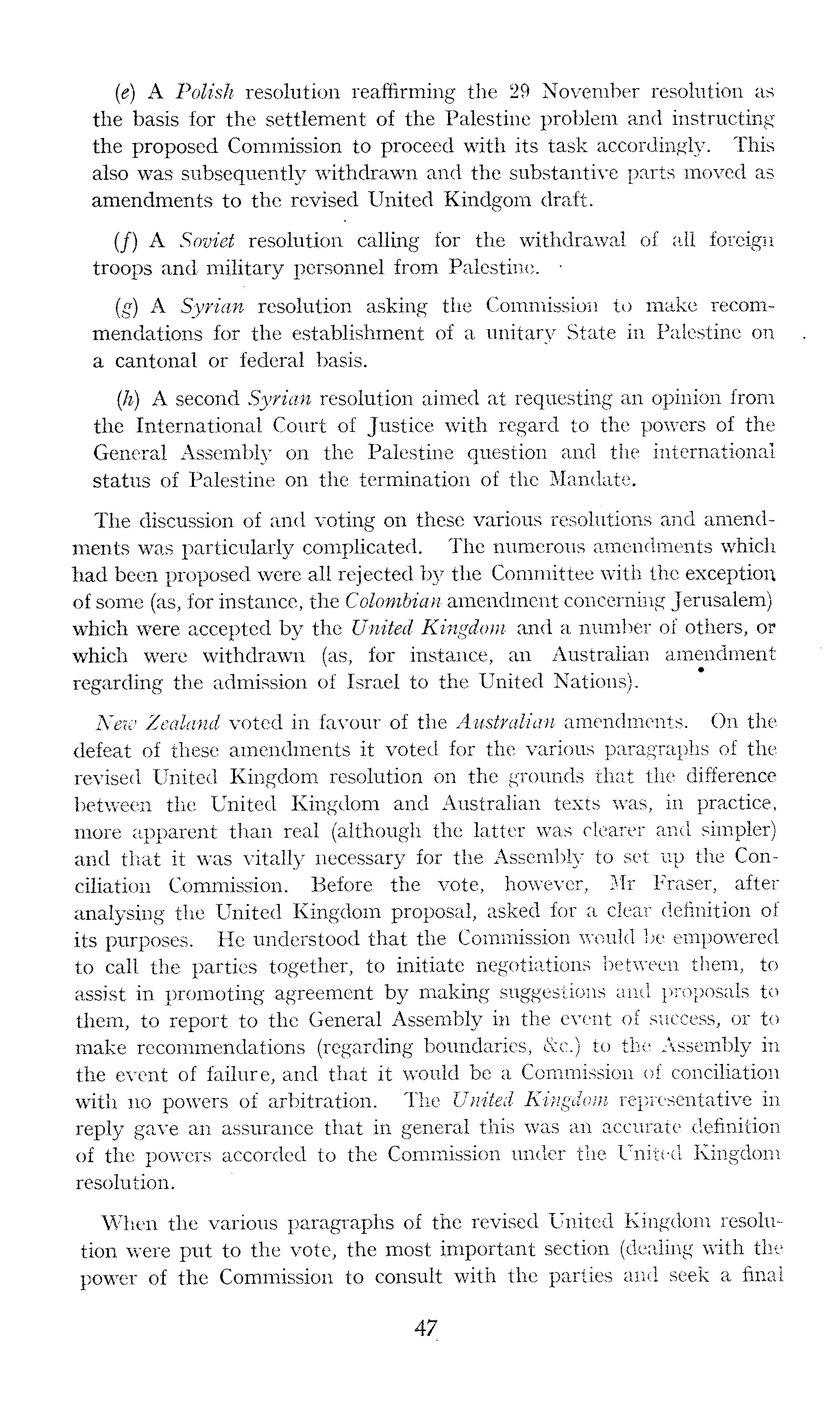 (e) A Polish resolution reaffirming the 29 November resolution as the basis for the settlement of the Palestine problem and instructing the proposed Commission to proceed with its task accordingly. This also was subsequently withdrawn and the substantive parts moved as amendments to the revised United Kindgom draft. (/) A Soviet resolution calling for the withdrawal of all foreign troops and military personnel from Palestine. • (g) A Syrian resolution asking the Commission to make recommendations for the establishment of a unitary State in Palestine on a cantonal or federal basis. (h) A second Syrian resolution aimed at requesting an opinion from the International Court of Justice with regard to the powers of the General Assembly on the Palestine question and the international status of Palestine on the termination of the Mandate. The discussion of and voting on these various resolutions and amendments was particularly complicated. The numerous amendments which had been proposed were all rejected by the Committee with the exception of some (as, for instance, the Colombian amendment concerning Jerusalem) which were accepted by the United Kingdom and a number of others, or which were withdrawn (as, for instance, an Australian amendment regarding the admission of Israel to the United Nations). New Zealand voted in favour of the Australian amendments. On the defeat of these amendments it voted for the various paragraphs of the revised United Kingdom resolution on the grounds that the difference between the United Kingdom and Australian texts was, in practice, more apparent than real (although the latter was clearer and simpler) and that it was vitally necessary for the Assembly to set up the Conciliation Commission. Before the vote, however, Mr Fraser, after analysing the United Kingdom proposal, asked for a clear definition of its purposes. He understood that the Commission would be empowered to call the parties together, to initiate negotiations between them, to assist in promoting agreement by making suggestions and proposals to them, to report to the General Assembly in the event of success, or to make recommendations (regarding boundaries, &c.) to the Assembly in the event of failure, and that it would be a Commission of conciliation with no powers of arbitration. The United Kingdom representative in reply gave an assurance that in general this was an accurate definition of the powers accorded to the Commission under the United Kingdom resolution. When the various paragraphs of the revised United Kingdom resolution 'were put to the vote, the most important section (dealing with the power of the Commission to consult with the parties and seek a final
