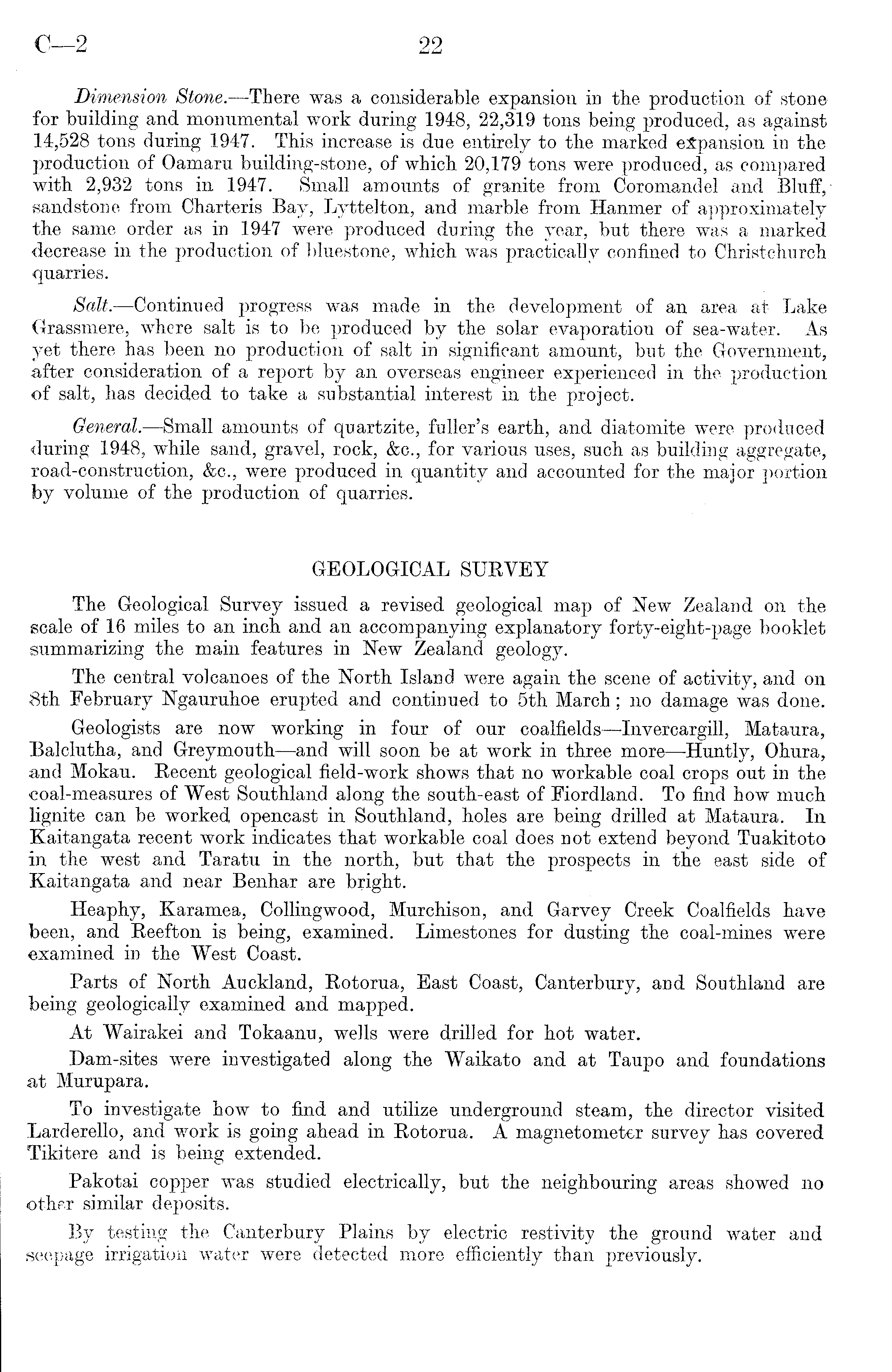 Dimension Stone. —There was a considerable expansion in the production of stone for building and monumental work during 1948, 22,319 tons being produced, as against 14,528 tons during 1947. This increase is due entirely to the marked expansion in the production of Oamaru building-stone, of which 20,179 tons were produced, as compared with 2,932 tons in 1947. Small amounts of granite from Coromandel and Bluff, sandstone from Charteris Bay, Lyttelton, and marble from Hanmer of approximately the same order as in 1947 were produced during the year, but there was a marked decrease in the production of Milestone, which was practically confined to Christchurch quarries. Salt. —Continued progress was made in the development of an area at Lake Grassmere, where salt is to be produced by the solar evaporation of sea-water. As yet there has been no production of salt in significant amount, but the Government, after consideration of a report by an overseas engineer experienced in the production of salt, has decided to take a substantial interest in the project. General. —Small amounts of quartzite, fuller's earth, and diatomite were produced during 1948, while sand, gravel, rock, &c, for various uses, such as building aggregate, road-construction, &c, were produced in quantity and accounted for the major portion by volume of the production of quarries. GEOLOGICAL SURVEY The Geological Survey issued a revised geological map of New Zealand on the scale of 16 miles to an inch and an accompanying explanatory forty-eight-page booklet summarizing the main features in New Zealand geology. The central volcanoes of the North Island were again the scene of activity, and on Bth February Ngauruhoe erupted and continued to sth March ; no damage was done. Geologists are now working in four of our coalfields —Invercargill, Mataura, Balclutha, and Greymouth—and will soon be at work in three more —Huntly, Ohura, and Mokau. Recent geological field-work shows that no workable coal crops out in the coal-measures of West Southland along the south-east of Fiordland. To find how much lignite can be worked opencast in Southland, holes are being drilled at Mataura. In Kaitangata recent work indicates that workable coal does not extend beyond Tuakitoto in the west and Taratu in the north, but that the prospects in the east side of Kaitangata and near Benhar are bright. Heaphy, Karamea, Collingwood, Murchison, and Garvey Creek Coalfields have been, and Reefton is being, examined. Limestones for dusting the coal-mines were examined in the West Coast. Parts of North Auckland, Rotorua, East Coast, Canterbury, and Southland are being geologically examined and mapped. At Wairakei and Tokaanu, wells were drilled for hot water. Dam-sites were investigated along the Waikato and at Taupo and foundations at Murupara. To investigate how to find and utilize underground steam, the director visited Larderello, and work is going ahead in Rotorua. A magnetometer survey has covered Tikitere and is being extended. Pakotai copper was studied electrically, but the neighbouring areas showed no other similar deposits. By testing the Canterbury Plains by electric restivity the ground water and seepage irrigation water were detected more efficiently than previously.