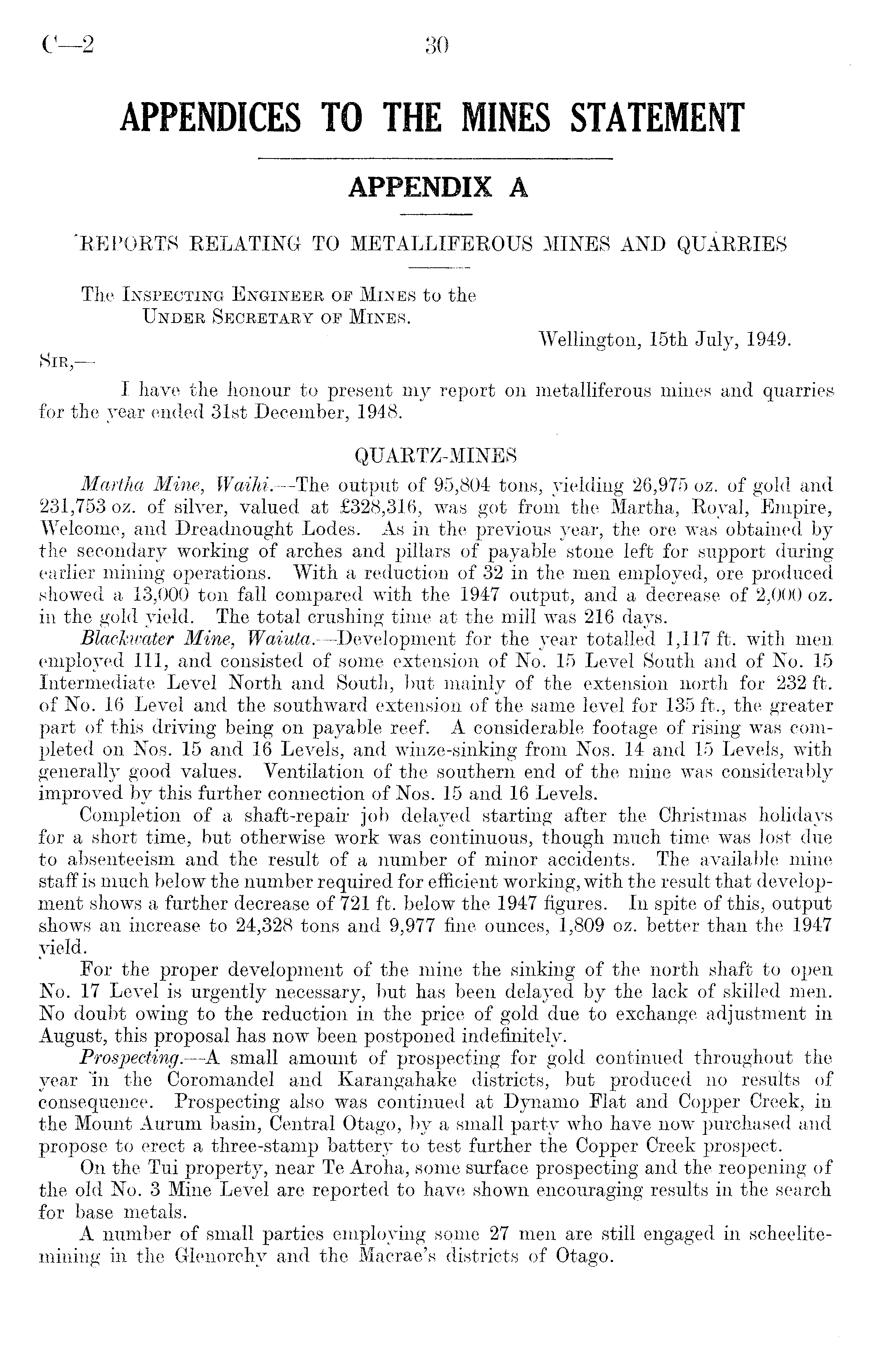 'REPORTS RELATING TO METALLIFEROUS MINES AND QUARRIES The Inspecting Engineer op Mines to the Under Secretary of Mines. Wellington, 15th July, 1949. Sir, — I have the honour to present my report on metalliferous mines and quarries for the year ended 31st December, 1948. QUARTZ-MINES Martha Mine, Waihi. —The output of 95,804 tons, yielding 26,975 oz. of gold and 231,753 oz. of silver, valued at £328,316, was got from the Martha, Royal, Empire, Welcome, and Dreadnought Lodes. As in the previous year, the ore was obtained by the secondary working of arches and pillars of payable stone left for support during earlier mining operations. With a reduction of 32 in the men employed, ore produced showed a 13,000 ton fall compared with the 1947 output, and a decrease of 2,000 oz. in the gold yield. The total crushing time at the mill was 216 days. Blackwater Mine, Waiuta. —Development for the year totalled 1,117 ft. with men employed 111, and consisted of some extension of No. 15 Level South and of No. 15 Intermediate Level North and South, but mainly of the extension north for 232 ft. of No. 16 Level and the southward extension of the same level for 135 ft., the greater part of this driving being on payable reef. A considerable footage of rising was completed on Nos. 15 and 16 Levels, and winze-sinking from Nos. 14 and 15 Levels, with generally good values. Ventilation of the southern end of the mine was considerably improved by this further connection of Nos. 15 and 16 Levels. Completion of a shaft-repair job delayed starting after the Christmas holidays for a short time, but otherwise work was continuous, though much time was lost due to absenteeism and the result of a number of minor accidents. The available mine staff is much below the number required for efficient working, with the result that development shows a further decrease of 721 ft. below the 1947 figures. In spite of this, output shows an increase to 24,328 tons and 9,977 fine ounces, 1,809 oz. better than the 1947 yield. For the proper development of the mine the sinking of the north shaft to open No. 17 Level is urgently necessary, but has been delayed by the lack of skilled men. No doubt owing to the reduction in the price of gold due to exchange adjustment in August, this proposal has now been postponed indefinitely. Prospecting.—A small amount of prospecting for gold continued throughout the year "in the Coromandel and Karangahake districts, but produced no results of consequence. Prospecting also was continued at Dynamo Flat and Copper Creek, in the Mount Aurum basin, Central Otago, by a small party who have now purchased and propose to erect a three-stamp battery to test further the Copper Creek prospect. On the Tui property, near Te Aroha, some surface prospecting and the reopening of the old No. 3 Mine Level are reported to have shown encouraging results in the search for base metals. A number of small parties employing some 27 men are still engaged in scheelitemining in the Glenorchy and the Macrae's districts of Otago.