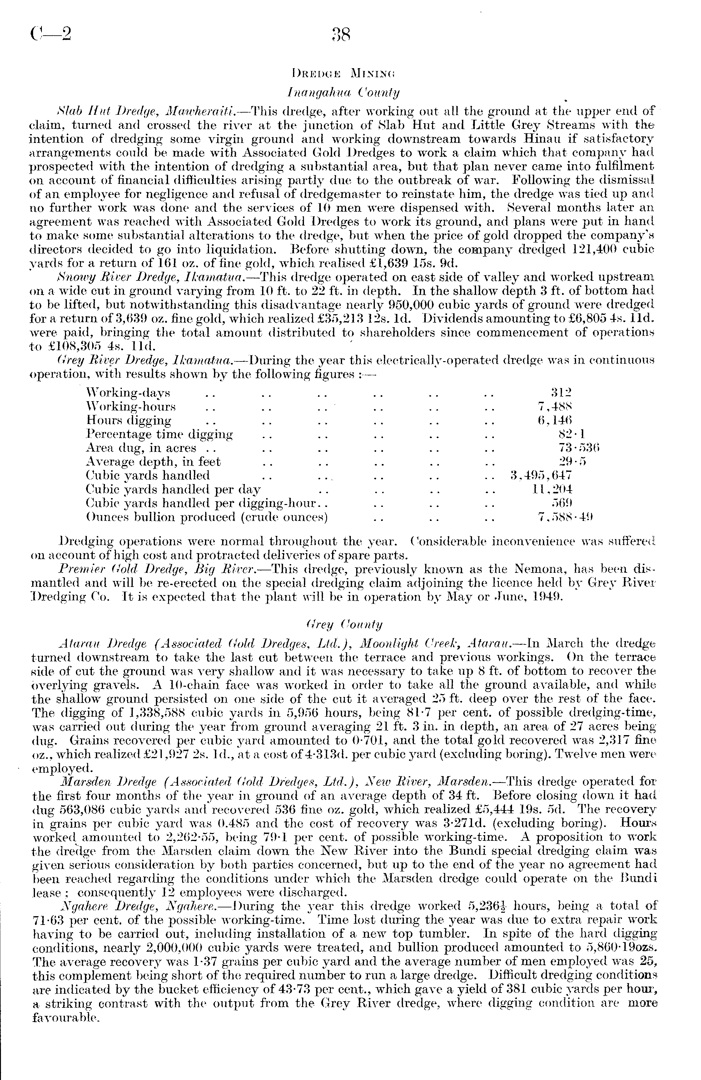 Dredge Mining Inangahua County Slab Hut Dredge, Mawheraiti. —This dredge, after working out all the ground at the upper end of claim, turned and crossed the river at the junction of Slab Hut and Little Grey Streams with the intention of dredging some virgin ground and working downstream towards Hinau if satisfactory arrangements could be made with Associated Gold Dredges to work a claim which that company had prospected with the intention of dredging a substantial area, but that plan never came into fulfilment on account of financial difficulties arising partly due to the outbreak of war. Following the dismissal of an employee for negligence and refusal of dredgemaster to reinstate him, the dredge was tied up and no further work was done and the services of 10 men were dispensed with. Several months later an agreement was reached with Associated Gold Dredges to work its ground, and plans were put in hand to make some substantial alterations to the dredge, but when the price of gold dropped the company's directors decided to go into liquidation. Before shutting down, the company dredged 121,400 cubic yards for a return of 161 oz. of fine gold, which realised £1,639 15s. 9d. Snowy River Dredge, Ikamatua. —This dredge operated on east side of valley and worked upstream on a wide cut in ground varying from 10 ft. to 22 ft. in depth. In the shallow depth 3 ft. of bottom had to be lifted, but notwithstanding this disadvantage nearly 950,000 cubic yards of ground were dredged for a return of 3,639 oz. fine gold, which realized £35,213 12s. Id. Dividends amounting to £6,805 4s. lid. were paid, bringing the total amount distributed to shareholders since commencement of operations to £108,305 4s. lid. Grey River Dredge, Ikamatua. —During the year this electrically-operated dredge was in continuous operation, with results shown by the following figures : Working-days .. ... .. .. .. .. 312 Working-hours .. .. .. .. .. .. 7,488 Hours digging .. .. .. .. .. .. 6,146 Percentage time digging .. ' .. .. .. .. 82-1 Area dug, in acres .. .. .. .. ... .. 73 • 536 Average depth, in feet .. .. .. .. .. 29-5 Cubic yards handled .. ... .. .. .. 3,495,647 Cubic yards handled per day .. .. .. .. 11,204 Cubic yards handled per digging-hour.. .. .. .. 569 Ounces bullion produced (crude ounces) .. .. .. 7,588-49 Dredging operations were normal throughout the year. Considerable inconvenience was suffered on account of high cost and protracted deliveries of spare parts. Premier Gold Dredge, Big River. —This dredge, previously known as the Nemona, has been dismantled and will be re-erected on the special dredging claim adjoining the licence held by Grey River Dredging Co. It is expected that the plant will be in operation by May or June, 1949. Grey County Atarau Dredge (Associated Gold Dredges, Ltd.), Moonlight Creek, Atarau. —ln March the dredge turned downstream to take the last cut between the terrace and previous workings. On the terrace side of cut the ground was very shallow and it was necessary to take up 8 ft. of bottom to recover the overlying gravels. A 10-chain face was worked in order to take all the ground available, and while the shallow ground persisted on one side of the cut it averaged 25 ft. deep over the rest of the face. The digging of 1,338,588 cubic yards in 5,956 hours, being 81-7 per cent, of possible dredging-time, was carried out during the year from ground averaging 21 ft. 3 in. in depth, an area of 27 acres being dug. Grains recovered per cubic yard amounted to 0-701, and the total gold recovered was 2,317 fine oz., which realized £21,927 2s. Id., at a cost of 4-313 d. per cubic yard (excluding boring). Twelve men were employed. Marsden Dredge (Associated Gold Dredges, Ltd.), New River, Marsden. —This dredge operated for the first four months of the year in ground of an average depth of 34 ft. Before closing down it had dug 563,086 cubic yards and recovered 536 fine oz. gold, which realized £5,444 19s. sd. The recovery in grains per cubic yard was 0.485 and the cost of recovery was 3-271 d. (excluding boring). Hours amounted to 2,262-55, being 79-1 per cent, of possible working-time. A proposition to work the dredge from the Marsden claim down the New River into the Bundi special dredging claim was given serious consideration by both parties concerned, but up to the end of the year no agreement had been reached regarding the conditions under which the Marsden dredge could operate on the Bundi lease ; consequently 12 employees were discharged. Ngahere Dredge, Ngahere. —During the year this dredge worked hours, being a total of 71-63 per cent, of the possible working-time. Time lost during the year was due to extra repair work having to be carried out, including installation of a new top tumbler. In spite of the hard digging conditions, nearly 2,000,000 cubic yards were treated, and bullion produced amounted to 5,860-19ozs. The average recovery was 1-37 grains per cubic yard and the average number of men employed was 25, this complement being short of the required number to run a large dredge. Difficult dredging conditions are indicated by the bucket efficiency of 43-73 per cent., which gave a yield of 381 cubic yards per hour, a striking contrast with the output from the Grey River dredge, where digging condition are more favourable.