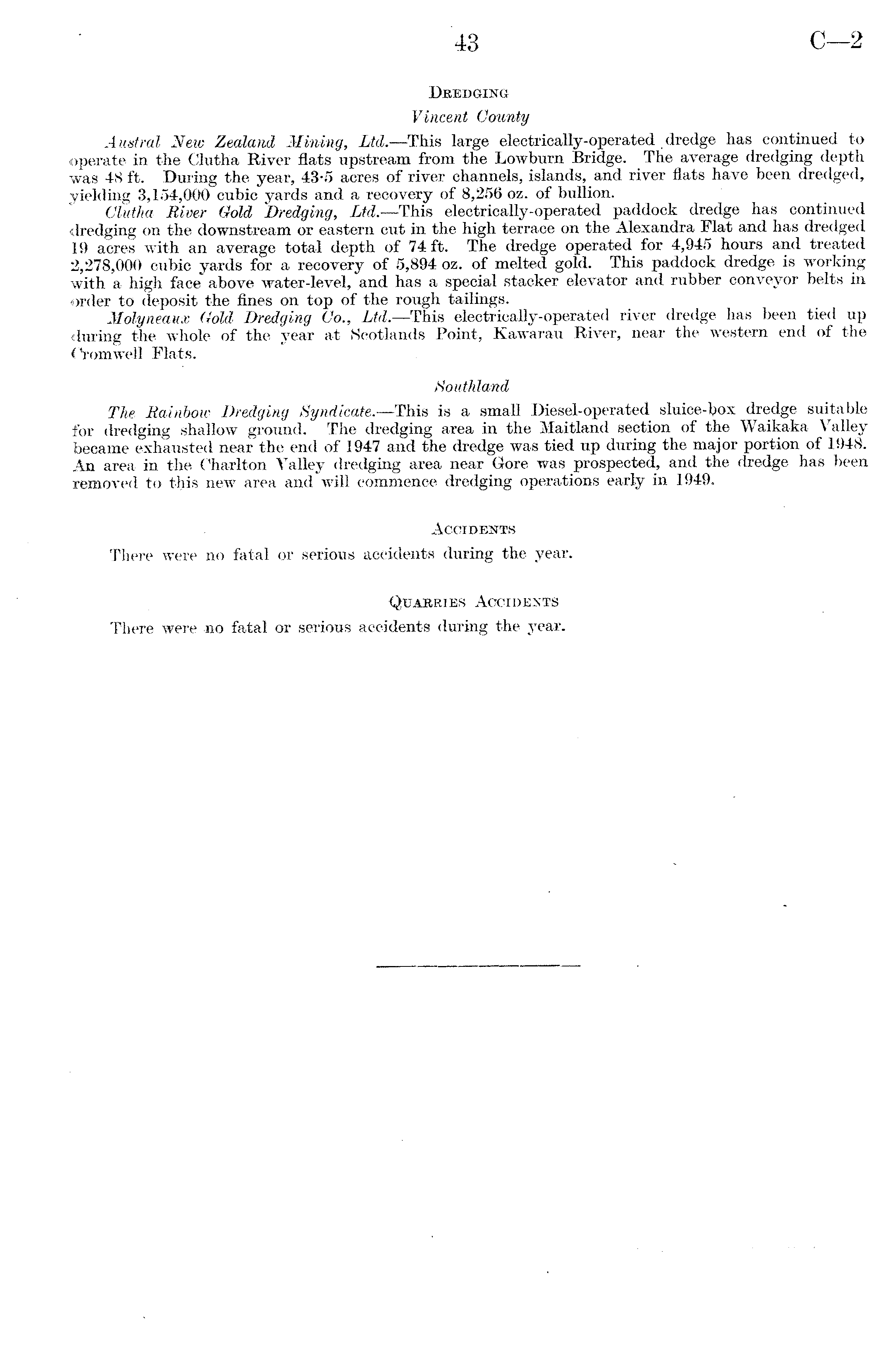 Dredging Vincent County A ustral New Zealand Mining, Ltd. —This large electrically-operated dredge has continued to operate in the Clutha River flats upstream from the Lowburn Bridge. The average dredging depth was 48 ft. During the year, 43-5 acres of river channels, islands, and river flats have been dredged, yielding 3,154,000 cubic yards and a recovery of 8,256 oz. of bullion. Clutha River Gold Dredging, Ltd. —This electrically-operated paddock dredge has continued dredging on the downstream or eastern cut in the high terrace on the Alexandra Flat and has dredged 19 acres with an average total depth of 74 ft. The dredge operated for 4,945 hours and treated 2,278,000 cubic yards for a recovery of 5,894 oz. of melted gold. This paddock dredge is working with a high face above water-level, and has a special stacker elevator and rubber conveyor belts in order to deposit the fines on top of the rough tailings. Molyneaux Gold Dredging Co., Ltd. —This electrically-operated river dredge has been tied up during the whole of the year at Scotlands Point, Kawarau River, near the western end of the Cromwell Flats. Southland The Rainbow Dredging Syndicate. —This is a small Diesel-operated sluice-box dredge suitable for dredging shallow ground. The dredging area in the Maitland section of the Waikaka Valley became exhausted near the end of 1947 and the dredge was tied up during the major portion of 1948. An area in the Charlton Valley dredging area near Gore was prospected, and the dredge has been removed to this new area and will commence dredging operations early in 1949. Accidents There were no fatal or serious accidents during the year. Quarries Accidents There were no fatal or serious accidents during the year.