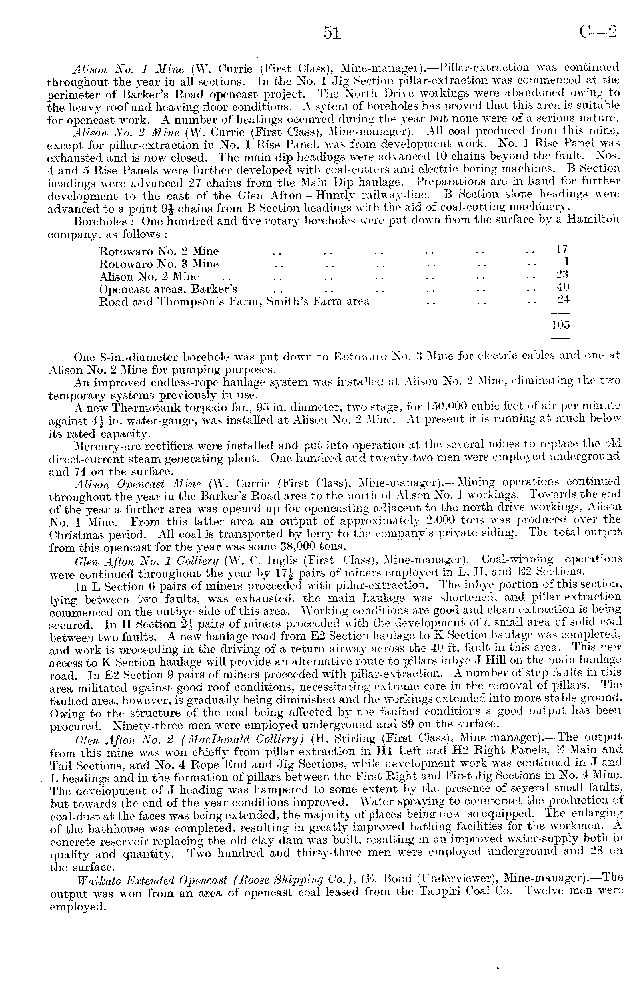 Alison No. 1 Mine (W. Currie (First Class), Mine-manager}.—Pillar-extraction was continued throughout the year in all sections. In the No. 1 Jig Section pillar-extraction was commenced at the perimeter of Barker's Road opencast project. The North Drive workings were abandoned owing to the heavy roof and heaving floor conditions. A sytem of boreholes has proved that this area is suitable for opencast work. A number of heatings occurred during the year but none were of a serious nature. Alison No. 2 Mine (W. Currie (First Class), Mine-manager).—All coal produced from this mine, except for pillar-extraction in No. 1 Rise Panel, was from development work. No. 1 Rise 'Panel was exhausted and is now closed. The main dip headings were advanced 10 chains beyond the fault. Nos. 4 and 5 Rise Panels were further developed with coal-cutters and electric boring-machines. B Section headings were advanced 27 chains from the Main Dip haulage. Preparations are in hand for further development to the east of the Glen Afton - Huntly railway-line. B Section slope headings were advanced to a point 9J chains from B Section headings with the aid of coal-cutting machinery. Boreholes : One hundred and five rotary boreholes were put down from the surface by a Hamilton company, as follows : Rotowaro No. 2 Mine .. .. .. .. *■ ..17 Rotowaro No. 3 Mine .. .. .. .. • • • • 1 Alison No. 2 Mine .. .. .. .. . > • • .. 23 Opencast areas, Barker's .. .. .. .. .. .. 40 Road and Thompson's Farm, Smith's Farm area .. .. . • 24 105 One 8-in.-diameter borehole was put down to Rotowaro No. 3 Mine for electric cables and one at Alison No. 2 Mine for pumping purposes. An improved endless-rope haulage system was installed at Alison No. 2 Mine, eliminating the two temporary systems previously in use. A new Thermotank torpedo fan, 95 in. diameter, two stage, for 150,000 cubic feet of air per minute against 4£ in. water-gauge, was installed at Alison No. 2 Mine. At present it is running at much below its rated capacity. Mercury-arc rectifiers were installed and put into operation at the several mines to replace the old direct-current steam generating plant. One hundred and twenty-two men were employed underground and 74 on the surface. Alison Opencast Mine (W. Currie (First Class), Mine-manager).—Mining operations continued throughout the year in the Barker's Road area to the north of Alison No. 1 workings. Towards the end of the year a further area was opened up for opencasting adjacent to the north drive workings, Alison No. 1 Mine. From this latter area an output of approximately 2,000 tons was produced over the Christmas period. All coal is transported by lorry to the company's private siding. The total output from this opencast for the year was some 38,000 tons. Glen Afton No. 1 Colliery (W. C. Inglis (First Class), Mine-manager). —Coal-winning operations were continued throughout the year by 17J pairs of miners employed in L, H, and E2 Sections. In L Section 6 pairs of miners proceeded with pillar-extraction. The inbye portion of this section, lying between two faults, was exhausted, the main haulage was shortened, and pillar-extraction commenced on the outbye side of this area. Working conditions are good and clean extraction is being secured. In H Section 2£ pairs of miners proceeded with the development of a small area of solid coal between two faults. A new haulage road from E2 Section haulage to K Section haulage was completed, and work is proceeding in the driving of a return airway across the 40 ft. fault in this area. This new access to K Section haulage will provide an alternative route to pillars inbye J Hill on the main haulage road. In E2 Section 9 pairs of miners proceeded with pillar-extraction. A number of step faults in this area militated against good roof conditions, necessitating extreme care in the removal of pillars. The faulted area, however, is gradually being diminished and the workings extended into more stable ground. Owing to the structure of the coal being affected by the faulted conditions a good output has been procured. Ninety-three men were employed underground and 89 on the surface. Glen Afton No. 2 (Mac Donald Colliery) (H. Stirling (First Class), Mine-manager).—The output from this mine was won chiefly from pillar-extraction in HI Left and H2 Right Panels, E Main and Tail Sections, and No. 4 Rope End and Jig Sections, while development work was continued in J and L headings and in the formation of pillars between the First Right and First Jig Sections in No. 4 Mine. The development of J heading was hampered to some extent by the presence of several small faults, but towards the end of the year conditions improved. Water spraying to counteract the production of coal-dust at the faces was being extended, the majority of places being now so equipped. The enlarging of the bathhouse was completed, resulting in greatly improved bathing facilities for the workmen. A concrete reservoir replacing the old clay dam was built, resulting in an improved water-supply both m quality and quantity. Two hundred and thirty-three men were employed underground and 28 on the surface. Waikato Extended Opencast (Boose Shipping Co.), (E. Bond (Underviewer), Mine-manager).—The output was won from an area of opencast coal leased from the Taupiri Coal Co. Twelve men were employed.