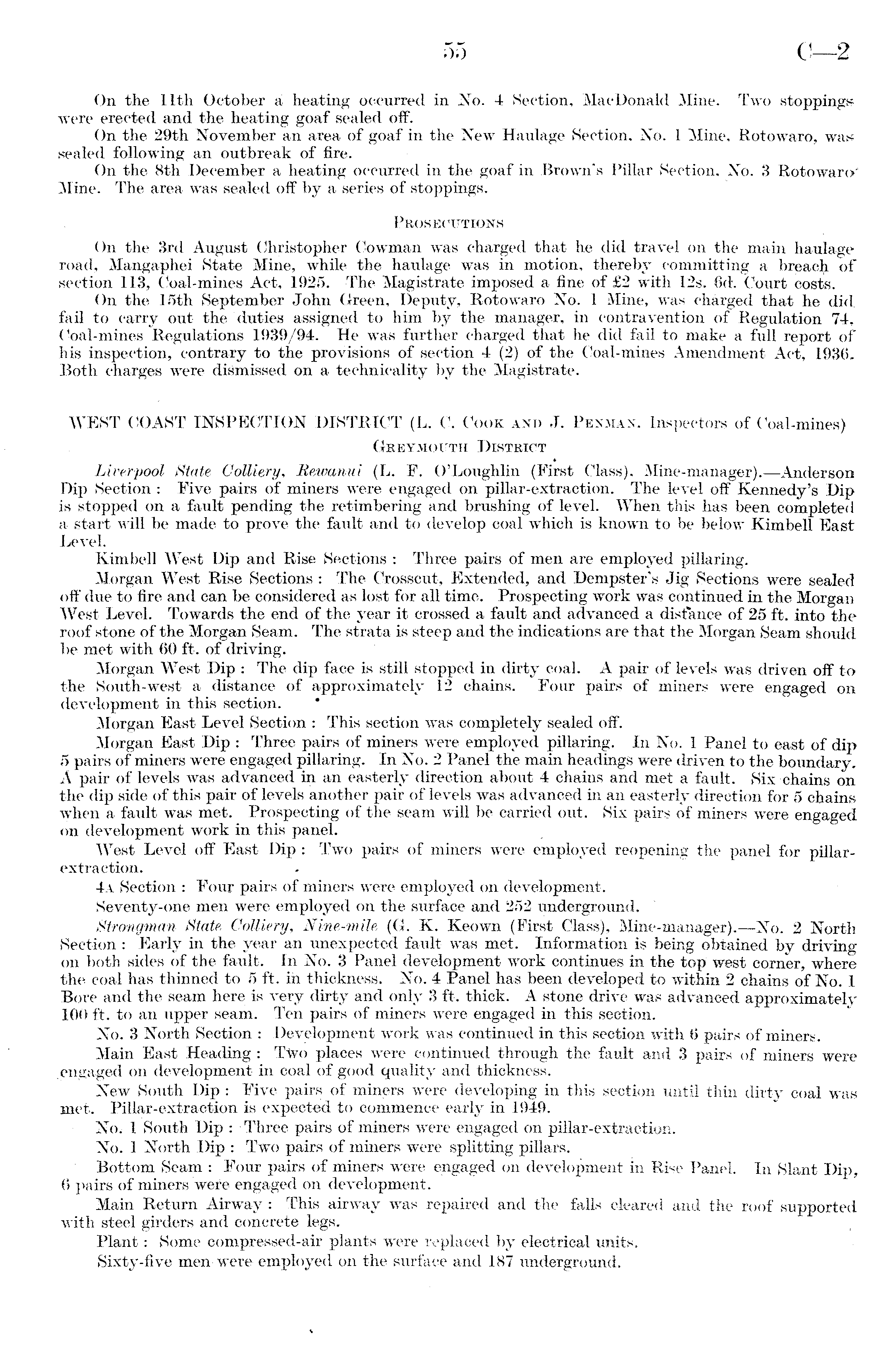 On the 11th October a heating occurred in No. 4 Section, Mac Donald Mine. Two stoppings were erected and the heating goaf sealed off. On the 29th November an area of goaf in the New Haulage Section. No. 1 Mine, Rotowaro, was sealed following an outbreak of fire. On the Bth December a heating occurred in the goaf in Brown's Pillar Section, No. 3 Rotowaro' Mine. The area was sealed off by a series of stoppings. Prosecutions On the 3rd August Christopher Cowman was charged that he did travel on the main haulage road, Mangaphei State Mine, while the haulage was in motion, thereby committing a breach of section 113, Coal-mines Act, 1925. The Magistrate imposed a fine of £2 with 12s. 6ck Court costs. On the 15th September John Green, Deputy, Rotowaro No. 1 Mine, was charged that he did fail to carry out the duties assigned to him by the manager, in contravention of Regulation 74, Coal-mines Regulations 1939/94. He was further charged that he did fail to make a full report of his inspection, contrary to the provisions of section 4 (2) of the Coal-mines Amendment Act, 1936. Both charges were dismissed on a technicality by the Magistrate. WEST COAST INSPECTION DISTRICT (L. C. Cook and J. Penman. Inspectors of Coal-mines) Gkeymoitth District Liverpool State Colliery, Rewanui (L. F. O'Loughlin (First Class), Mine-manager).—Anderson Dip Section : Five pairs of miners were engaged on pillar-extraction. The level off Kennedy's Dip is stopped on a fault pending the retimbering and brushing of level. When this has been completed a start will be made to prove the fault and to develop coal which is known to be below Kimbell East Level. Kimbell West Dip and Rise Sections : Three pairs of men are employed pillaring. Morgan West Rise Sections : The Crosscut, Extended, and Dempster's Jig Sections were sealed off due to fire and can be considered as lost for all time. Prospecting work was continued in the Morgan West Level. Towards the end of the year it crossed a fault and advanced a distance of 25 ft. into the roof stone of the Morgan Seam. The strata is steep and the indications are that the Morgan Seam should be met with 60 ft. of driving. Morgan West Dip : The dip face is still stopped in dirty coal. A pair of levels was driven off to the South-west a distance of approximately 12 chains. Four pairs of miners were engaged on development in this section. Morgan East Level Section : This section was completely sealed off. Morgan East Dip : Three pairs of miners were employed pillaring. In No. 1 Panel to east of dip 5 pairs of miners were engaged pillaring. In No. 2 Panel the main headings were driven to the boundary. A pair of levels was advanced in an easterly direction about 4 chains and met a fault. Six chains on the dip side of this pair of levels another pair of levels was advanced in an easterly direction for 5 chains when a fault was met. Prospecting of the seam will be carried out. Six pairs of miners were engaged on development work in this panel. West Level off East Dip : Two pairs of miners were employed reopening the panel for pillarextraction. 4a Section : Four pairs of miners were employed on development. Seventy-one men were employed on the surface and 252 underground. Strongman State Colliery, Nine-mile (G. K. Keown (First Class), Mine-manager).—No. 2 North Section : Early in the year an unexpected fault was met. Information is being obtained by driving on both sides of the fault. In No. 3 Panel development work continues in the top'west corner, where the coal has thinned to 5 ft. in thickness. No. 4 Panel has been developed to within 2 chains of No. 1 Bore and the seam here is very dirty and only 3 ft. thick. A stone drive was advanced approximately 100 ft. to an upper seam. Ten pairs of miners were engaged in this section. No. 3 North Section : Development work was continued in this section with 6 pairs of miners. Main East Heading : Two places were continued through the fault and 3 pairs of miners were engaged on development in coal of good quality and thickness. New South Dip : Five pairs of miners were developing in this section until thin dirty coal was met. Pillar-extraction is expected to commence early in 1949. No. 1 South Dip : Three pairs of miners were engaged on pillar-extraction. No. 1 North Dip : Two pairs of miners were splitting pillars. Bottom Seam : Four pairs of miners were engaged on development in Rise Panel. In Slant Dip, 6 pairs of miners were engaged on development. Main Return Airway : This airway was repaired and the falls cleared and the roof supported with steel girders and concrete legs. Plant : Some compressed-air plants were replaced by electrical units. Sixty-five men-were employed on the surface and 187 underground.
