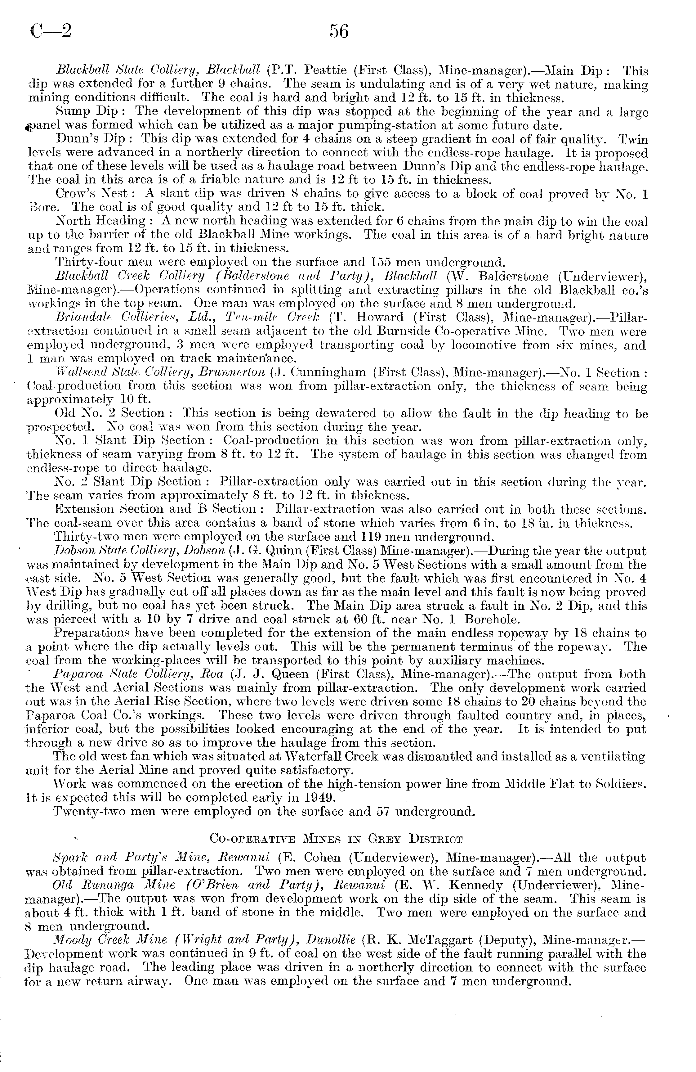 Blackball State Colliery, Blackball (P.T. Peattie (First Class), Mine-manager).—Main Dip : This dip was extended for a further 9 chains. The seam is undulating and is of a very wet nature, making mining conditions difficult. The coal is hard and bright and 12 ft. to 15 ft. in thickness. Sump Dip : The development of this dip was stopped at the beginning of the year and a large ipanel was formed which can be utilized as a major pumping-station at some future date. Dunn's Dip : This dip was extended for 4 chains on a steep gradient in coal of fair quality. Twin levels were advanced in a northerly direction to connect with the endless-rope haulage. It is proposed that one of these levels will be used as a haulage road between Dunn's Dip and the endless-rope haulage. The coal in this area is of a friable nature and is 12 ft to 15 ft. in thickness. Crow's Nest: A slant dip was driven 8 chains to give access to a block of coal proved by No. 1 Bore. The coal is of good quality and 12 ft to 15 ft. thick. North Heading : A new north heading was extended for 6 chains from the main dip to win the coal up to the barrier of the old Blackball Mine workings. The coal in this area is of a hard bright nature and ranges from 12 ft. to 15 ft. in thickness. Thirty-four men were employed on the surface and 155 men underground. Blackball Greek Colliery (Balderstone and Party), Blackball (W. Balderstone (Underviewer), Mine-manager). —Operations continued in splitting and extracting pillars in the old Blackball co.'s workings in the top seam. One man was employed on the surface and 8 men underground. Briandale Collieries, Ltd., Ten-mile Creek (T. Howard (First Class), Mine-manager).—Pillar-extraction continued in a small seam adjacent to the old Burnside Co-operative Mine. Two men were employed underground, 3 men were employed transporting coal by locomotive from six mines, and 1 man was employed on track maintenance. Wallsend State. Colliery, Brunnerton (J. Cunningham (First Class), Mine-manager).—No. 1 Section : Coal-production from this section was won from pillar-extraction only, the thickness of seam being approximately 10 ft. Old No. 2 Section : This section is being dewatered to allow the fault in the dip heading to be prospected. No coal was won from this section during the year. No. 1 Slant Dip Section : Coal-production in this section was won from pillar-extraction only, thickness of seam varying from 8 ft. to 12 ft. The system of haulage in this section was changed from endless-rope to direct-haulage. No. 2 Slant Dip Section : Pillar-extraction only was carried out in this section during the year. The seam varies from approximately 8 ft. to 12 ft. in thickness. Extension Section and B Section : Pillar-extraction was also carried out in both these sections. The coal-seam over this area contains a band of stone which varies from 6 in. to 18 in. in thickness. Thirty-two men were employed on the surface and 119 men underground. Dobson State Colliery, Dobson (J. G. Quinn (First Class) Mine-manager).—During the year the output was maintained by development in the Main Dip and No. 5 West Sections with a small amount from the east side. No. 5 West Section was generally good, but the fault which was first encountered in No. 4 AVest Dip has gradually cut off all places down as far as the main level and this fault is now being proved by drilling, but no coal has yet been struck. The Main Dip area struck a fault in No. 2 Dip, and this was pierced with a 10 by 7 drive and coal struck at 60 ft. near No. 1 Borehole. Preparations have been completed for the extension of the main endless ropeway by 18 chains to a point where the dip actually levels out. This will be the permanent terminus of the ropeway. The coal from the working-places will be transported to this point by auxiliary machines. Paparoa State Colliery, Boa (J. J. Queen (First Class), Mine-manager).—The output from both the West and Aerial Sections was mainly from pillar-extraction. The only development work carried out was in the Aerial Rise Section, where two levels were driven some 18 chains to 20 chains beyond the Paparoa Coal Co.'s workings. These two levels were driven through faulted country and, in places, inferior coal, but the possibilities looked encouraging at the end of the year. It is intended to put through a new drive so as to improve the haulage from this section. The old west fan which was situated at Waterfall Creek was dismantled and installed as a ventilating unit for the Aerial Mine and proved quite satisfactory. Work was commenced on the erection of the high-tension power line from Middle Flat to Soldiers. It is expected this will be completed early in 1949. Twenty-two men were employed on the surface and 57 underground. Co-operative Mines in Grey District Spark and Party's Mine, Rewanui (E. Cohen (Underviewer), Mine-manager).—All the output was obtained from pillar-extraction. Two men were employed on the surface and 7 men underground. Old Bunanga Mine (O'Brien and Party), Rewanui (E. W. Kennedy (Underviewer), Mine-manager).-—The output was won from development work on the dip side of the seam. This seam is about 4 ft. thick with 1 ft. band of stone in the middle. Two men were employed on the surface and 8 men underground. Moody Creek Mine (Wright and Party), Dunollie (R. K. McTaggart (Deputy), Mine-managtr.— Development work was continued in 9 ft. of coal on the west side of the fault running parallel with the dip haulage road. The leading place was driven in a northerly direction to connect with the surface for a new return airway. One man was employed on the surface and 7 men underground.