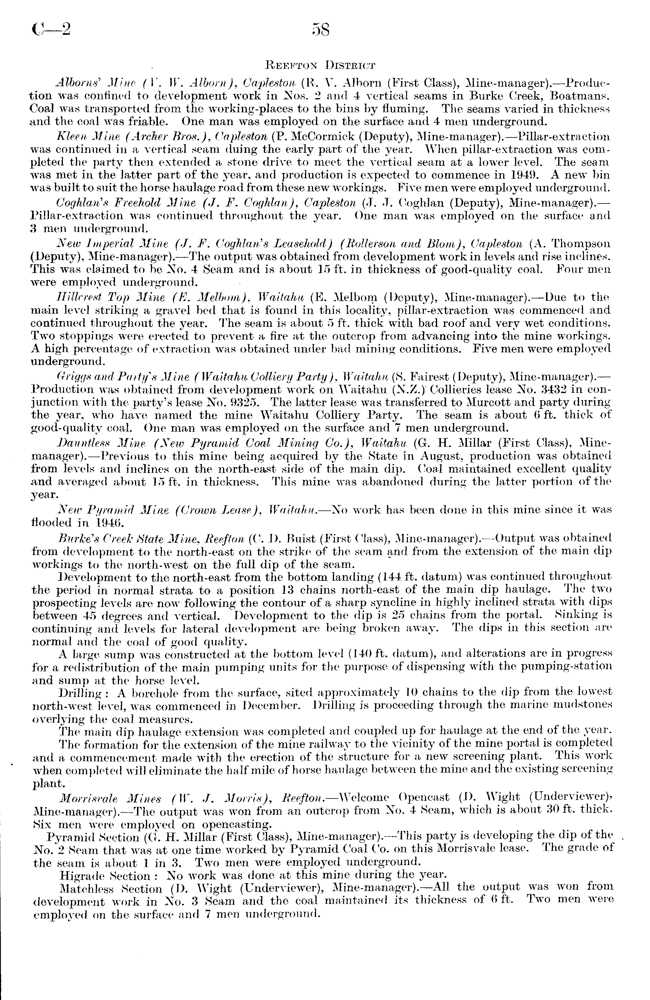 Reefton District Attorns' Mine (V. W. Alborn), Capleston (R. V. Alborn (First Class), Mine-manager).—Produc-tion was confined to development work in Nos. 2 and 4 vertical seams in Burke Creek, Boatmans. Coal Avas transported from the working-places to the bins by fluming. The seams varied in thickness and the coal was friable. One man was employed on the surface and 4 men underground. Kleen Mine (Archer Bros.), Capleston (P. McCormick (Deputy), Mine-manager).—Pillar-extraction was continued in a vertical seam duing the early part of the year. When pillar-extraction was completed the party then extended a stone drive to meet the vertical seam at a lower level. The seam was met in the latter part of the year, and production is expected to commence in 1949. A new bin was built to suit the horse haulage road from these new workings. Five men were employed underground. Coghlan's Freehold Mine (J. F. Coghlan), Capleston (.J. J. Coghlan (Deputy), Mine-manager).—■ Pillar-extraction was continued throughout the year. One man was employed on the surface and 3 men underground. New Imperial Mine (J. F. Coghlan's Leasehold) (Rollerson and Blom), Capleston (A. Thompson (Deputy), Mine-manager).—The output was obtained from development work in levels and rise inclines. This was claimed to be No. 4 Seam and is about 15 ft. in thickness of good-quality coal. Four men were employed underground. Hilk rest Top Mine (E. Melbom), Waitahu (E. Melbom (Deputy), Mine-manager).—Due to the main level striking a gravel bed that is found in this locality, pillar-extraction was commenced and continued throughout the year. The seam is about .5 ft. thick with bad roof and very wet conditions. Two stoppings were erected to prevent a fire at the outcrop from advancing into the mine workings. A high percentage of extraction was obtained under bad mining conditions. Five men were employed underground. Griggs and Patty's Mine (Waitahu Colliery Party), Waitahu (S. Fairest (Deputy), Mine-manager).—■ Production was obtained from development work on Waitahu (N.Z.) Collieries lease No. 3432 in conjunction with the party's lease No. 9325. The latter lease was transferred to Murcott and party during the year, who have named the mine Waitahu Colliery Party. The seam is about 6 ft. thick of good-quality coal. One man was employed on the surface and 7 men underground. Dauntless Mine (New Pyramid Coal Mining Co.), Waitahu (G. H. Millar (First Class), Minemanager).—Previous to this mine being acquired by the State in August, production was obtained from levels and inclines on the north-east side of the main dip. Coal maintained excellent quality and averaged about 15 ft. in thickness. This mine was abandoned during the latter portion of the 3^ear. New Pyramid Mine (Crown Lease), Waitahu. —No work has been done in this mine since it was flooded in 1946. Burke's Creek State Mine, Reefton (C. D. Buist (First ("lass), Mine-manager).—Output was obtained from development to the north-east on the strike of the seam and from the extension of the main dip workings to the north-west on the full dip of the seam. Development to the north-east from the bottom landing (144 ft. datum) was continued throughout the period in normal strata to a position 13 chains north-east of the main dip haulage. The two prospecting levels are now following the contour of a sharp syncline in highly inclined strata with dips between 45 degrees and vertical. Development to the dip is 25 chains from the portal. Sinking is continuing and levels for lateral development are being broken away. The dips in this section are normal and the coal of good quality. A large sump was constructed at the bottom level (140 ft. datum), and alterations are in progress for a redistribution of the main pumping units for the purpose of dispensing with the pumping-station and sump at the horse level. Drilling : A borehole from the surface, sited approximately 10.chains to the dip from the lowest north-west level, was commenced in December. Drilling is proceeding through the marine mudstones overlying the coal measures. The main dip haulage extension was completed and coupled up for haulage at the end of the year. The formation for the extension of the mine railway to the vicinity of the mine portal is completed and a commencement made with the erection of the structure for a new screening plant. This work when completed will eliminate the half mile of horse haulage between the mine and the existing screening plant. v Morrisvale Mines (W. J. Morris), Reefton.— Welcome Opencast (D. Wight (Underviewer), Mine-manager).—The output was won from an outcrop from No. 4 Seam, which is about 30 ft. thick. Six men were employed on opencasting. Pyramid Section (G. H. Millar (First Class), Mine-manager).—This party is developing the dip of the No. 2 Seam that was at one time worked by Pyramid Coal Co. on this Morrisvale lease. The grade of the seam is about lin 3. Two men were employed underground. Higrade Section : No work was done at this mine during the year. Matchless Section (D. Wight (Underviewer), Mine-manager). —All the output was won from development work in No. 3 Seam and the coal maintained its thickness of 6 ft. Two men were employed on the surface and 7 men underground.