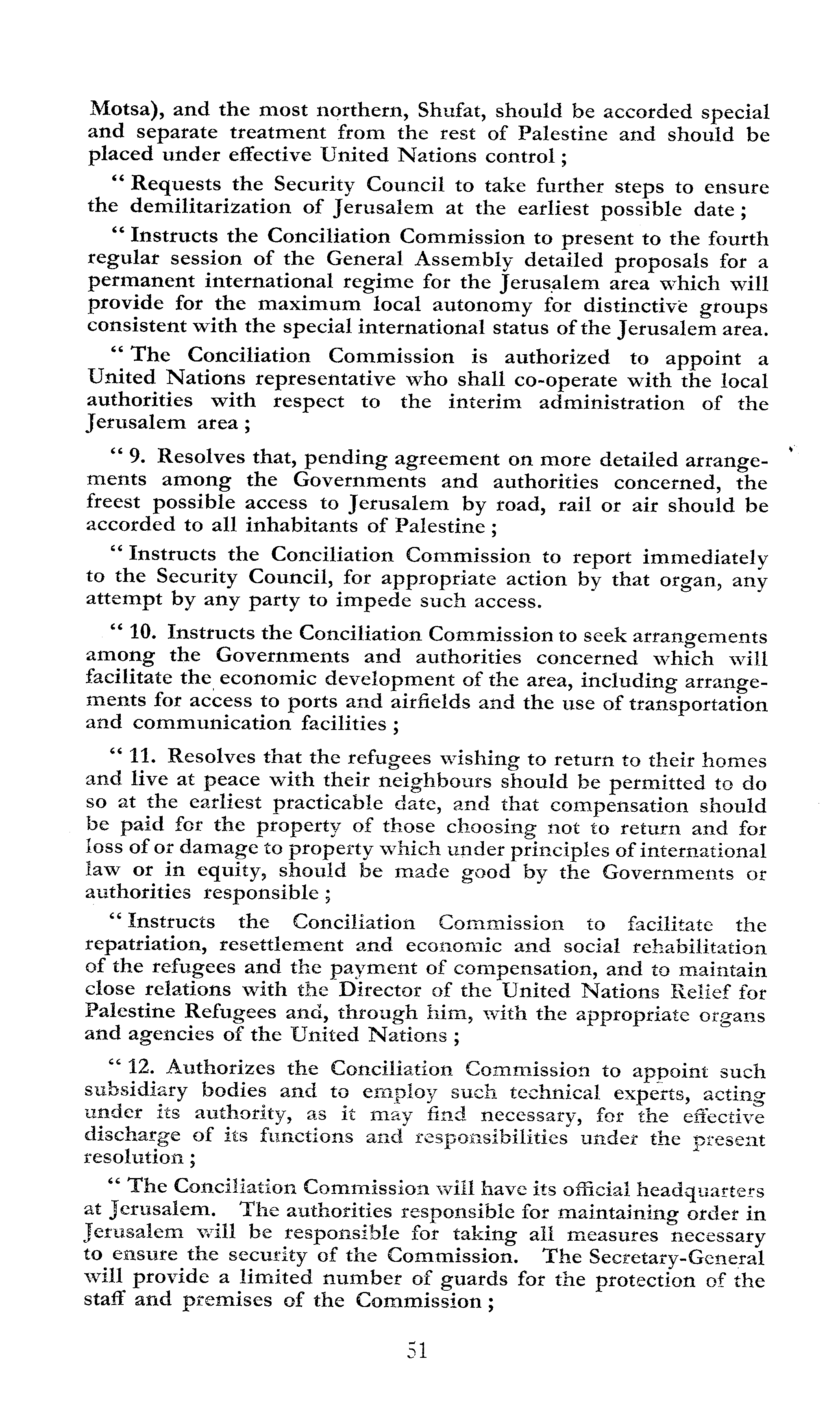 Motsa), and the most northern, Shufat, should be accorded special and separate treatment from the rest of Palestine and should be placed under effective United Nations control; " Requests the Security Council to take further steps to ensure the demilitarization of Jerusalem at the earliest possible date; ** Instructs the Conciliation Commission to present to the fourth regular session of the General Assembly detailed proposals for a permanent international regime for the Jerusalem area which will provide for the maximum local autonomy for distinctive groups consistent with the special international status of the Jerusalem area. " The Conciliation Commission is authorized to appoint a United Nations representative who shall co-operate with the local authorities with respect to the interim administration of the Jerusalem area; " 9. Resolves that, pending agreement on more detailed arrangements among the Governments and authorities concerned, the freest possible access to Jerusalem by road, rail or air should be accorded to all inhabitants of Palestine ; " Instructs the Conciliation Commission to report immediately to the Security Council, for appropriate action by that organ, any attempt by any party to impede such access. "10. Instructs the Conciliation Commission to seek arrangements among the Governments and authorities concerned which will facilitate the economic development of the area, including arrangements for access to ports and airfields and the use of transportation and communication facilities ; " 11. Resolves that the refugees wishing to return to their homes and live at peace with their neighbours should be permitted to do so at the earliest practicable date, and that compensation should be paid for the property of those choosing not to return and for loss of or damage to property which under principles of international law or in equity, should be made good by the Governments or authorities responsible ; " Instructs the Conciliation Commission to facilitate the repatriation, resettlement and economic and social rehabilitation of the refugees and the payment of compensation, and to maintain close relations with the Director of the United Nations Relief for Palestine Refugees and, through him, with the appropriate organs and agencies of the United Nations ; " 12. Authorizes the Conciliation Commission to appoint such subsidiary bodies and to employ such technical experts, acting under its authority, as it may find necessary, for the effective discharge of its functions and responsibilities under the present resolution; " The Conciliation Commission will have its official headquarters at Jerusalem. The authorities responsible for maintaining order in Jerusalem will be responsible for taking all measures necessary to ensure the security of the Commission. The Secretary-General will provide a limited number of guards for the protection of the staff and premises of the Commission;