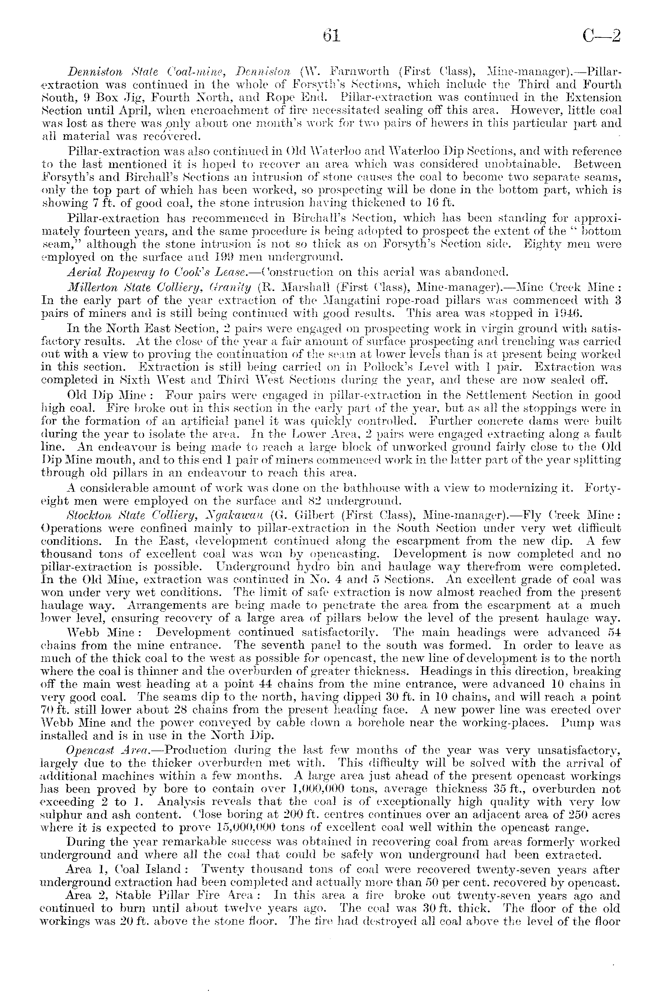 Denniston State Goal-mine,, Denniston (W. Farnworth (First Class), Mine-manager).—Pillar-extraction was continued in the whole of Forsyth's Sections, which include the Third and Fourth South, 9 Box Jig, Fourth North, and Rope End. Pillar-extraction was continued in the Extension Section until April, when encroachment of fire necessitated sealing off this area. However, little coal was lost as there was ,only about one month's work for two pairs of hewers in this particular part and all material was recovered. Pillar-extraction was also continued in Old Waterloo and Waterloo Dip Sections, and with reference to the last mentioned it is hoped to recover an area which was considered unobtainable. Between Forsyth's and Birchall's Sections an intrusion of stone causes the coal to become two separate seams, only the top part of which has been worked, so prospecting will be done in the bottom part, which is showing 7 ft. of good coal, the stone intrusion having thickened to 16 ft. Pillar-extraction has recommenced in Birchall's Section, which has been standing for approximately fourteen years, and the same procedure is being adopted to prospect the extent of the " bottom seam," although the stone intrusion is not so thick as on Forsyth's Section side. Eighty men were employed on the surface and 199 men underground. Aerial Ropeway to Cook's Lease. —Construction on this aerial was abandoned. Millerton State Colliery, Granity. (R. Marshall (First Class), Mine-manager).—Mine Creek Mine: In the early part of the year extraction of the Mangatini rope-road pillars was commenced with 3 pairs of miners and is still being continued with good results. This area was stopped in 1946. In the North East Section,2 pairs were engaged on prospecting work in virgin ground with satisfactory results. At the close of the year a fair amount of surface prospecting and trenching was carried out with a view to proving the continuation of the seam at lower levels than is at present being worked in this section. Extraction is still being carried on in Pollock's Level with 1 pair. Extraction was completed in Sixth West and Third West Sections during the year, and these are now sealed off. Old Dip Mine : Four pairs were engaged in pillar-extraction in the Settlement Section in good high coal. Fire broke out in this section in the early part of the year, but as all the stoppings were in for the formation of an artificial panel it was quickly controlled. Further concrete dams were built during the year to isolate the area. In the Lower Area, 2 pairs were engaged extracting along a fault line. An endeavour is being made to reach a large block of unworked ground fairly close to the Old Dip Mine mouth, and to this end 1 pair of miners commenced work in the latter part of the year splitting through old pillars in an endeavour to reach this area. A considerable amount of work was done on the bathhouse with a view to modernizing it. Fortyeight men were employed on the surface and 82 underground. Stockton State Colliery, Ngakawau (G. Gilbert (First Class), Mine-manager).—Fly Creek Mine: Operations were confined mainly to pillar-extraction in the South Section under very wet difficult conditions. In the East, development continued along the escarpment from the new dip. A few thousand tons of excellent coal was won by opencasting. Development is now completed and no pillar-extraction is possible. Underground hydro bin and haulage way therefrom were completed. In the Old Mine, extraction was continued in No. 4 and 5 Sections. An excellent grade of coal was won under very wet conditions. The limit of safe extraction is now almost reached from the present haulage way. Arrangements are being made to penetrate the area from the escarpment at a much lower level, ensuring recovery of a large area of pillars below the level of the present haulage way. Webb Mine : Development continued satisfactorily. The main headings were advanced 54 chains from the mine entrance. The seventh panel to the south was formed. In order to leave as much of the thick coal to the west as possible for opencast, the new line, of development is to the north where the coal is thinner and the overburden of greater thickness. Headings in this direction, breaking off the main west heading at a point 44 chains from the mine entrance, were advanced 10 chains in very good coal. The seams dip to the north, having dipped 30 ft. in 10 chains, and will reach a point 70 ft. still lower about 28 chains from the present heading face. A new power line was erected over Webb Mine and the power conveyed by cable down a borehole near the working-places. Pump was installed and is in use in the North Dip. Opencast Area. —Production during the last few months of the year was very unsatisfactory, largely due to the thicker overburden met with. This difficulty will be solved with the arrival of additional machines within a few months. A large area just ahead of the present opencast workings has been proved by bore to contain over 1,000,000 tons, average thickness 35 ft., overburden not exceeding 2 to 1. Analysis reveals that the coal is of exceptionally high quality with very low sulphur and ash content. Close boring at 200 ft. centres continues over an adjacent area of 250 acres where it is expected to prove 15,000,000 tons of excellent coal well within the opencast range. During the year remarkable success was obtained in recovering coal from areas formerly worked underground and where all the coal that could be safely won underground had been extracted. Area 1, Coal Island : Twenty thousand tons of coal were recovered twenty-seven years after underground extraction had been completed and actually more than 50 per cent, recovered by opencast. Area 2, Stable Pillar Fire Area : In this area a fire broke out twenty-seven years ago and continued to burn until about twelve years ago. The coal was 30 ft. thick. The floor of the old workings was 20 ft. above the stone floor. The fire had