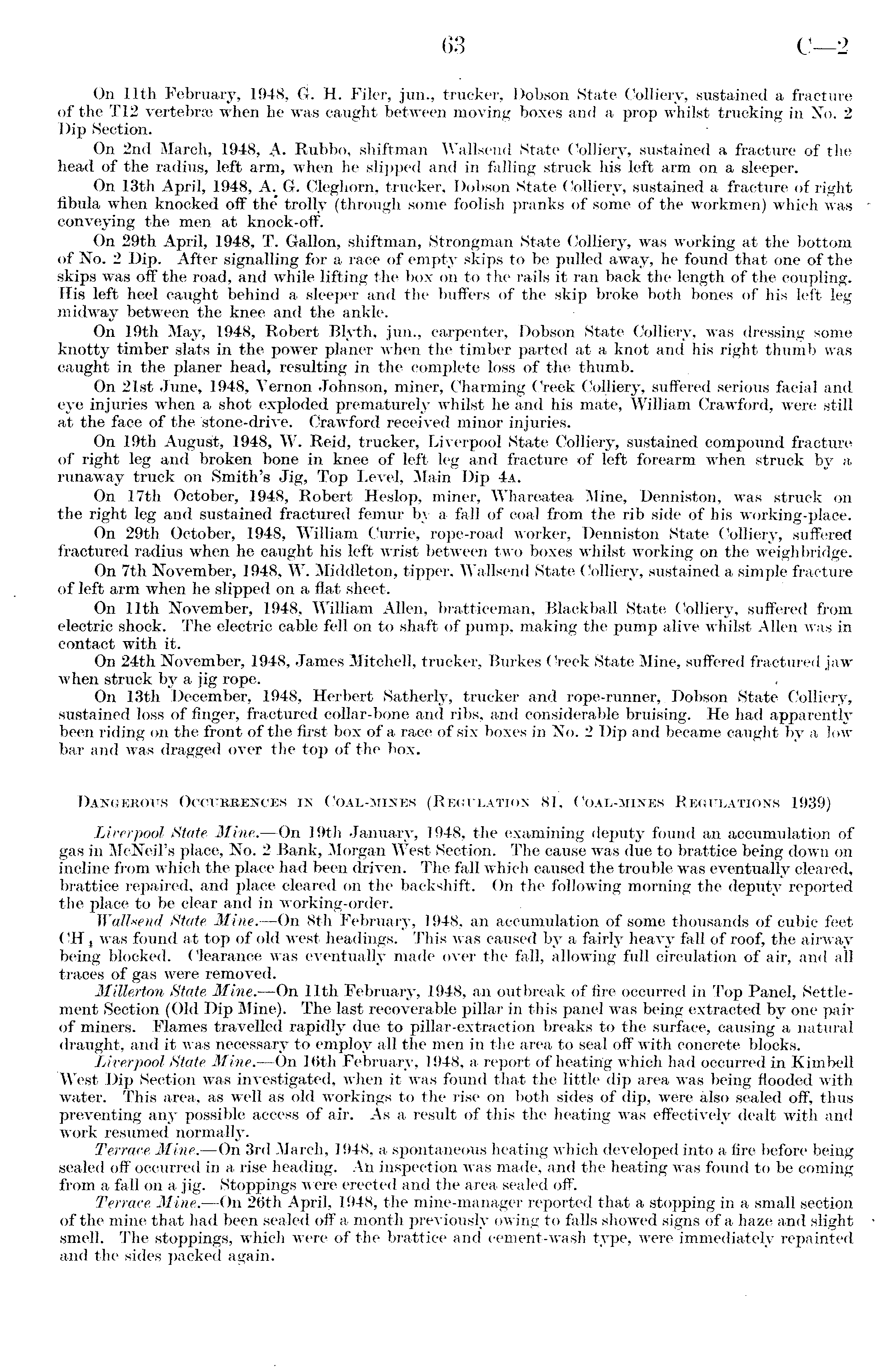 On 11th February, 1948, G. H. Filer, jun., trucker, Dobson State Colliery, sustained a fracture of the Tl2 vertebra* when he was caught between moving boxes and a prop whilst trucking in No. 2 Dip Section. On 2nd March, 1948, A. Rubbo, shiftman Wallsend State Colliery, sustained a fracture of the head of the radius, left arm, when he slipped and in falling struck his left arm on a sleeper. On 13th April, 1948, A. G. Cleghorn, trucker, Dobson State Colliery, sustained a fracture of right fibula when knocked off the trolly (through some foolish pranks of some of the workmen) which was conveying the men at knock-off. On 29th April, 1948, T. Gallon, shiftman, Strongman State Colliery, was working at the bottom of No. 2 Dip. After signalling for a race of empty skips to be pulled away, he found that one of the skips was off the road, and while lifting the box on to the rails it ran back the length of the coupling. His left heel caught behind a sleeper and the buffers of the skip broke both bones of his left leg midway between the knee and the ankle. On 19th May, 1948, Robert Blyth, jun., carpenter, Dobson State Colliery, was dressing some knotty timber slats in the power planer when the timber parted at a knot and his right thumb was caught in the planer head, resulting in the complete loss of the thumb. On 21st June, 1948, Vernon Johnson, miner, Charming Creek Colliery, suffered serious facial and eye injuries when a shot exploded prematurely whilst he and his mate, William Crawford, were still at the face of the stone-drive. CraAvford received minor injuries. On 19th August, 1948, W. Reid, trucker, Liverpool State Colliery, sustained compound fracture of right leg and broken bone in knee of left leg and fracture of left forearm when struck by a runaway truck on Smith's Jig, Top Level, Main Dip 4a. On 17th October, 1948, Robert Heslop, miner, Whareatea Mine, Denniston, was struck on the right leg and sustained fractured femur by a fall of coal from the rib side of his working-place. On 29th October, 1948, William Currie, rope-road worker, Denniston State Colliery, suffered fractured radius when he caught his left wrist between two boxes whilst working on the weighbridge. On 7th November, 1948, W. Middleton, tipper, Wallsend State Colliery, sustained a simple fracture of left arm when he slipped on a flat sheet. On 11th November, 1948, William Allen, bratticeman, Blackball State Colliery, suffered from electric shock. The electric cable fell on to shaft of pump, making the pump alive whilst Allen was in contact with it. On 24th November, 1948, James Mitchell, trucker, Burkes Creek State Mine, suffered fractured jaw when struck by a jig rope. On 13th December, 1948, Herbert Satherly, trucker and rope-runner,, Dobson State Colliery, sustained loss of finger, fractured collar-bone and ribs, and considerable bruising. He had apparently been riding on the front of the first box of a race of six boxes in No. 2 Dip and became caught by a low bar and was dragged over the top of the box. Dangerous Occurrences in Coal-mines (Regulation 81, Coal-mines Regulations 1939) Liverpool State Mine. —On 19th January, 1948, the examining deputy found an accumulation of gas in McNeil's place, No. 2 Bank, Morgan West Section. The cause was due to brattice being down on incline from which the place had been driven. The fall which caused the trouble was eventually cleared, brattice repaired, and place cleared on the backshift. On the following morning the deputy reported the place to be clear and in working-order. Wallsend State Mine. —On Bth February, 1948, an accumulation of some thousands of cubic feet CH 4 was found at top of old west headings. This was caused by a fairly heavy fall of roof, the airway being blocked. Clearance was eventually made over the fall, allowing full circulation of air, and all traces of gas were removed. Millerton State Mine. —On 11th February, 1948, an outbreak of fire occurred in Top Panel, Settlement Section (Old Dip Mine). The last recoverable pillar in this panel was being extracted by one pair of miners. Flames travelled rapidly due to pillar-extraction breaks to the surface, causing a natural draught, and it was necessary to employ all the men in the area to seal off with concrete blocks. Liverpool State Mine. —On Kith February, 1948, a- report of heating which had occurred in Kimbell W r est Dip Section was investigated, when it was found that the little dip area was being flooded with water. This area, as well as old workings to the rise on both sides of dip, were also sealed off, thus preventing any possible access of air. Asa result of this the heating was effectively dealt with and work resumed normalfy. Terrace Mine. —On 3rd March, 1948, a spontaneous heating which developed into a fire before being sealed off occurred in a rise heading. An inspection was made, and the heating was found to be coming from a fall on a jig. Stoppings were erected and the area sealed off. Terrace Mine. —On 26th April, 1948, the mine-manager reported that a stopping in a small section of the mine that had been sealed off a month previously owing to falls showed signs of a haze and slight smell. The stoppings, which were of the brattice and cement-wash type, were immediately repainted and the sides packed again.