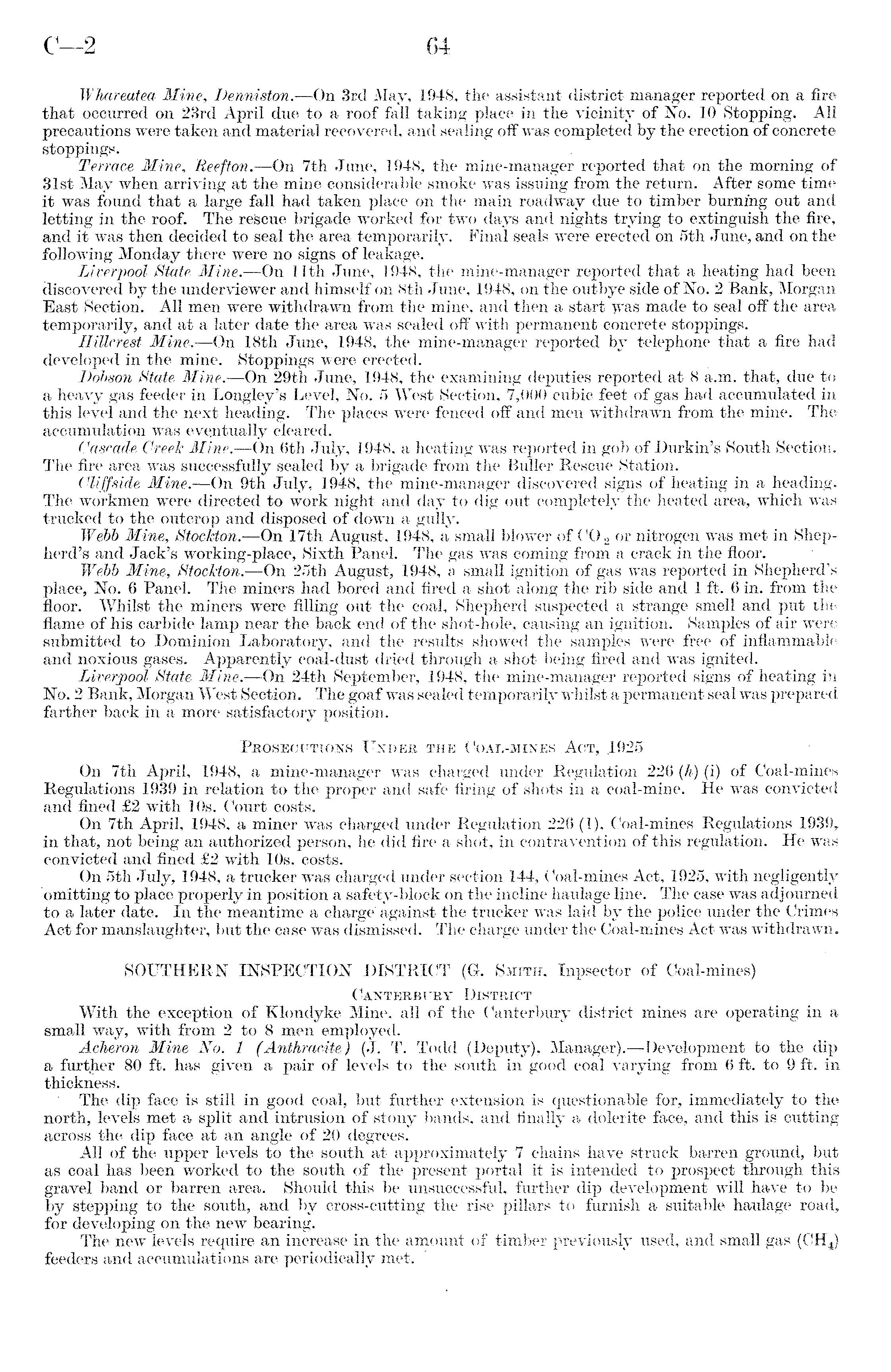 Whareatea Mine, Denniston. —On 3rd May, 1945, the assistant district manager reported on a fire that occurred on 23rd April due to a roof fall taking place in the vicinity of No. 10 Stopping. All precautions were taken and material recovered, and sealing off was completed by the erection of concrete stoppings. Terrace Mine, Reefton. —On 7th June, 1948, the mine-manager reported that on the morning of 31st May when arriving at the mine considerable smoke was issuing from the return. After some time it was found that a large fall had taken place on the main roadway due to timber burning out and letting in the roof. The rescue brigade worked for two days and nights trying to extinguish the fire, and it was then decided to seal the area temporarily. Final seals were erected on sth June, and on the following Monday there were no signs of leakage. Liverpool State Mine. —On 11th June, 1948, the mine-manager reported that a heating had been discovered by the underviewer and himself on Bth June, 1948, on the outbye side of No. 2 Bank, Morgan East Section. All men were withdrawn from the mine, and then a start was made to seal off the area temporarily, and at a later date the area was sealed off with permanent concrete stoppings. Hillcrest Mine. —On 18th June, 1948, the mine-manager reported by telephone that a fire had developed in the mine. Stoppings were erected. Dobson State Mine. —On 29th June, 1948, the examining deputies reported at 8 a.m. that, due to a heavy gas feeder in Longley's Level, No. 5 West Section, 7,000 cubic feet of gas had accumulated in this level and the next heading. The places were fenced off and men withdrawn from the mine. The accumulation was eventually cleared. Cascade Creek Mine. —On 6th July, 1948, a heating was reported in gob of Durkin's South Section. The fire area was successfully sealed by a brigade from the Buller Rescue Station. Cliff side Mine. —On 9th July, 1948, the mine-manager discovered signs of heating in a heading. The workmen were directed to work night and day to dig out completely the heated area, which was trucked to the outcrop and disposed of down a gully. Webb Mine, Stockton. —On 17th August, 1948, a small blower of C0 2 or nitrogen was met in Shepherd's and Jack's working-place, Sixth Panel. The gas was coming from a crack in the floor. Webb Mine, Stockton. —On 25th August, 1948, a small ignition of gas was reported in Shepherd's place, No. 6 Panel. The miners had bored and fired a shot along the rib side and 1 ft. 6 in. from the floor. Whilst the miners were filling out the coal, Shepherd suspected a strange smell and put ihe flame of his carbide lamp near the back end of the shot-hole, causing an ignition. Samples of air were submitted to Dominion Laboratory, and the results' showed the samples were free of inflammable and noxious gases. Apparently coal-dust dried through a shot being fired and was ignited. Liverpool State Mine. —On 24th September, 1948, the mine-manager reported signs of heating in No. 2 Bank, Morgan West Section. The goaf was sealed temporarily whilst a permanent seal was prepared farther back in a more satisfactory position. Prosecutions Under the Coal-mines Act, .1925 On 7th April, 1948, a mine-manager was charged under Regulation 226 (h) (i) of Coal-mines Regulations 1939 in relation to the proper and safe firing of shots in a coal-mine. He was convicted and fined £2 with 10s. Court costs. On 7th April, 1948, a miner was charged under Regulation 226 (1), Coal-mines Regulations 1939, in that, not being an authorized person, he did fire a shot, in contravention of this regulation. He was convicted and fined £2 with 10s. costs. On sth July, 1948, a trucker was charged under section 144, Coal-mines Act, 1925, with negligently omitting to place properly in position a safety-block on the incline haulage line. The case was adjourned to a later date. In the meantime a charge against the trucker was laid by the police under the Crimes Act for manslaughter, but the case was dismissed. The charge under the Coal-mines Act was withdrawn. SOUTHERN INSPECTION DISTRICT (G. Smith, Inpsector of Coal-mines) Canterbury District With the exception of Klondyke Mine, all of the Canterbury district mines are operating in a small way, with from 2 to 8 men employed. Acheron Mine No. 1 (Anthracite) (J. T. Todd (Deputy), Manager).—Development to the dip a further 80 ft. has given a pair of levels to the south in good coal varying from 6 ft. to 9 ft. in thickness. The dip face is still in good coal, but further extension is questionable for, immediately to the north, levels met a split and intrusion of stony bands, and finally a clolerite face, and this is cutting across the dip face at an angle of 20 degrees. All of the upper levels to the south at approximately 7 chains have struck barren ground, but as coal has been worked to the south of the present portal it is intended to prospect through this gravel band or barren area. Should this be unsuccessful, further dip development will have to be by stepping to the south, and by cross-cutting the rise pillars to furnish a suitable haulage road, for developing on the new bearing. The new levels require an increase in the amount of timber previously used, and small gas (CH 4 ) feeders and accumulations are periodically met.