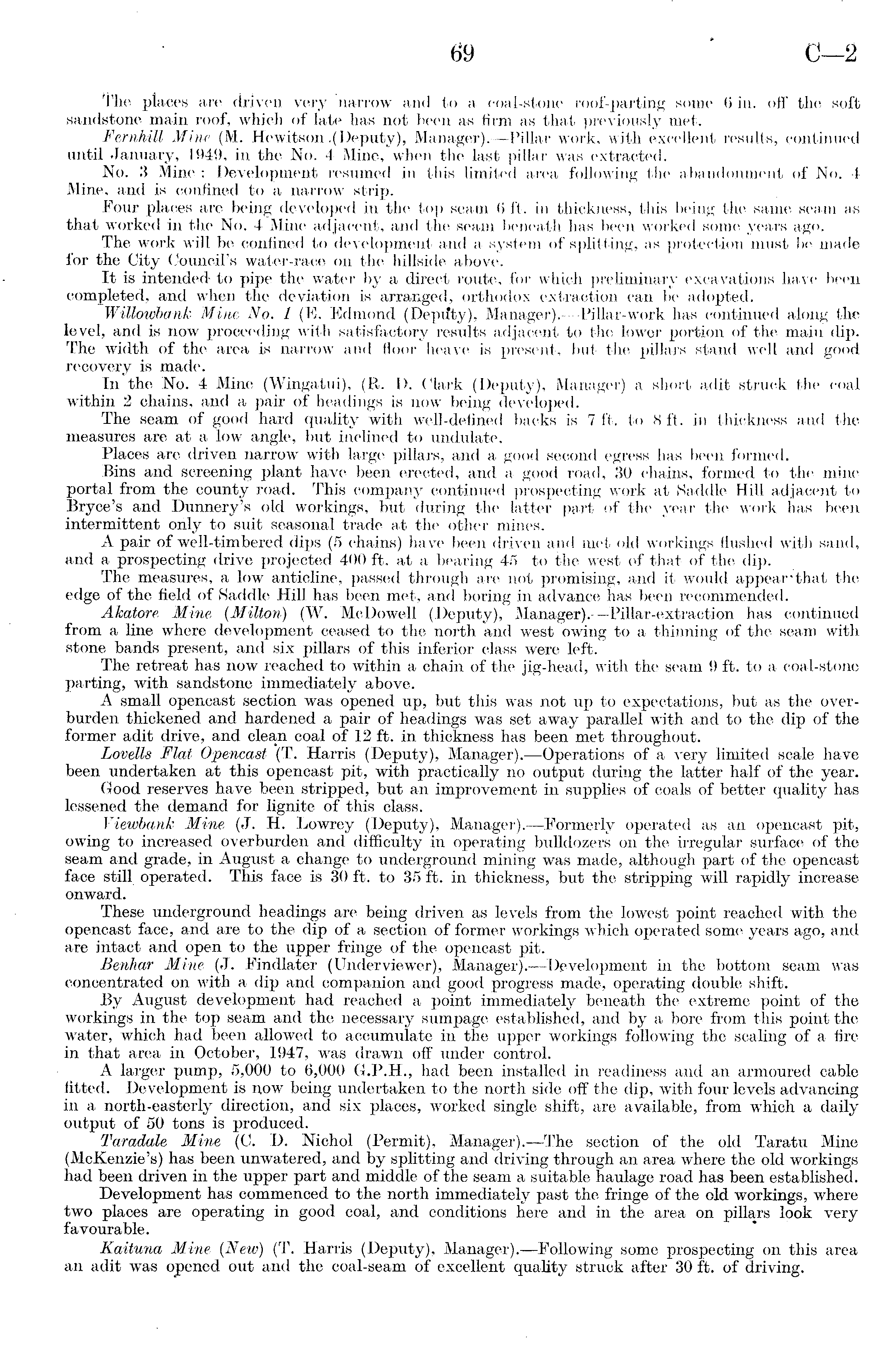 The places are driven very narrow and to a coal-stone roof-parting some 6 in. off the; .soft sandstone main roof, which of late has not been as firm as that previously met. Femhill Mine, (M. Hewitson .(Deputy), Manager).—Pillar work, with excellent results, continued until January, 1949, in the No. 4 Mine, when the last pillar was extracted. No. 3 Mine : Development resumed in this limited area following the abandonment of No. 4 Mine, and is confined to a narrow strip. Four places are being developed in the top seam b' ft. in thickness, this being the same seam as that worked in the No. 4 Mine adjacent, and the seam beneath has been worked some years ago. The work will be confined to development and a. system of splitting, as protection must be made for the City Council's water-race on the hillside above. It is intended- to pipe the water by a direct route, for which preliminary excavations have been completed, and when the deviation is arranged, orthodox extraction can be adopted. Willowbank Mine No. 1 (E. Edmond (Deprfty), Manager).—Pillar-work has continued along the level, and is now proceeding with satisfactory results adjacent to the lower portion of the main dip. The width of the area is narrow and floor heave is present, but the pillars stand well and good recovery is made. In the No. 4 Mine (Wingatui), (R. I). Clark (Deputy), Manager) a short adit struck the coal within 2 chains, and a pair of headings is now being developed. The seam of good hard quality with well-defined backs is 7 ft. to 8 ft. in thickness and the measures are at a low angle, but inclined to undulate. Places are driven narrow with large pillars, and a good second egress has been formed. Bins and screening plant have been erected, and a good road, 30 chains, formed to the mine portal from the county road. This company continued prospecting work at Saddle Hill adjacent to Bryce's and Dunnery's old workings, but during the latter part of the year the work has been intermittent only to suit seasonal trade at the other mines. A pair of well-timbered dips (5 chains) have been driven and met old workings flushed with sand, and a prospecting drive projected 400 ft. at a bearing 45° to the west of that of the dip. The measures, a low anticline, passed through are not promising, and it would appear-that the edge of the field of Saddle Hill has been met, and boring in advance has been recommended. Akatore Mine (Milton) (W. McDowell (Deputy), Manager).—Pillar-extraction has continued from a line where development ceased to the north and west owing to a thinning of the seam with stone bands present, and six pillars of this inferior class were left. The retreat has now reached to within a chain of the jig-head, with the seam 9 ft. to a coal-stone parting, with sandstone immediately above. A small opencast section was opened up, but this was not up to expectations, but as the overburden thickened and hardened a pair of headings was set away parallel with and to the dip of the former adit drive, and clean coal of 12 ft. in thickness has been met throughout. Lovells Flat Opencast (T. Harris (Deputy), Manager).—Operations of a very limited scale have been undertaken at this opencast pit, with practically no output during the latter half of the year. Good reserves have been stripped, but an improvement in supplies of coals of better quality has lessened the demand for lignite of this class. Viewbank Mine (J. H. Lowrey (Deputy), Manager).—Formerly operated as an opencast pit, owing to increased overburden and difficulty in operating bulldozers on the irregular surface of the seam and grade, in August a change to underground mining was made, although part of the opencast face still operated. This face is 30 ft. to 35 ft. in thickness, but the stripping will rapidly increase onward. These underground headings are being driven as levels from the lowest point reached with the opencast face, and are to the dip of a section of former workings which operated some years ago, and are intact and open to the upper fringe of the opencast pit. Benhar Mine (J. Findlater (Underviewer), Manager).—Development in the bottom seam was concentrated on with a dip and companion and good progress made, operating double shift. By August development had reached a point immediately beneath the extreme point of the workings in the top seam and the necessary sumpage established, and by a bore from this point the water, which had been allowed to accumulate in the upper workings following the scaling of a fire in that area in October, 1947, was drawn off under control. A larger pump, 5,000 to 6,000 G.P.H., had been installed in readiness and an armoured cable fitted. Development is now being undertaken to the north side off the dip, with four levels advancing in a north-easterly direction, and six places, worked single shift, are available, from which a daily output of 50 tons is produced. Taradale Mine (C. D. Nichol (Permit), Manager).—The section of the old Taratu Mine (McKenzie's) has been unwatered, and by splitting and driving through an area where the old workings had been driven in the upper part and middle of the seam a suitable haulage road has been established. Development has commenced to the north immediately past the fringe of the old workings, where two places are operating in good coal, and conditions here and in the area on pillars look very favourable. Kaituna Mine (New) (T. Harris (Deputy), Manager).—Following some prospecting on this area an adit was opened out and the coal-seam of excellent quality struck after 30 ft. of driving.