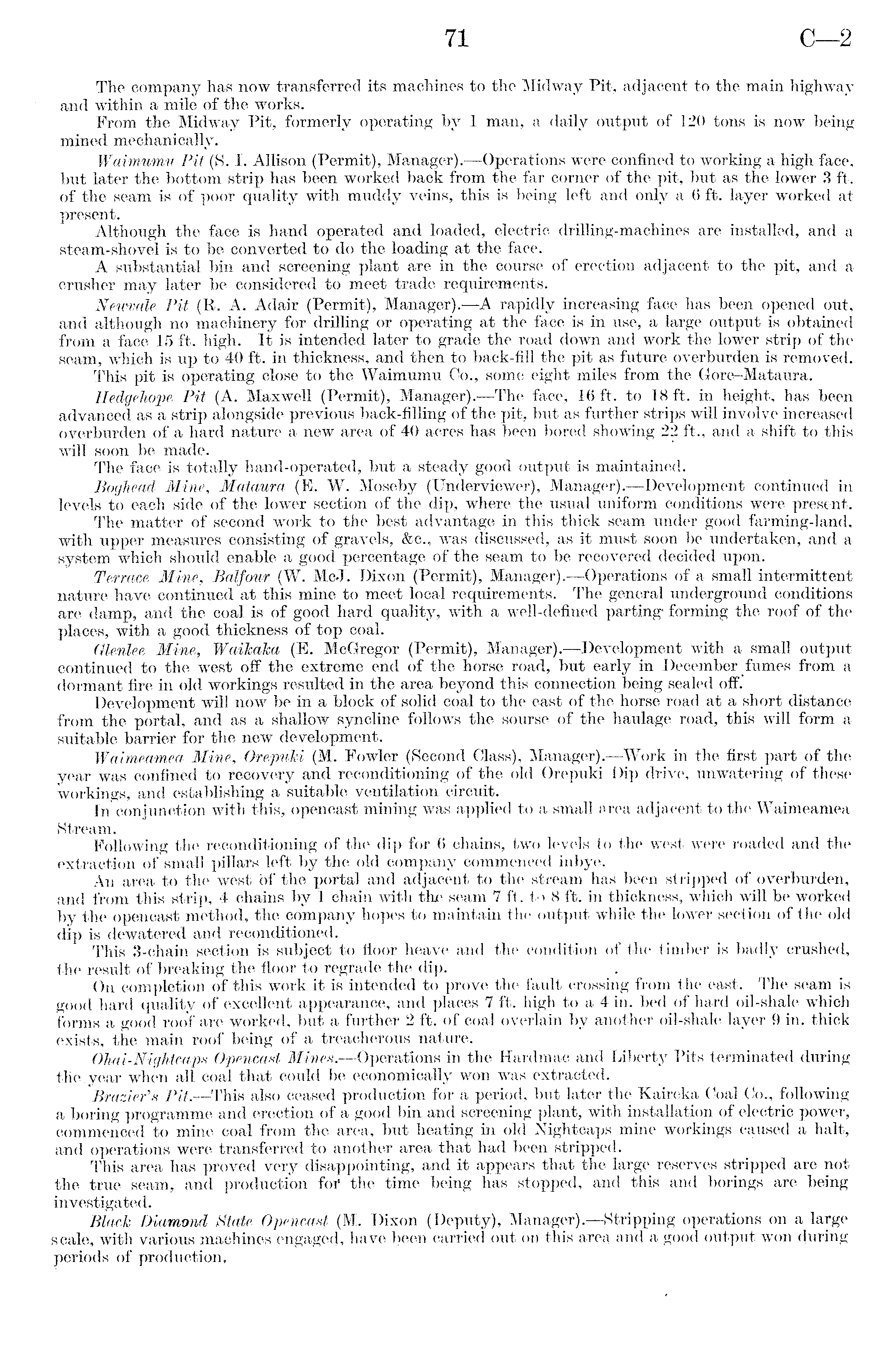 The company has now transferred its machines to the Midway Pit, adjacent to the main highway and within a mile of the works. From the Midway Pit, formerly operating by 1 man, a daily output of 120 tons is now being mined mechanically. Waimumu Pit (S. I. Allison (Permit), Manager).—Operations were confined to working a high face, but later the bottom strip has been worked back from the far corner of the pit, but as the lower 3 ft. of the seam is of poor quality with muddy veins, this is being left and only a 6 ft. layer worked at present. Although the face is hand operated and loaded, electric drilling-machines are installed, and a steam-shovel is to be converted to do the loading at the face. A substantial bin and screening plant are in the course, of erection adjacent to the pit, and a crusher may later be considered to meet trade requirements. Newvale Pit (R. A. Adair (Permit), Manager).—A rapidly increasing face has been opened out, and although no machinery for drilling or operating at the face is in use, a large output is obtained from a face 15 ft. high. It is intended later to grade the road down and work the lower strip of the seam, which is up to 40 ft. in thickness, and then to back-fill the pit as future overburden is removed. This pit is operating close to the Waimumu Co., some eight miles from the Gore-Mataura. Iledgehope Pit (A. Maxwell (Permit), Manager).—The face, 16 ft. to 18 ft. in height, has been advanced as a strip alongside previous back-filling of the pit, but as further strips will involve increased overburden of a hard nature a new area of 40 acres has been bored showing 22 ft., and a shift to this will soon be made. The face is totally hand-operated, but a steady good output is maintained. Boghead Mine, Mataura (E. W. Moseby (Underviewer), Manager).—Development continued in levels to each side of the lower section of the dip, where the usual uniform conditions were present. The matter of second work to the best advantage in this thick seam under good farming-land, with upper measures consisting of gravels, &c, was discussed, as it must soon be undertaken, and a system which should enable a good percentage of the seam to be recovered decided upon. Terrace Mine, Balfour (W. McJ. Dixon (Permit), Manager).—Operations of a small intermittent nature have continued at this mine to meet local requirements. The general underground conditions are damp, and the coal is of good hard quality, with a well-defined parting forming the roof of the places, with a good thickness of top coal. Glenlee Mine, Waikaka (E. McGregor (Permit), Manager).—Development with a small output continued to the west off the extreme end of the horse road, but early in December fumes from a dormant fire in old workings resulted in the area beyond this connection being sealed off. Development will now be in a block of solid coal to the east of the horse road at a short distance from the portal, and as a shallow syncline follows the sourse of the haulage road, this will form a suitable barrier for the new development. Waimeamea Mine, Ore.puki (M. Fowler (Second Class), Manager).—Work in the first part of the year was confined to recovery and reconditioning of the old Orepuki Dip drive, unwatering of these workings, and establishing a suitable ventilation circuit. Tn conjunction with this, opencast mining was applied to a small area adjacent to the Waimeamea Stream. Following the reconditioning of the dip for 6 chains, two levels to the west were roaded and the extraction of small pillars left by the old company commenced inbye. An area to the west of the portal and adjacent to the stream has been stripped of overburden, and from this strip, 4 chains by 1 chain with the seam 7 ft. to 8 ft. in thickness, which will be worked by the opencast method, the company hopes to maintain the output while the lower section of the old dip is dewatered and reconditioned. This 3-chain section is subject to floor heave and the condition of the timber is badly crushed, the result of breaking the floor to.regrade the dip. On completion of this work it is intended to prove the- fault crossing from the east. The seam is good hard quality of excellent appearance, and places 7 ft. high to a 4 in. bed of hard oil-shale which forms a good roof are worked, but a further 2 ft. of coal overlain by another oil-shale layer 9 in. thick exists, the main roof being of a treacherous nature. Ohai-Nightcaps Opencast Mines. —Operations in the Hardmac and Liberty Pits terminated during the.year when all coal that could be economically won was extracted. Brazier's Pit. —This also ceased production for a period, but later the Kaireka Coal Co., following a boring programme and erection of a good bin and screening plant, with installation of electric power, commenced to mine coal from the area, but heating in old Nightcaps mine workings caused a halt, and operations were transferred to another area that had been stripped. This area has proved very disappointing, and it appears that the large reserves stripped are not the true seam, and production for" the time being has stopped, and this and borings are being investigated. Black Diamond State Opencast (M. Dixon (Deputy), Manager).—Stripping operations on a large scale, witli various machines engaged, have been carried out on this area and a good output won (luring periods of production.