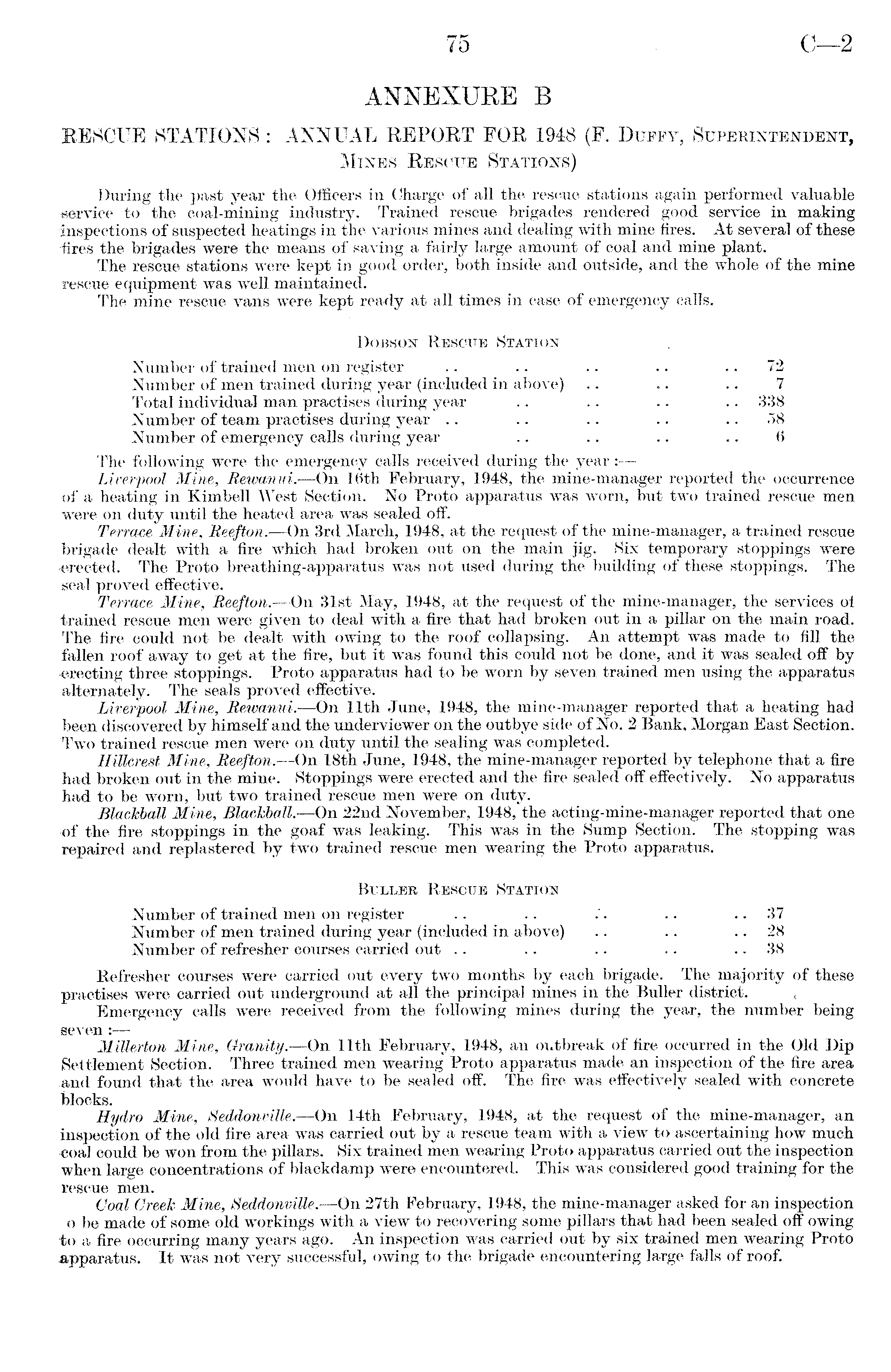 ANNEXUEE B RESCUE STATIONS : ANNUAL REPORT FOR 1948 (F. Duffy, Superintendent, Mines Rescue Stations) During the past year the Officers in Charge of all the rescue stations again performed valuable service to the coal-mining industry. Trained rescue brigades rendered good service in making inspections of suspected heatings in the various mines and dealing with mine fires. At several of these fires the brigades were the means of saving a fairly large amount of coal and mine plant. The rescue stations were kept in good order, both inside and outside, and the whole of the mine rescue equipment was well maintained. The mine rescue vans were kept ready at all times in case of emergency calls. Dobson Rescue Station Number of trained men on register .. .. .. .. 72 Number of men trained during year (included in above) .. .. .. 7 Total individual man practises during year .. .. .. .. 338 Number of team practises during year .. .. .. .. .. 58 Number of emergency calls during year .. .. .. .. (5 The following were the emergency calls received during the year : Liverpool Mine, Rewanui. —On 16th February, 1948, the mine-manager reported the occurrence of a heating in Kimbell West Section. No Proto apparatus was worn, but two trained rescue men were on duty until the heated area was sealed off. Terrace Mine, Reefton. —On 3rd March, 1948, at the request of the mine-manager, a trained rescue brigade dealt with a fire which had broken out on the main jig. Six temporary stoppings were ■erected. The Proto breathing-apparatus was not used during the building of these stoppings. The seal proved effective. Terrace Mine, Reefton. —On 31st May, 1948, at the request of the mine-manager, the services ol trained rescue men were given to deal with a fire that had broken out in a pillar on the main road. The fire could not be dealt with owing to the roof collapsing. An attempt was made to fill the fallen roof away to get at the fire, but it was found this could not be done, and it was sealed off by erecting three stoppings. Proto apparatus had to be worn by seven trained men using the apparatus alternately. The seals proved effective. Liverpool Mine, Rewanui. —On 11th June, 1948, the mine-manager reported that a heating had been discovered by himself and the underviewer on the outbye side of No. 2 Bank, Morgan East Section. Two trained rescue men were on duty until the sealing was completed. Hillcrest Mine, Reefton. —On 18th June, 1948, the mine-manager reported by telephone that a fire had broken oiit in the mine. Stoppings were erected and the fire sealed off effectively. No apparatus had to be worn, but two trained rescue men were on duty. Blackball Mine, Blackball.- —On 22nd November, 1948, the acting-mine-manager reported that one of the fire stoppings in the goaf was leaking. This was in the Sump Section. The stopping was repaired and replastered by two trained rescue men wearing the Proto apparatus. Buller Rescue Station Number of trained men on register .. .. .'. .. 37 Number of men trained during year (included in above) .. .. 28 Number of refresher courses carried out . . .. .. .. 38 Refresher courses were carried out every two months by each brigade. The majority of these practises were carried out underground at all the principal mines in the Buller district. , Emergency calls were received from the following mines during the year, the number being seven : Millerton Mine, Granity. —On 11th February, 1948, an outbreak of fire occurred in the Old Dip Settlement Section. Three trained men wearing Proto apparatus made an inspection of the fire area and found that the area would have to be sealed off. The fire was effectively sealed with concrete Blocks. Hydro Mine, Seddonville. —On 14th February, 1948, at the request of the mine-manager, an inspection of the old fire area was carried out by a rescue team with a view to ascertaining how much coal could be won from the pillars. Six trained men wearing Proto apparatus carried out the inspection when large concentrations of blackdamp were encountered. This was considered good training for the rescue men. Coal Creek Mine, Seddonville. —On 27th February, 1948, the mine-manager asked for an inspection o be made of some old workings with a view to recovering some pillars that had been sealed off owing to a fire occurring many years ago. An inspection was carried out by six trained men wearing Proto apparatus. It was not very successful, owing to the brigade encountering large falls of roof.