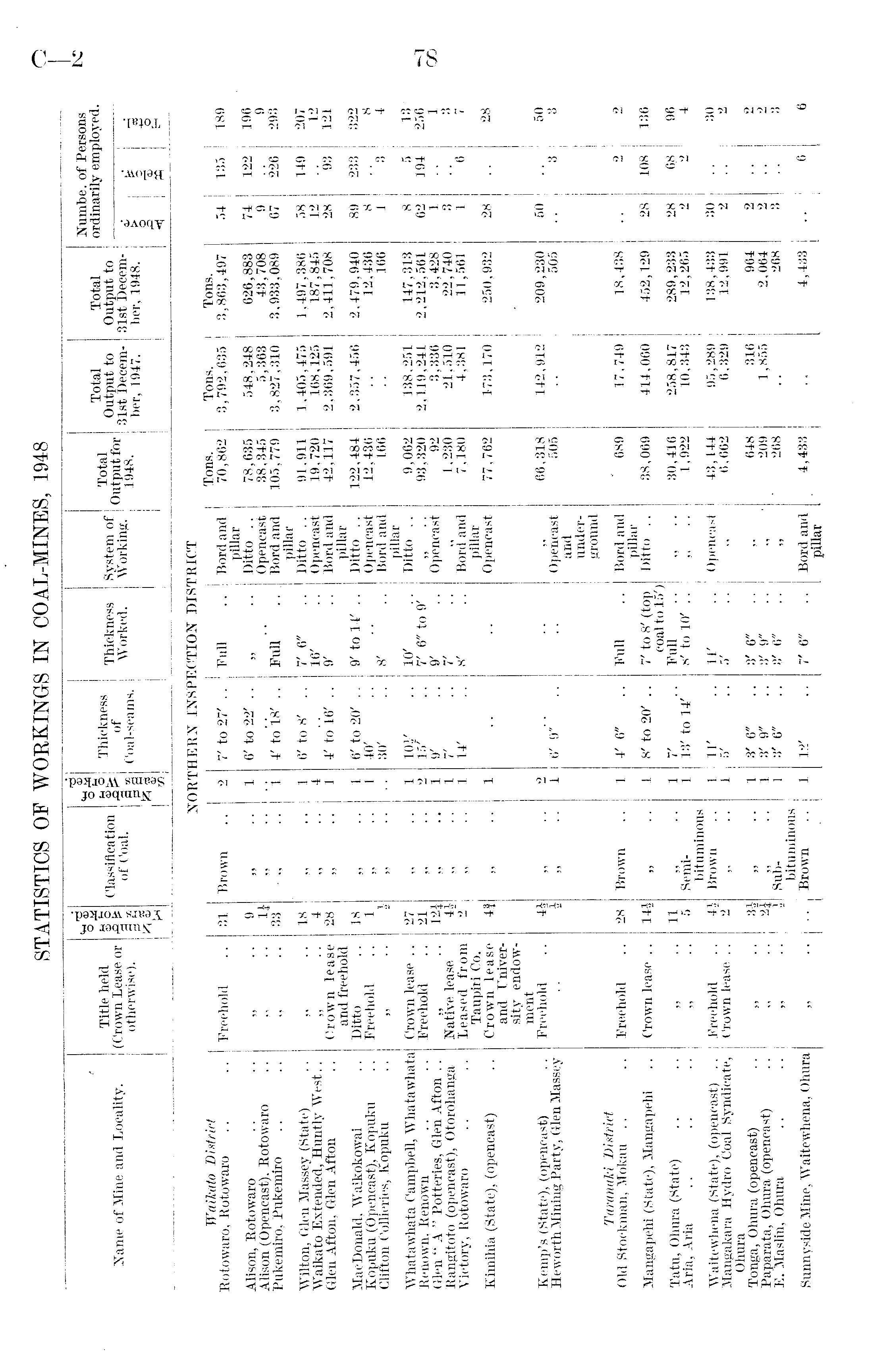 *S « eg H O Numbe. of Persons Title held (Crown Lease or otherwise). Classiflcation of Coal. Thickness of Coal-seams. Thickness Worked. System of Working. Total Output for 1948. Total Output to 31st December, 1947. Total Output to 31st December, 1948. ordinarily employed. Name of Mine and Locality. > o o i* < m Eh NORTHERN INSPECTION DISTRICT Waikato District Tons. Tons. Tons. Rotowaro, Rotowaro Ereehold 31 Brown 2 7' to 27' . . Full Bord and pillar Ditto .. 70,862 3,792,635 3,863,497 54 135 189 Alison, Rotowaro ... 9 1 6' to 22' . . 78,635 548,248 626,883 74 122 196 Alison (Opencast). Eotowaro li ,, Opencast 38,345 5,363 43,708 9 9 Pukemiro, Pukemiro !, 33 ■ „ i 4' to 18' .. Full " .. , Bord and pillar 105,779 3,827, 310 3,933,089 67 220 298 Wilton, Glen Massey (State) ,, 18 i 6' to 8' . . 7' 6" Ditto .. 91.911 1,405,475 1,497,386 58 149 207 Waikato Extended, Huntly West.. >> 4 )* • ■ 4 16' Opencast 19,720 168,125 187,845 12 12 Glen Afton, Glen Afton Crown lease and freehold 28 " 1 4' to 16' . . 9' Bord and pillar 42,117 2,369,591 2,411,708 28 93 121 MacDonald, Waikokowai Ditto 18 ,, , . 1 6' to 20' . . 9' to 14' . . Ditto .. 122,484 2,357,456 2,479,940 89 233 322 Kopuku (Opencast), Kopukn Clifton Collieries, Kopuku Freehold 1 ,, 1 40' Opencast 12,436 12,436 8 8 ,, . . } ,, 80' 8' Bord and 166 166 J 3 4 pillar Whatawhata Campbell, Whatawhata Crown lease .. 27 • ■ 1 10*' 10' Ditto .. 9,062 138,251 147,313 8 5 13 Renown, Renown. Ereehold 21 2 IB' 7' 6" to 9' ,, 93,320 2,119,241 2,212,561 62 194 256 Glen " A " Potteries, Glen Afton . . m j) 1 9' 9' Opencast 92 3,336 3,428 1 1 Kangitoto (opencast), Otorohanga Native lease 4* ,, .. 1 7' 7' , . ,, 1,230 21,510 22,740 3 3 Victory, Kotowaro Leased from Taupiri Co. 2 " 1 14' 8' Bord and pillar 7,180 4,381 11,561 1 6 Kimihia (State), (opencast) Crown lease and Fniversity endowment 4f " 1 Opencast 77,762 173,170 250,932 28 28 Kemp's (State), (opencast) Freehold 4* ,, .. 2 ,, 66,318 142,912 209,230 50 * * ~ 50 Heworth Mining Party, Glen Massey \ » 1 6' 9"' ' . . Opencast and under505 505 3 3 ground Taranahi District Old Stockman, Mokau .. Freehold 28 Brown 1 4' 6" Full Bord and pillar Ditto . . 689 17,749 18,438 2 o Mangapehi (State), Mangapehi Crown lease .. 14* „ 1 8' to 20' . . 7' to 8' (top 38,069 414,000 452,129 28 108 136 coal to 15') Tatu, Ohura (State) ,, 11 ,, .. 1 7' Full ., 30,416 258,817 289,233 28 68 96 Aria, Aria " 5 Semibituminous 1 13' to 14'' ' 8' to 10' . . " 1,922 10,343 12,265 2 L 4 Waitewhena (State), (opencast) .. Freehold 41 Brown 1 IT 11' Opencast 43,144 95,289 138,433 80 30 Mangakara Hydro Coal Syndicate, Ohura Tonga, Ohura (opencast) Crown lease .. 2 » 1 5' 5' " 6,662 6,329 12,991 2 " 3* „ 1 3' 6" 3' 6" ,, 648 316 964 2 2 Paparata, Ohura (opencast) ,, , . 2i ,, 1 3' 9" 3' 9" ,, 209 1,855 2,064 2 - E. Maslin, Ohura " Subbituminous 1 :;' 6" 8' 6" " 268 268 3 "' Sunnyside Mine, "Waitewhena, Ohura " Brown 1 12' 7' 6" Bord and pillar 4,433 4,433 1 " 6 6