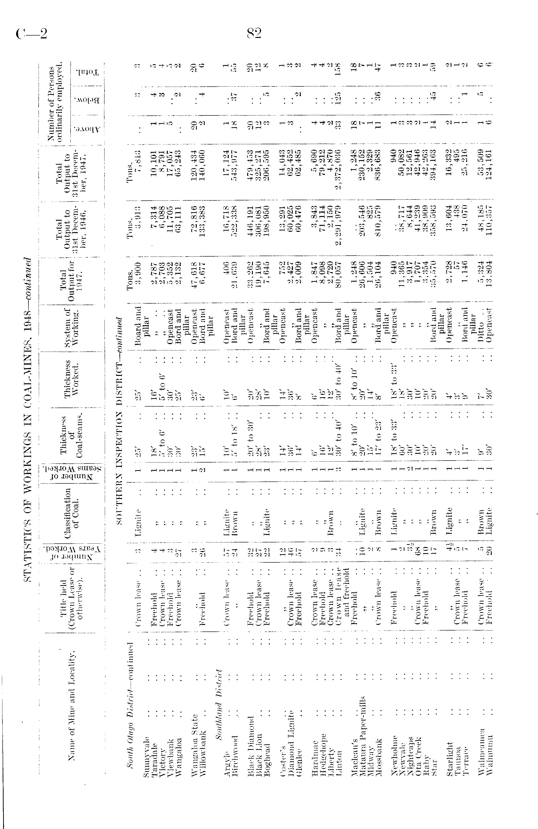 Name of Mine and Locality. Title held (Crown Lease or otherwise). Number of Years Worked. Classification of Coal. Number of Seams Worked. Thickness of Coal-seams. Thickness Worked. System of Working. Total Output for 1947. Total Output to 31st December, 1946. Total Output to 31st December, 1947. Number of Persons ordinarily employed. Above. 1 Below. 1 j Total. SOUTHERN INSPECTION DISTRICT —continued South Otago District —continued Tons. Tons. Tons. Crown lease .. 3 Lignite 1 25' 25' Board and 3,900 3,913 7,813 3 3 Sunnyvale pillar Taradale Freehold 4 99 1 18' 16' u 2,787 7,314 10,101 i 4 5 Victory Crown lease .. 4 99 1 5' to 6' 5' to 6' 91 • • 2,703 6,088 8,791 i 3 4 Viewbank Freehold 3 1 30' 30' Opencast 5,352 11,705 17,057 5 5 Wangaloa Crown lease .. 27 ii 1 30' 25' Bord and 2,132 63,111 65,243 "2 2 pillar Wangaloa State >> 3 1 23' 23' Opencast 47,618 72,816 120,434 20 20 Willowbank Freehold 26 2 15' 6' Bord and 6,677 133,383 140,060 2 ' '4 6 pillar Southland District Argyle Crown lease .. 57 Lignite 1 10' 10' Opencast 406 16,718 17,124 1 1 Birchwood >> 24 Brown 1 5' to 18' .. 6' Bord and 21,639 522,338 543,977 18 37 55 pillar 20 Black Diamond Freehold 32 ,, 1 20' to 30' 20' Opencast 33,262 446,191 479,453 20 Black Lion Crown lease .. 27 Lignite 1 28' 28' 19,190 306,081 325,271 12 12 Boghead Freehold 22 1 23' 10' Bord and 7,645 198,950 206,595 3 5 8 pillar Coster's si • • 12 99 1 14' 14' Opencast 752 13,291 14,043 1 1 Diamond Lignite Crown lease .. 46 if 1 36' 36' 2,427 60,025 62,452 3 3 Glenlee Freehold 57 99 1 14' 8' Bord and 2,009 60,476 62,485 ' *2 2 BTardmac Crown lease .. 2 1 6' 6' pillar Opencast 1,847 3,843 5,690 4 4 Hedgehope Freehold 9 fi • • 1 16' 16' 8,098 71,114 79,212 4 4 Liberty Crown lease .. 3 Brown 1 12' 12' 2,720 2,150 4,870 2 2 Linton Crown lease 34 3 30' to 40' 30' to 40' Bord and 80,057 2,291,979 2,372,036 33 1.25 158 and freehold pillar Maclean's Freehold a • • 1 8' to 10' .. 8' to 10' . . Opencast 1,248 1,248 18 18 Mataura Paper-mills io ' Lignite 1 20' 20' 26,606 203,546 230,152 7 7 Midway » 2 Brown 1 15' 14' Bord and 1,504 825 2,329 1 1 Mossbank Crown .. 8 1 17' to 23' 8' 26,104 810,579 836,683 11 '36 47 pillar Newholme Freehold 1 Lignite 1 18' to 33' 18' to 33' Opencast 940 940 1 1 New vale >> 2 lt ;, 1 60' 18' 11,365 38,717 50,082 3 3 Nightcaps 3i 2 30' 30' ." 3,917 8,644 12,561 3 3 Ota Creek Crown lease .. 68" 1 10' 10' 1,707 41,239 42,946 2 2 Raby Freehold 10 ' 1 20' 20' 3,354 38,909 42,263 1 1 Star „ 17 Brown 1 20' 20' Bord and 35,570 358,593 394,163 14 '45 59 Starlight fi Lignite 1 4' 4' pillar Opencast 2,728 13,604 16,332 2 2 Taunoa Crown lease .. 1 3' 3' Bord and 57 438 495 1 1 Terrace Freehold 7 1 17' 9' 1,146 24,070 25,216 1 ' 'l 0 pillar Waimeamea Crown lease .. 5 Brown 1 9' 7' Ditto .. 5,324 48,185 53,509 1 5 6 Waimumu Freehold ' ,. 20 Lignite 1 30' 30' Opencast 13,804 110,357 124,161 6 6