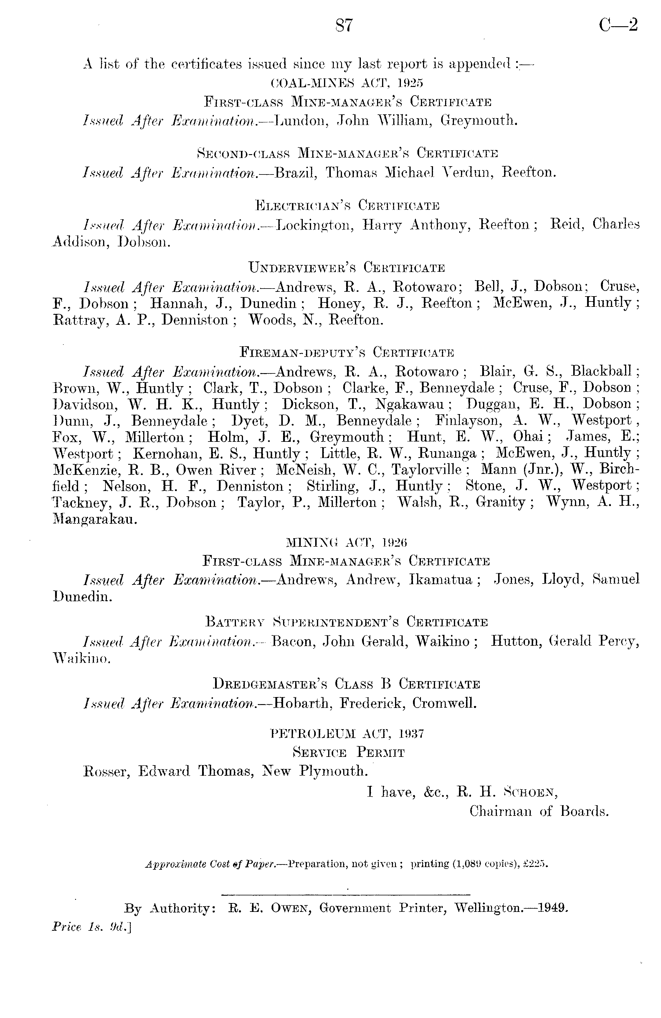 A list of the certificates issued since my last report is appended :j COAL-MINES ACT, 1925 First-class Mine-manager's Certificate Issued After Examination. —Lundon, John William, Greymouth. Second-class Mine-manager's Certificate Issued After Examination.—Brazil, Thomas Michael Verdun, Reefton. Electrician's Certificate Issued After Examination.—Lockington, Harry Anthony, Reefton; Reid, Charles Addison, Dobson. Underviewer's Certificate Issued After Examination.—Andrews, R. A., Rotowaro; Bell, J., Dobson; Cruse, F., Dobson ; Hannah, J., Dunedin ; Honey, R. J., Reefton ; McEwen, J., Huntly; Rattray, A. P., Denniston; Woods, N., Reefton. Fireman-deputy's Certificate Issued After Examination.—Andrews, R. A., Rotowaro ; Blair, G. S., Blackball; Brown, W., Huntly ; Clark, T., Dobson ; Clarke, F., Benneydale ; Cruse, F., Dobson ; Davidson, W. H. K., Huntly; Dickson, T., Ngakawau; Duggan, E. H., Dobson ; Dunn, J., Benneydale; Dyet, D. M., Benneydale; Finlayson, A. W., Westport, Fox, W., Millerton; Holm, J. E., Greymouth; Hunt, E. W., Ohai; James, E.; Westport; Kernohan, E. S., Huntly ; Little, R. W., Runanga ; McEwen, J., Huntly ; McKenzie, R. 8., Owen River; McNeish, W. C., Taylorville ; Mann (Jnr.), W., Birchfield ; Nelson, H. F., Denniston; Stirling, J., Huntly; Stone, J. W., Westport; Tackney, J. R., Dobson ; Taylor, P., Millerton ; Walsh, R., Granity ; Wynn, A. H., Mangarakau. MINING ACT, 1926 First-class Mine-manager's Certificate Issued After Examination.—Andrews, Andrew, Ikamatua ; Jones, Lloyd, Samuel Dunedin. Battery Superintendent's Certificate Issued After Examination. —Bacon, John Gerald, Waikino ; Hutton, Gerald Percy, Waikino. Dredgemaster's Class B Certificate Issued After Examination.—Hobarth, Frederick, Cromwell. PETROLEUM ACT, 1937 Service Permit Rosser, Edward Thomas, New Plymouth. I have, &c., R. H. Schoen, Chairman of Boards.