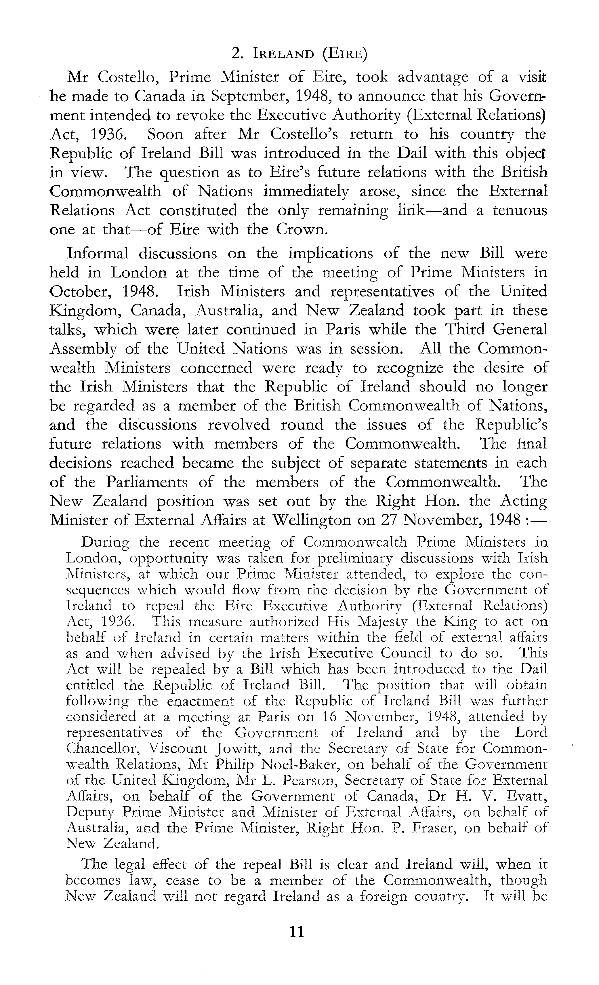 2. Ireland (Eire) Mr Costello, Prime Minister of Eire, took advantage of a visit he made to Canada in September, 1948, to announce that, his Government intended to revoke the Executive Authority (External Relations) Act, 1936. Soon after Mr Costello's return to his country the Republic of Ireland Bill was introduced in the Dail with this object in view. The question as to Eire's future relations with the British Commonwealth of Nations immediately arose, since the External Relations Act constituted the only remaining link—and a tenuous one at that—of Eire with the Crown. Informal discussions on the implications of the new Bill were held in London at the time of the meeting of Prime Ministers in October, 1948. Irish Ministers and representatives of the United Kingdom, Canada, Australia, and New Zealand took part in these talks, which were later continued in Paris while the Third General Assembly of the United Nations was in session. All the Commonwealth Ministers concerned were ready to recognize the desire of the Irish Ministers that the Republic of Ireland should no longer be regarded as a member of the British Commonwealth of Nations, and the discussions revolved round the issues of the Republic's future relations with members of the Commonwealth. The final decisions reached became the subject of separate statements in each of the Parliaments of the members of the Commonwealth. The New Zealand position was set out by the Right Hon. the Acting Minister of External Affairs at Wellington on 27 November, 1948 During the recent meeting of Commonwealth Prime Ministers in London, opportunity was taken for preliminary discussions with Irish Ministers, at which our Prime Minister attended, to explore the consequences which would flow from the decision by the Government of Ireland to repeal the Eire Executive Authority (External Relations) Act, 1936. This measure authorized His Majesty the King to act on behalf of Ireland in certain matters within the field of external affairs as and when advised by the Irish Executive Council to do so. This Act will be repealed by a Bill which has been introduced to the Dail entitled the Republic of Ireland Bill. The position that will obtain following the enactment of the Republic of Ireland Bill was further considered at a meeting at Paris on 16 November, 1948, attended by representatives of the Government of Ireland and by the Lord Chancellor, Viscount Jowitt, and the Secretary of State for Commonwealth Relations, Mr Philip Noel-Baker, on behalf of the Government of the United Kingdom, Mr L. Pearson, Secretary of State for External Affairs, on behalf of the Government of Canada, Dr H. V. Evatt, Deputy Prime Minister and Minister of External Affairs,' on behalf of Australia, and the Prime Minister, Right Hon. P. Fraser, on behalf of New Zealand. The legal effect of the repeal Bill is clear and Ireland will, when it becomes law, cease to be a member of the Commonwealth, though New Zealand will not regard Ireland as a foreign country. It will be