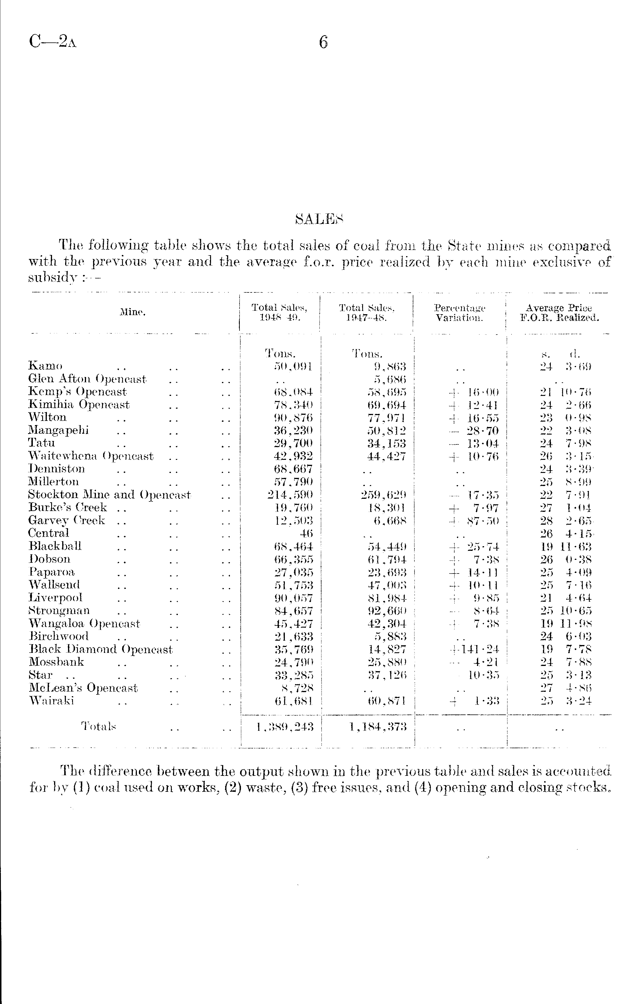 SALES The following table shows the total sales of coal from the State mines as compared with the previous year and the average' f.o.r. price realized by each mine exclusive of subsidy :