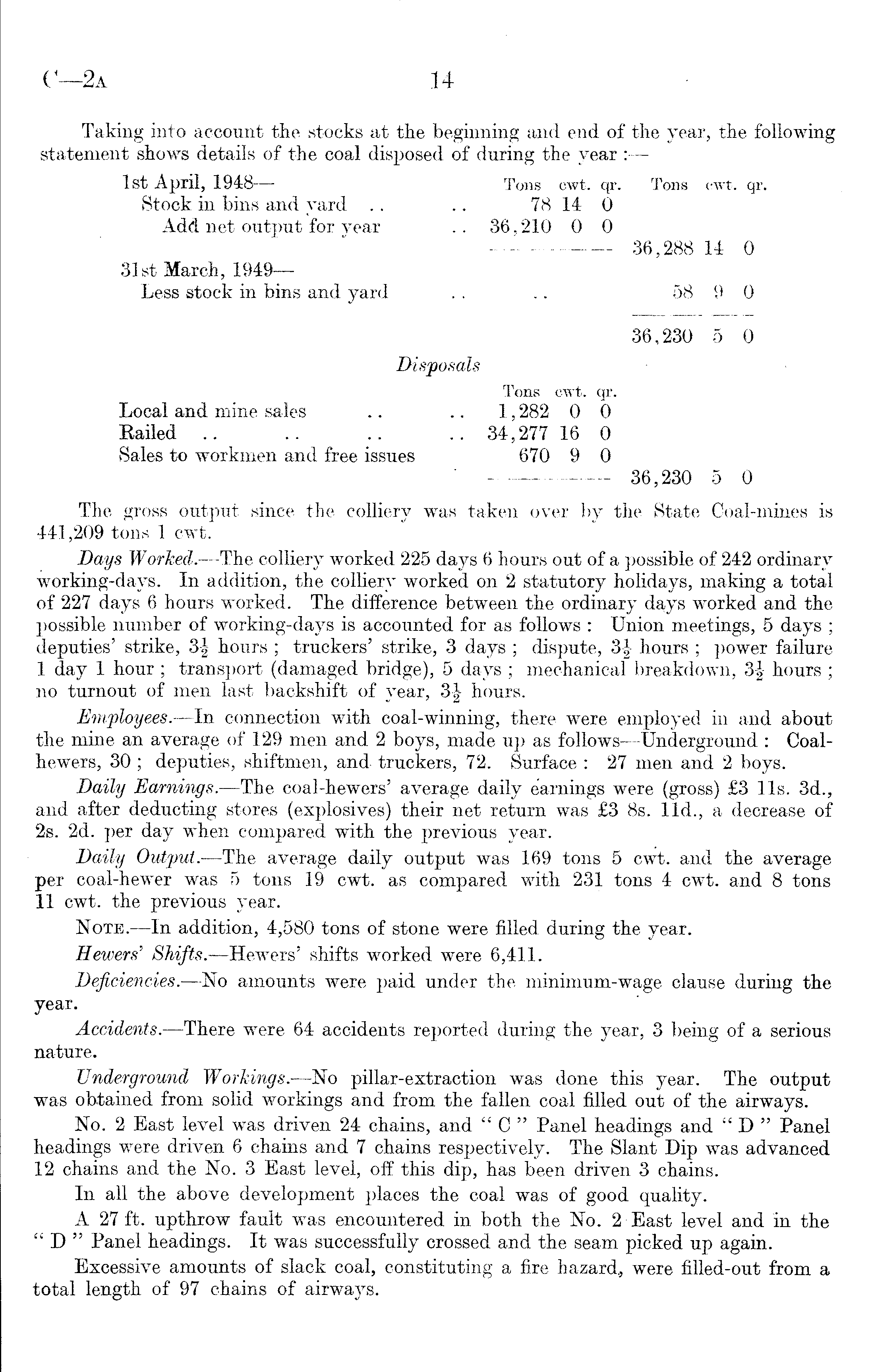 Taking into account the stocks at the beginning and end of the year, the following statement shows details of the coal disposed of during the year : Ist April, 1948 —- Tons cwt. qr. Tons cwt. qr. Stock in bins and yard .. .. 78 14 0 Add net output for year .. 36,210 0 0 36,288 14 0 31st March, 1949 Less stock in bins and yard .. .. 58 9 0 36,230 5 0 Disposals Tons cwt. qr. Local and mine sales .. .. 1,282 0 0 Bailed .. .. .. .. 34,277 16 0 Bales to workmen and free issues 670 9 0 ' 36,230 5 0 The gross output since the colliery was taken over by the State Coal-mines is 441,209 tons 1 cwt. Bays Worked. —The colliery worked 225 days 6 hours out of a possible of 242 ordinary working-days. In addition, the colliery worked on 2 statutory holidays, making a total of 227 days 6 hours worked. The difference between the ordinary days worked and the possible number of working-days is accounted for as follows : Union meetings, 5 days ; deputies' strike, 3| hours ; truckers' strike, 3 days ; dispute, 3| : hours ; power failure I day 1 hour ; transport (damaged bridge), 5 days ; mechanical breakdown, 3| hours ; no turnout of men last backshift of year, hours. Employees. —In connection with coal-winning, there were employed in and about the mine an average of 129 men and 2 boys, made up as follows —Underground : Coalhewers, 30 ; deputies, shiftmen, and truckers, 72. Surface : 27 men and 2 boys. Daily Earnings.—The coal-hewers' average daily earnings were (gross) £3 lis. 3d., and after deducting stores (explosives) their net return was £3 Bs. lid., a decrease of 2s. 2d. per day when compared with the previous year. Daily Output. —The average daily output was 169 tons 5 cwt. and the average per coal-hewer was 5 tons 19 cwt. as compared with 231 tons 4 cwt. and 8 tons II cwt. the previous year. Note. —In addition, 4,580 tons of stone were filled during the year. Hewers' Shifts. —Hewers' shifts worked were 6,411. Deficiencies. —No amounts were paid under the minimum-wage clause during the year. Accidents. —There were 64 accidents reported during the year, 3 being of a serious nature. Underground Workings.—No pillar-extraction was done this year. The output was obtained from solid workings and from the fallen coal filled out of the airways. No. 2 East level was driven 24 chains, and " C " Panel headings and " D " Panel headings were driven 6 chains and 7 chains respectively. The Slant Dip was advanced 12 chains and the No. 3 East level, off this dip, has been driven 3 chains. In all the above development places the coal was of good quality. A 27 ft. upthrow fault was encountered in both the No. 2 East level and in the "D " Panel headings. It was successfully crossed and the seam picked up again. Excessive amounts of slack coal, constituting a fire hazard., were filled-out from a total length of 97 chains of airways.