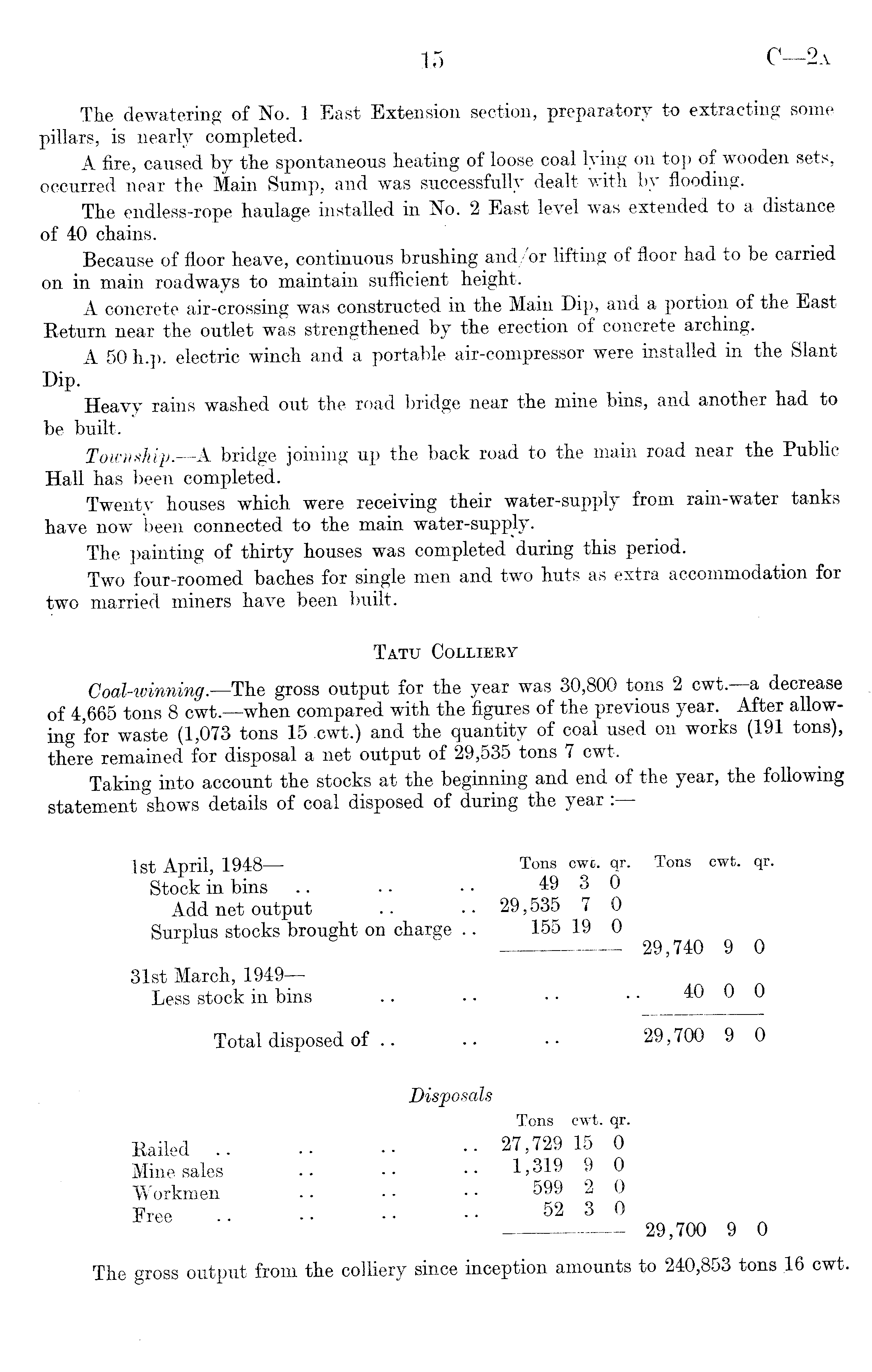 The dewatering of No. 1 East Extension section, preparatory to extracting some pillars, is nearly completed. A fire, caused by the spontaneous heating of loose coal lying on top of wooden sets, occurred near the Main Sump, and was successfully dealt with by flooding. The endless-rope haulage installed in No. 2 East level was extended to a distance of 40 chains. Because of floor heave, continuous brushing and/or lifting of floor had to be carried on in main roadways to maintain sufficient height. A concrete air-crossing was constructed in the Main Dip, and a portion of the East Return near the outlet was strengthened by the erection of concrete arching. A 50 h.p. electric winch and a portable air-compressor were installed in the Slant Dip. Heavy rains washed out the road bridge near the mine bins, and another had to be built. Totvnshi]). —A bridge joining up the back road to the main road near the Public Hall has been completed. Twenty houses which were receiving their water-supply from rain-water tanks have now been connected to the main water-supply. The painting of thirty houses was completed during this period. Two four-roomed baches for single men and two huts as extra accommodation for two married miners have been built. Tatu Colliery Coal-winning. —The gross output for the year was 30,800 tons 2 cwt. a decrease of 4,665 tons 8 cwt. —when compared with the figures of the previous year. After allowing for waste (1,073 tons 15 .cwt.) and the quantity of coal used on works (191 tons), there remained for disposal a net output of 29,535 tons 7 cwt. Taking into account the stocks at the beginning and end of the year, the following statement shows details of coal disposed of during the year Ist April, 1948 — Tons cwfc. qr. Tons cwt. qr. Stock in bins .. • • • • 49 3 0 Add net output .. .. 29,535 7 0 Surplus stocks brought on charge .. 155 19 0 * 29,740 9 0 31st March, 1949 — Less stock in bins .. • • • • • • 40 0 0 Total disposed of .. .. •• 29,700 9 0 Disposals Tons cwt. qr. Railed •• 27,729 15 0 Mine sales •• -• •• 1,319 9 0 Workmen .. • • • • 599 2 0 Free -• •• •• 52 3 0 29,700 9 0 The gross output from the colliery since inception amounts to 240,853 tons .16 cwt