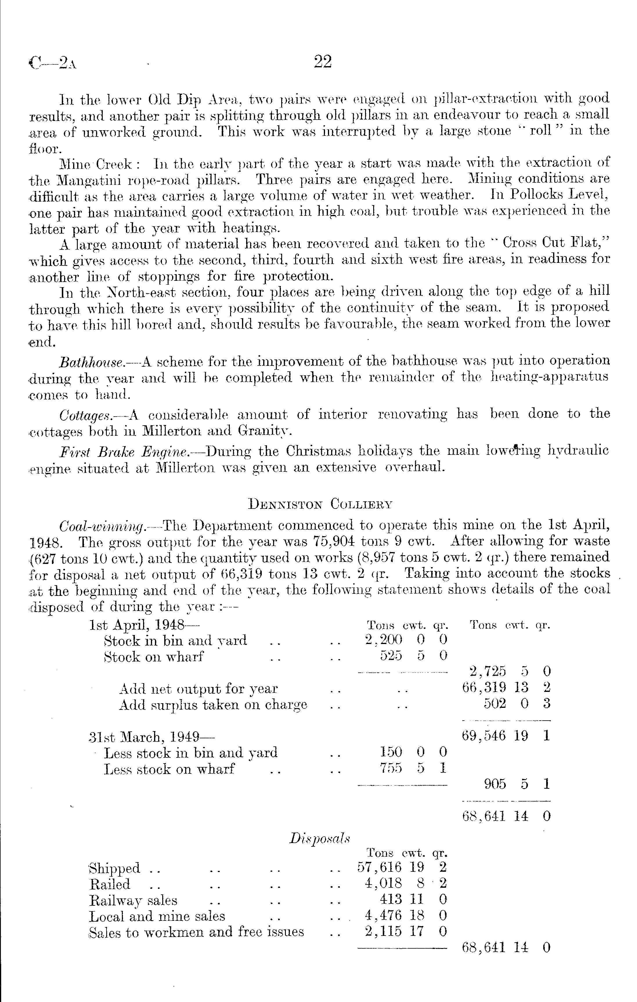 In the lower Old Dip Area, two pairs were engaged on pillar-extraction with, good results, and another pair is splitting through old pillars in an endeavour to reach a small area of unworked ground. This work was interrupted by a large stone " roll" in the floor. Mine Creek : In the early part of the year a start was made with the extraction of the Mangatini rope-road pillars. Three pairs are engaged here. Mining conditions are difficult as the area carries a large volume of water in wet weather. In Pollocks Level, ■one pair has maintained good extraction in high coal, but trouble was experienced in the latter part of the year with heatings. A large amount of material has been recovered and taken to the " Cross Cut Flat," which gives access to the second, third, fourth and sixth west fire areas, in readiness for another line of stoppings for fire protection. In the North-east section, four places are being driven along the t(3p edge of a hill through which there is every possibility of the continuity of the seam. It is proposed to have this hill bored and, should results be favourable, the seam worked from the lower •end. Bathhouse. —A scheme for the improvement of the bathhouse was put into operation during the year and will be completed when the remainder of the heating-apparatus comes to hand. Cottages.—A considerable amount of interior renovating has been done to the •cottages both in Millerton and Granity. First Brake Engine.—During the Christmas holidays the main lowering hydraulic •engine situated at Millerton was given an extensive overhaul. Denniston Colliery Coal-winning.—The Department commenced to operate this mine on the Ist April, 1948. The gross output for the year was 75,904 tons 9 cwt. After allowing for waste {627 tons 10 cwt.) and the quantity used on works (8,957 tons 5 cwt. 2 qr.) there remained for disposal a net output of 66,319 tons 13 cwt. 2 qr. Taking into account the stocks &t the beginning and end of the year, the following statement shows details of the coal disposed of during the year : Ist April, 1948 — Tons cwt. qr. Tons cwt. qr. Stock in bin and yard .. .. 2,200 0 0 Stock on wharf .. .. 525 5 0 2,725 5 0 Add net output for year .. .. 66,319 13 2 Add surplus taken on charge .. .. 502 0 3 31st March, 1949 69,546 19 1 Less stock in bin and yard .. 150 0 0 Less stock on wharf .. .. 755 5 1 905 5 1 68,641 14 0 Disposals Tons cwt. qr. Shipped .. .. .. .. 57,616 19 2 Railed .. .. .. .. 4,018 8• 2 Railway sales .. .. .. 413 11 0 Local and mine sales .. ... 4,476 18 0 Sales to workmen and free issues .. 2,115 17 0 • 68,641 14 0