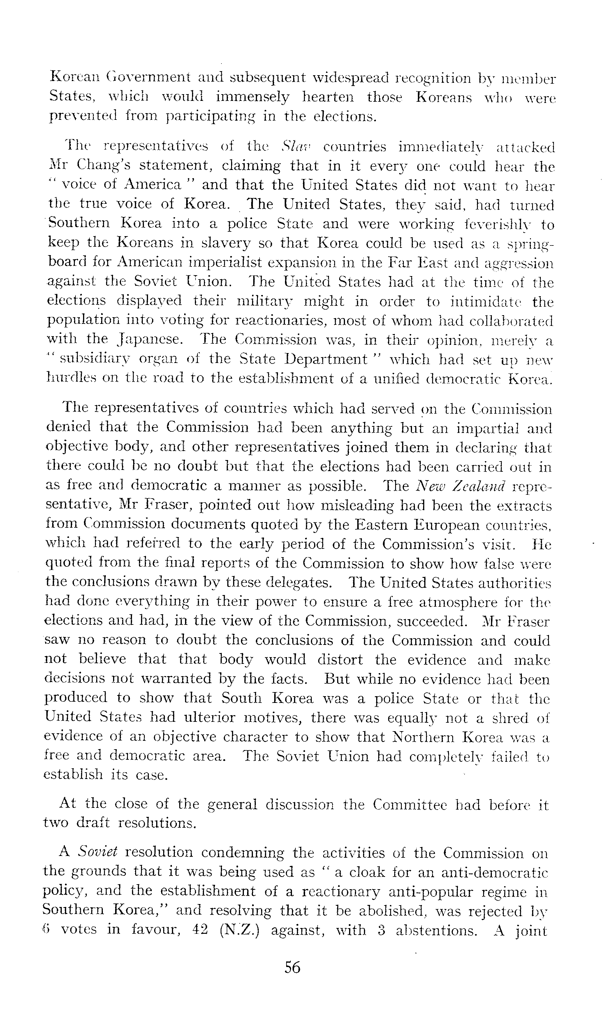Korean Government and subsequent widespread recognition by member States, which would immensely hearten those Koreans who were prevented from participating in the elections. The representatives of the Slav countries immediately attacked Mr Chang's statement, claiming that in it every one could hear the " voice of America " and that the United States did not want to hear the true voice of Korea. The United States, they said, had turned Southern Korea into a police State and were working feverishly to keep the Koreans in slavery so that Korea could be used as a springboard for American imperialist expansion in the Far East and aggression against the Soviet Union. The United States had at the time of the elections displayed their military might in order to intimidate the population into voting for reactionaries, most of whom had collaborated with the Japanese. The Commission was, in their opinion, merely a " subsidiary organ of the State Department " which had set up new hurdles on the road* to the establishment of a unified democratic Korea. The representatives of countries which had served on the Commission denied that the Commission had been anything but an impartial and objective body, and other representatives joined them in declaring that there could be no doubt but that the elections had been carried out in as free and democratic a manner as possible. The New Zealand representative, Mr Fraser, pointed out how misleading had been the extracts from Commission documents quoted by the Eastern European countries, which had referred to the early period of the Commission's visit. He quoted from the final reports of the Commission to show how false were the conclusions drawn by these delegates. The United States authorities had done everything in their power to ensure a free atmosphere for the elections and had, in the view of the Commission, succeeded. Mr Fraser saw no reason to doubt the conclusions of the Commission and could not believe that that body would distort the evidence and make decisions not warranted by the facts. But while no evidence had been produced to show that South Korea was a police State or that the United States had ulterior motives, there was equally not a shred of evidence of an objective character to show that Northern Korea was a free and democratic area. The Soviet Union had completely failed to establish its case. At the close of the general discussion the Committee had before it tWo draft resolutions. A Soviet resolution condemning the activities of the Commission on the grounds that it was being used as " a cloak for an anti-democratic policj', and the establishment of a reactionary anti-popular regime in Southern Korea," and resolving that it be abolished, was rejected by 6 votes in favour, 42 (N.'Z.) against, with 3 abstentions. A joint